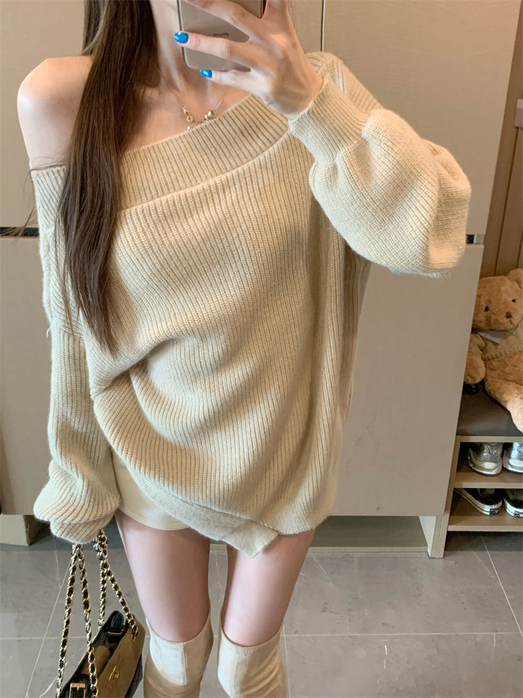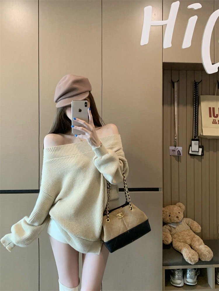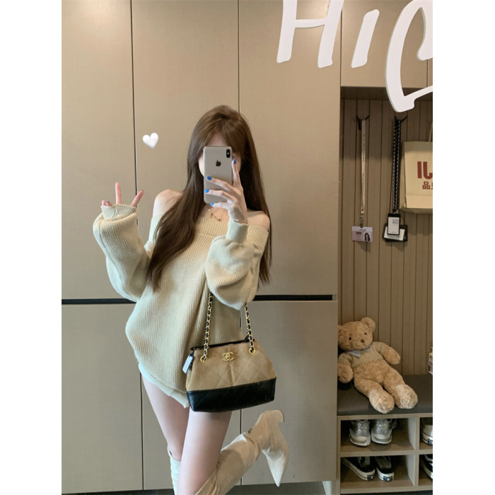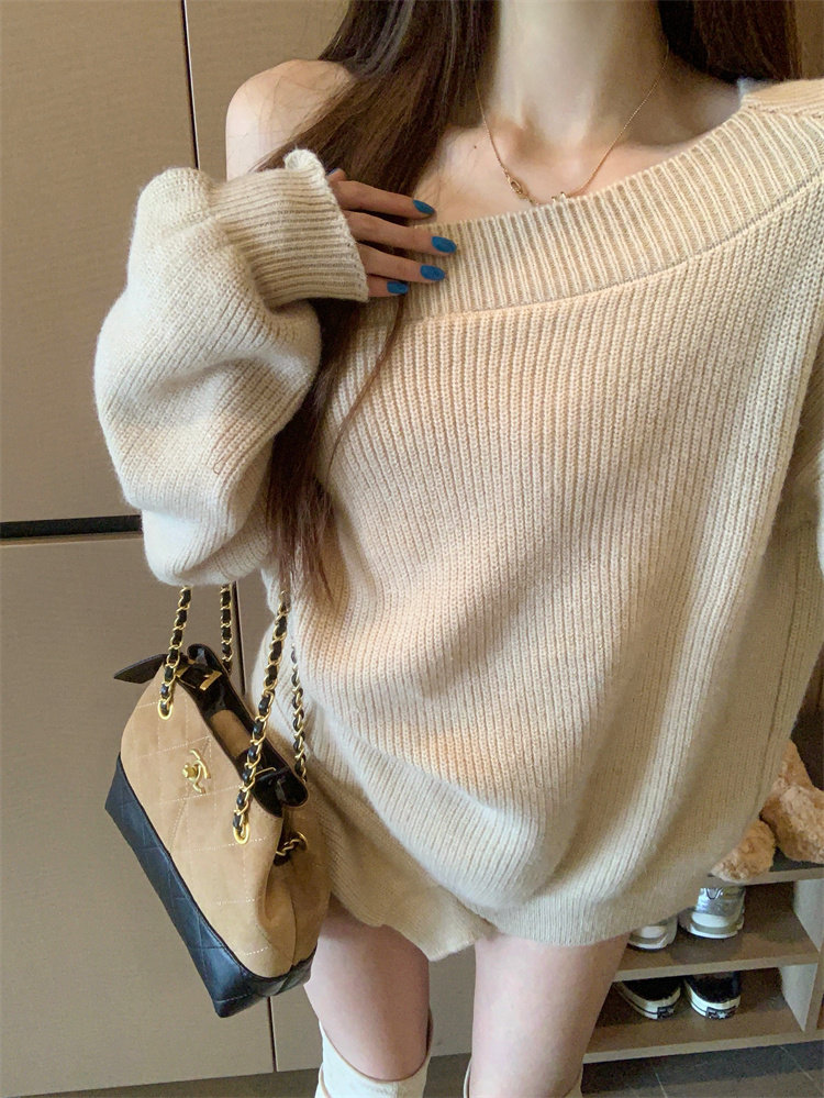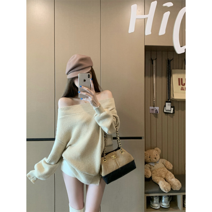 kumikumi純欲風性感氣質一字肩長袖毛衣女裝秋冬寬鬆百搭休閒上衣