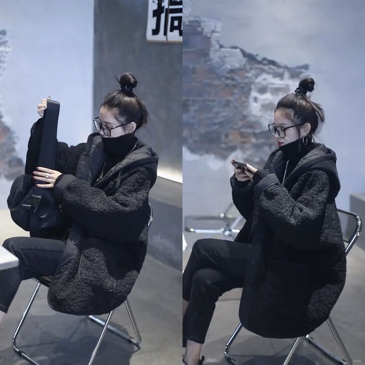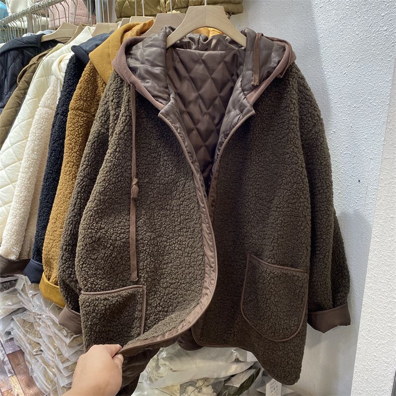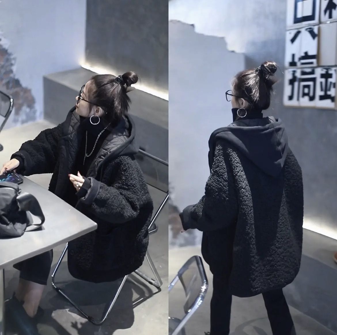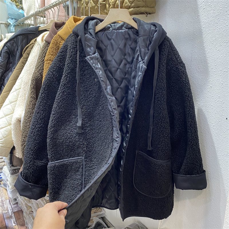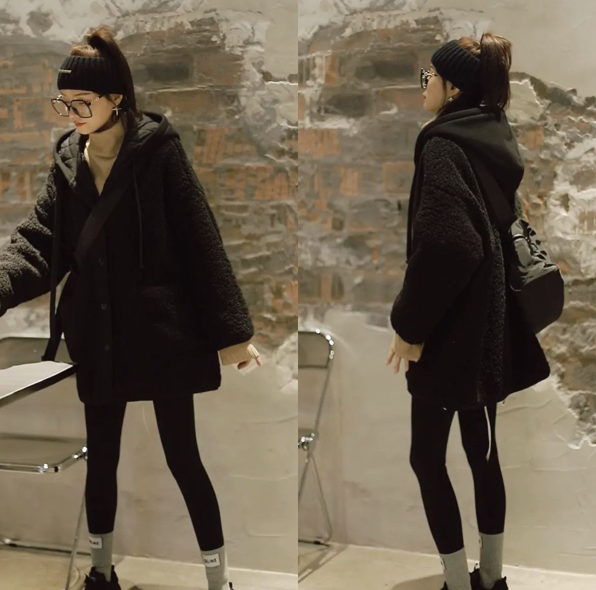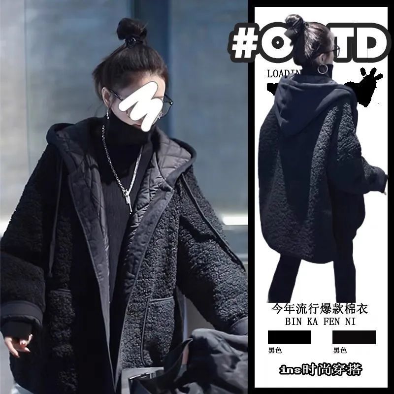 羊羔絨外套女秋冬時尚新款拼接假兩件衛衣連帽寬松百搭大碼呢大衣