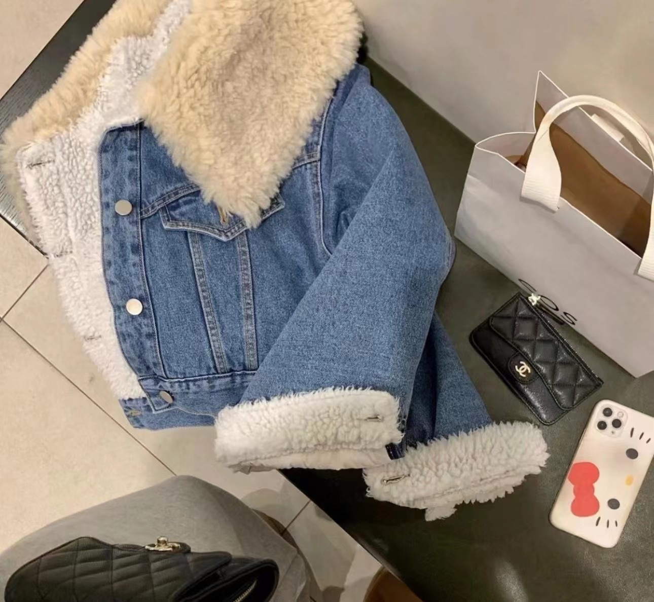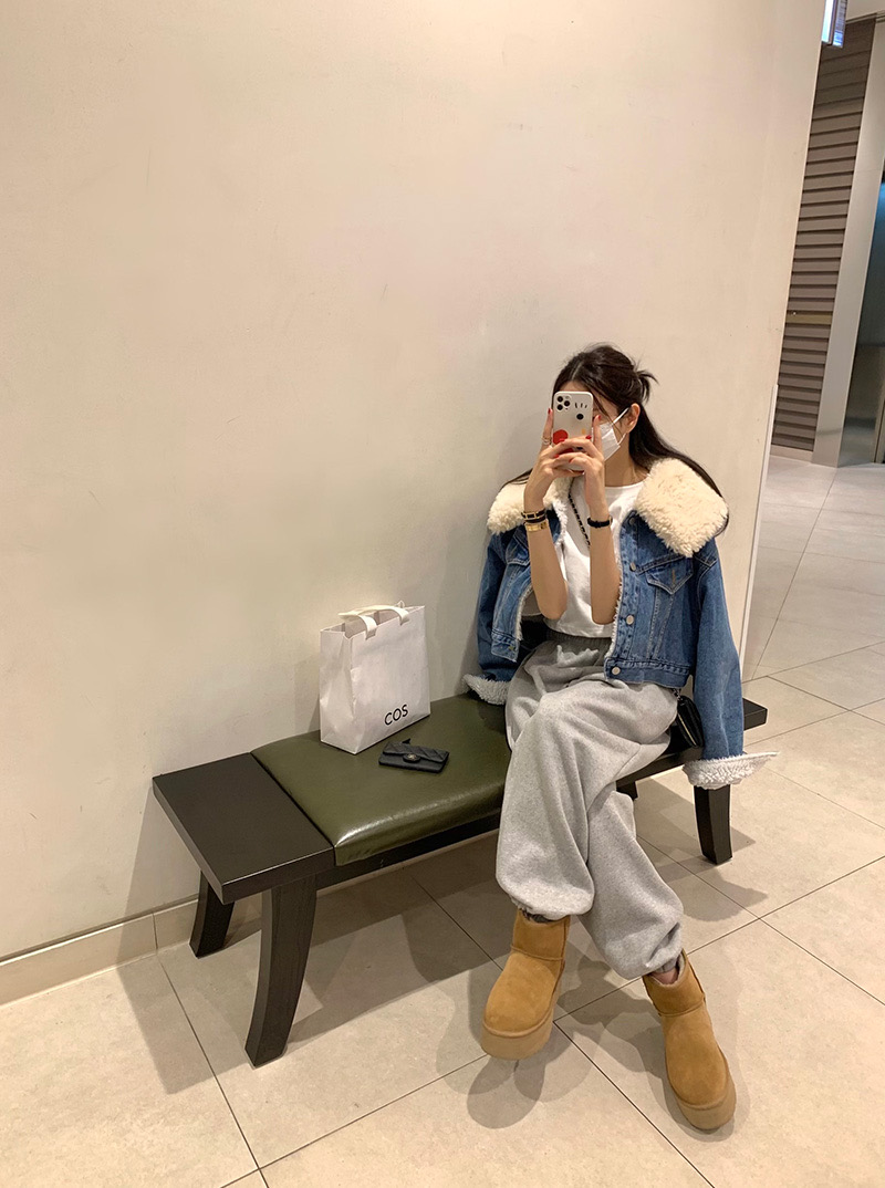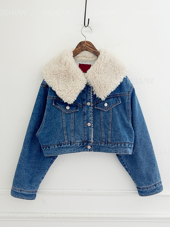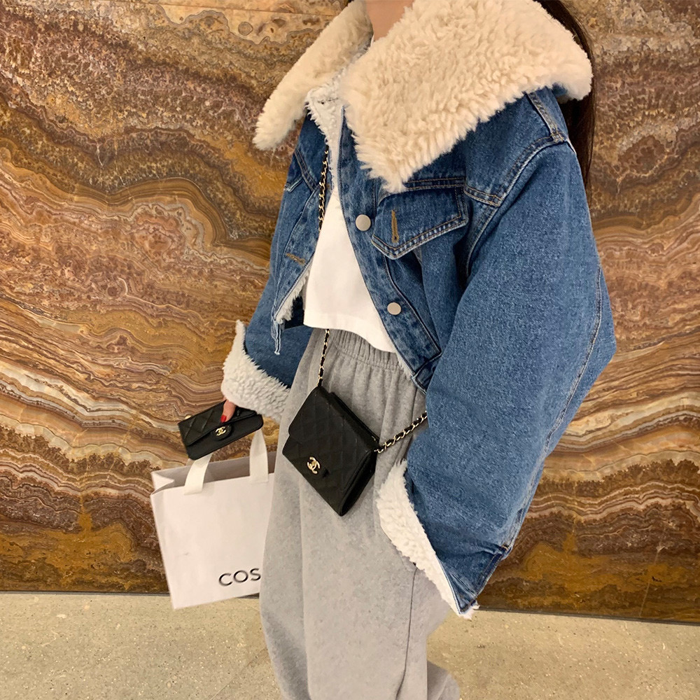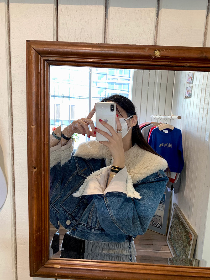 韓國娃娃領羊羔毛短款牛仔外套女冬寬松顯瘦加絨加厚顆粒羊絨上衣