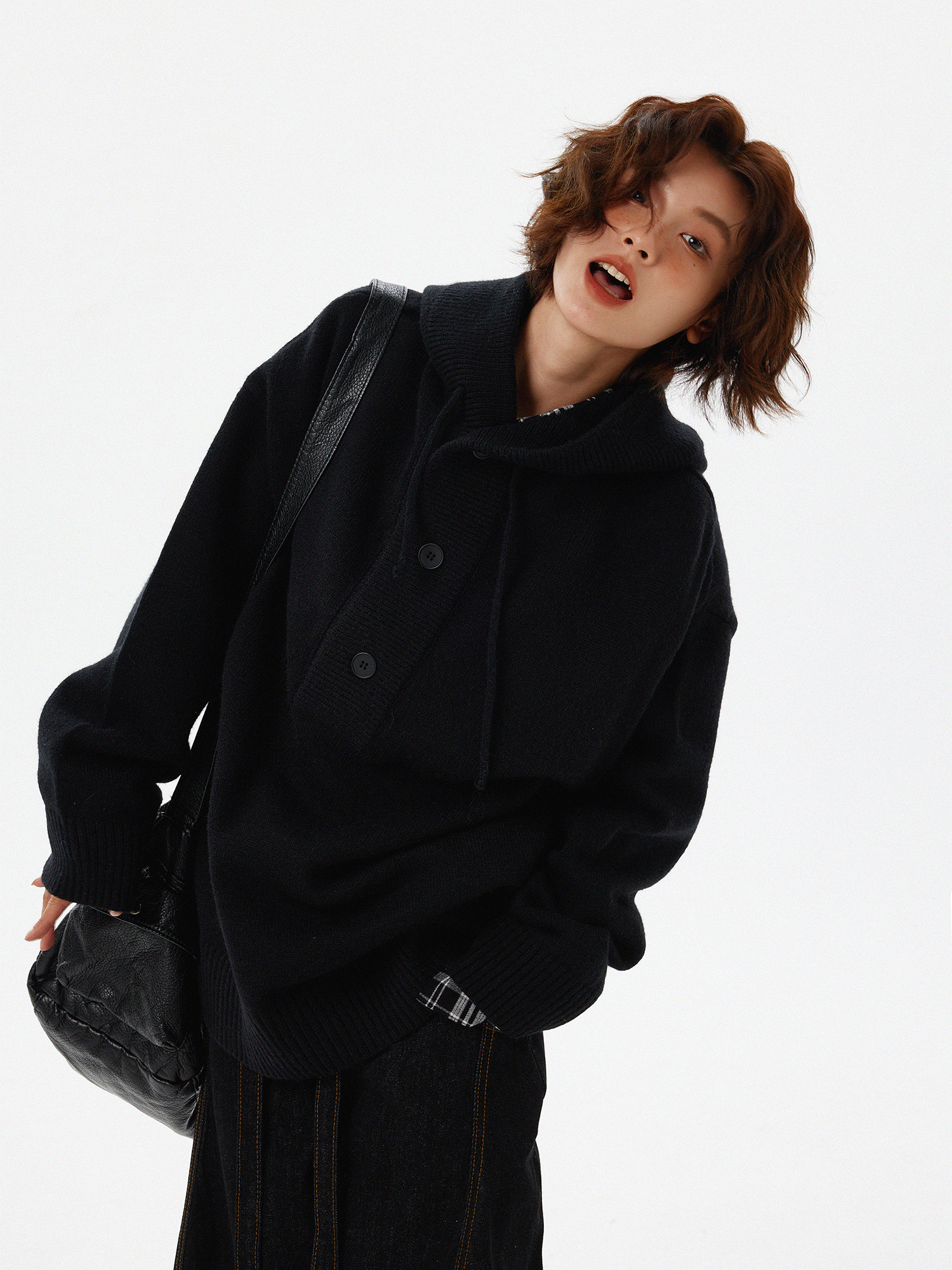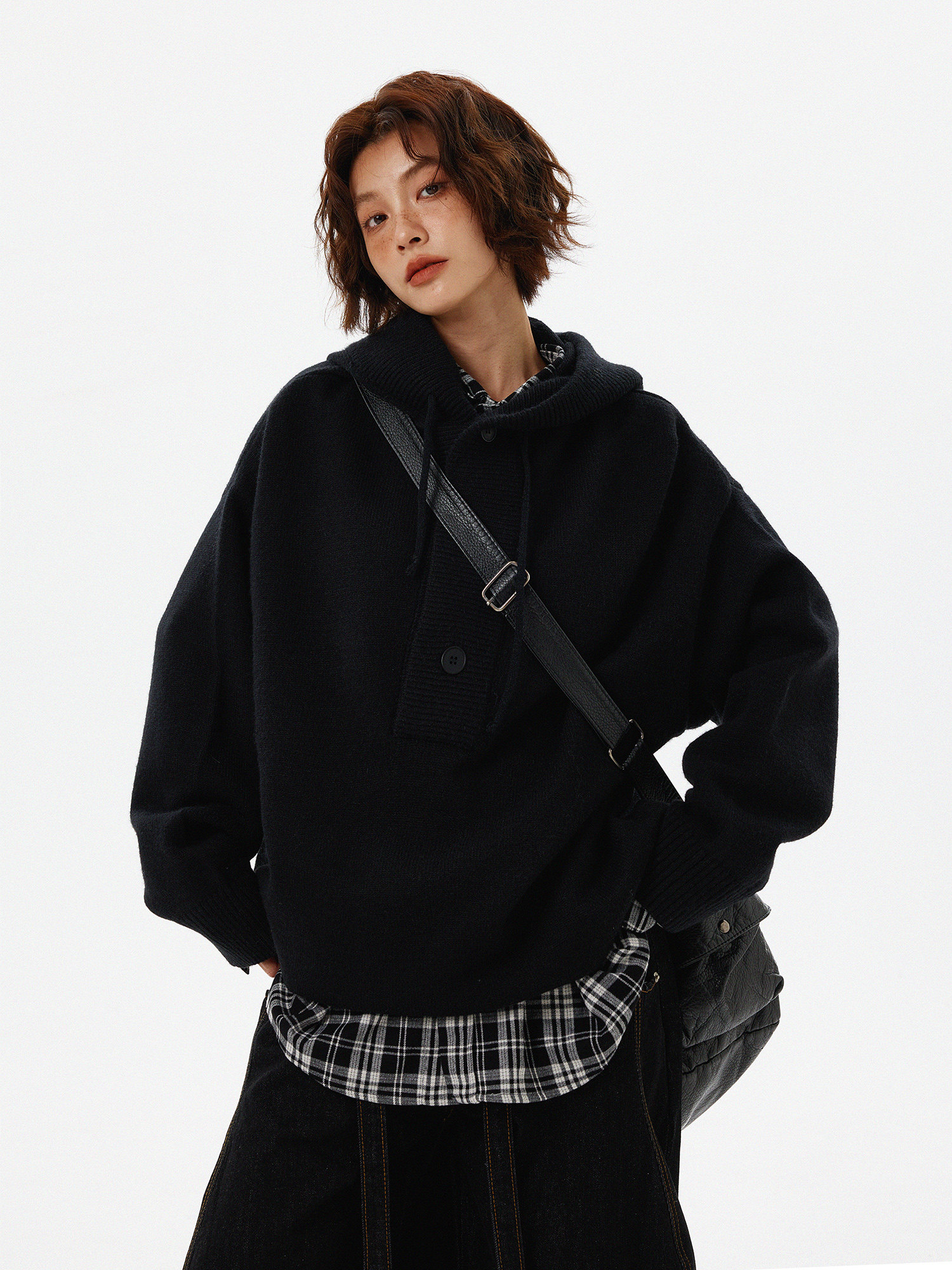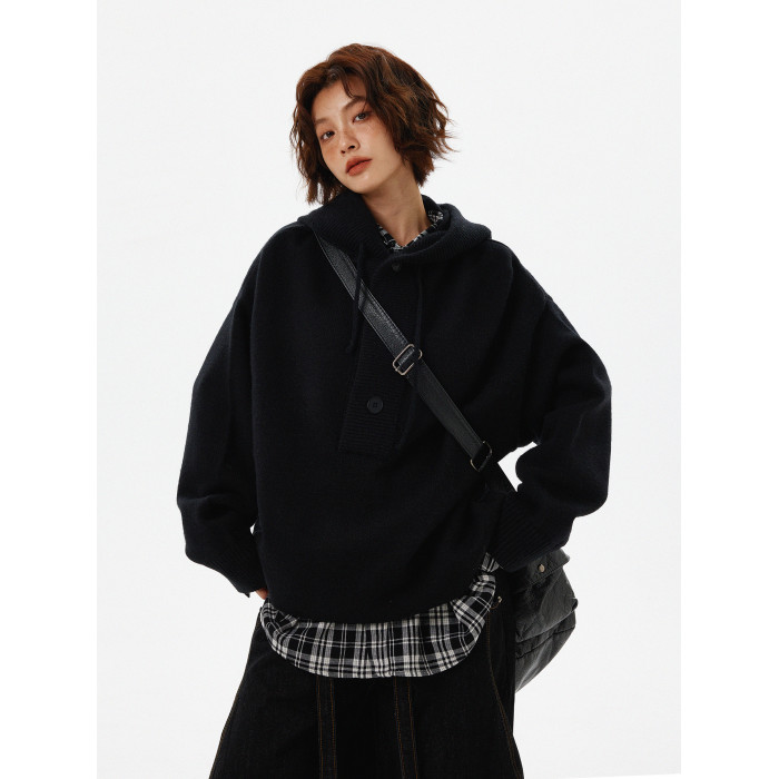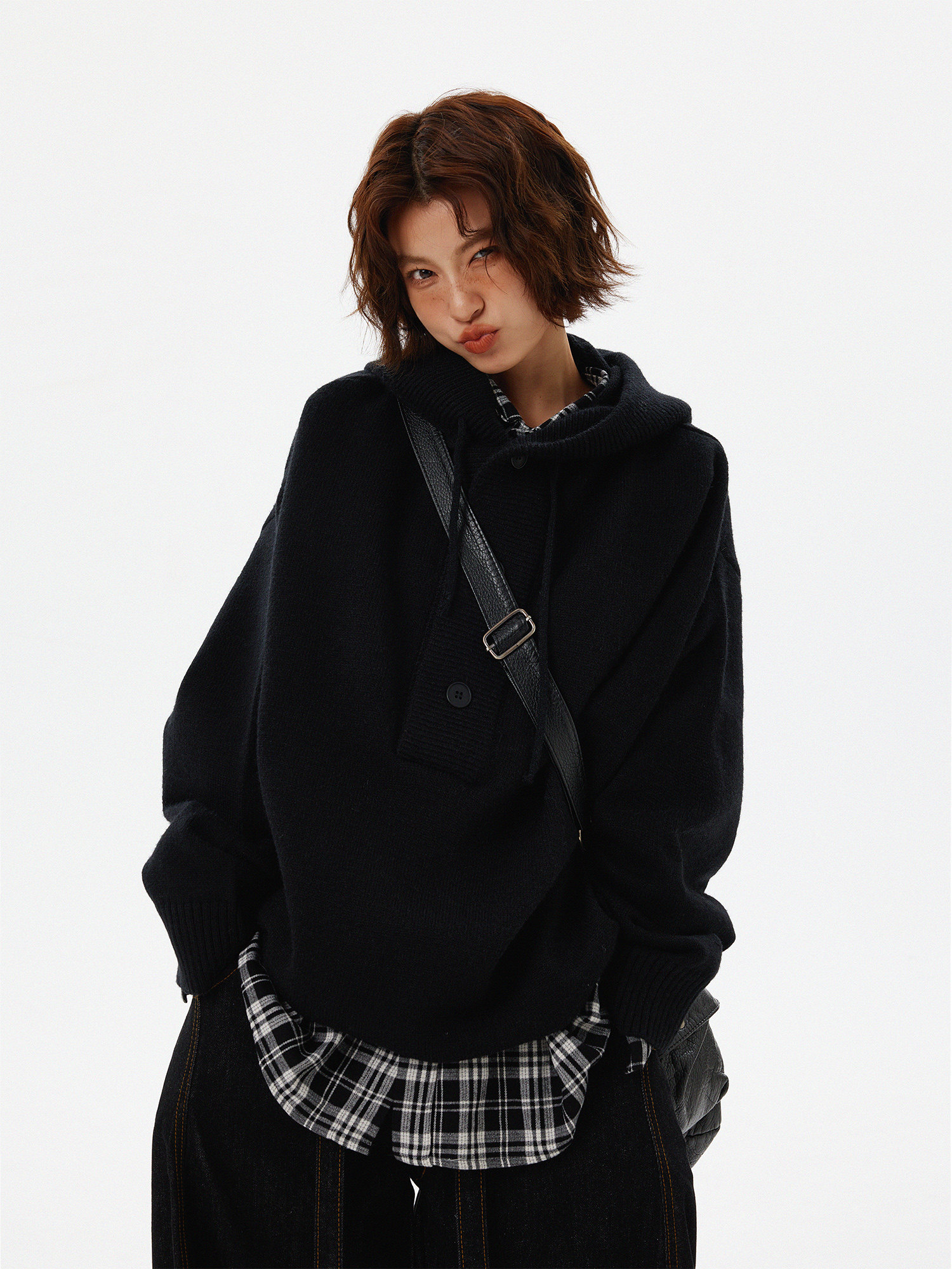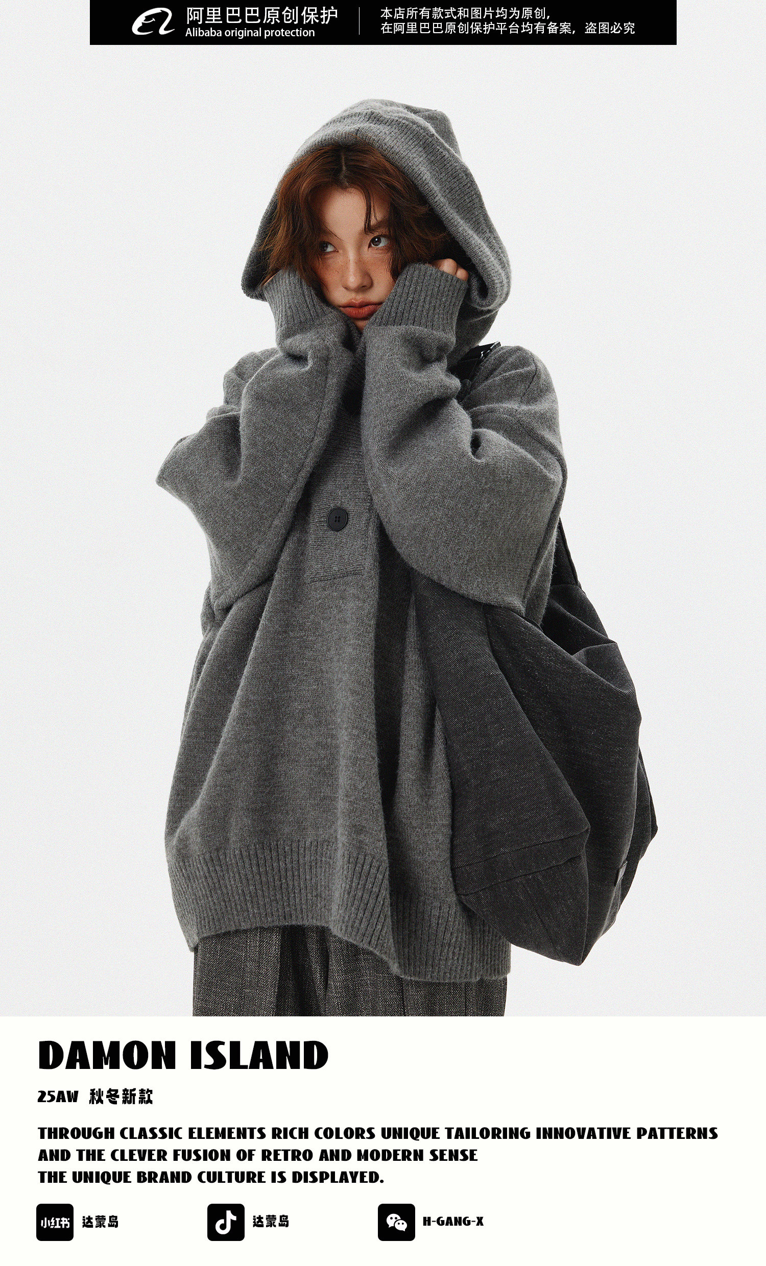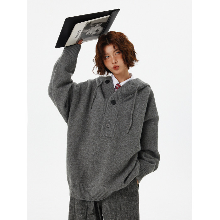 達矇島美式復古慵嬾風半開衫紐釦連帽毛衣男女寬鬆情侶針織衫外套