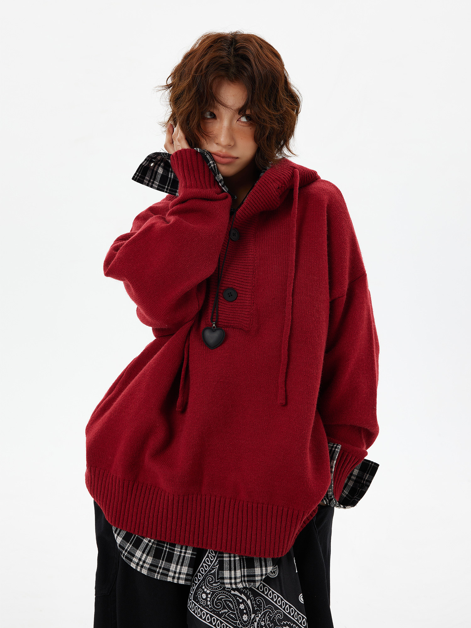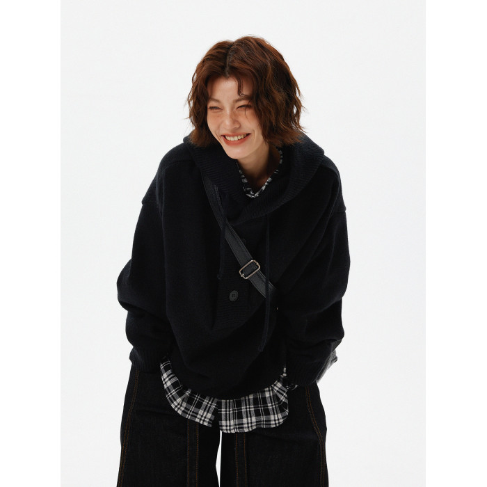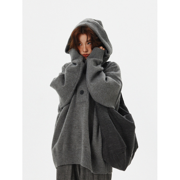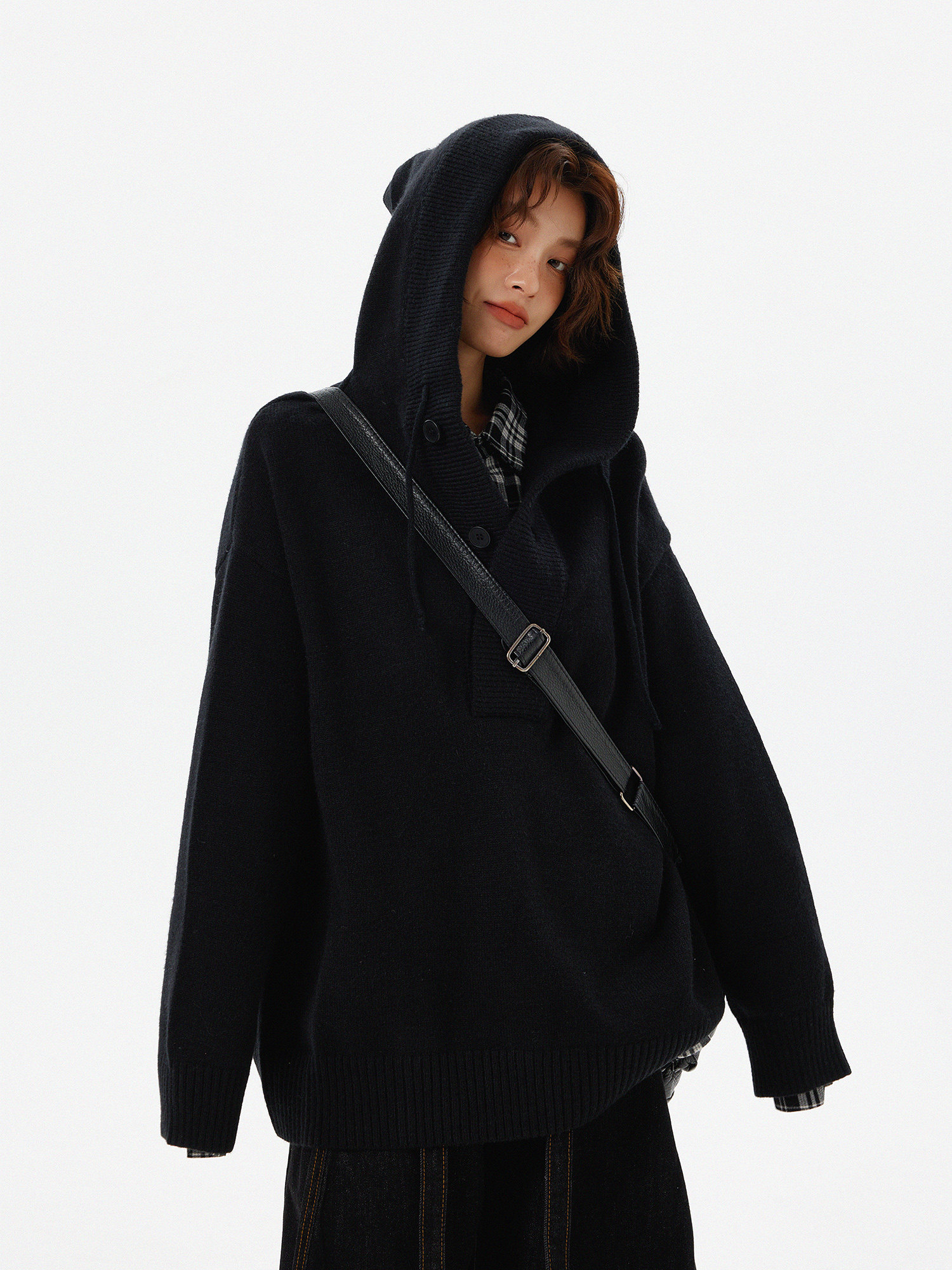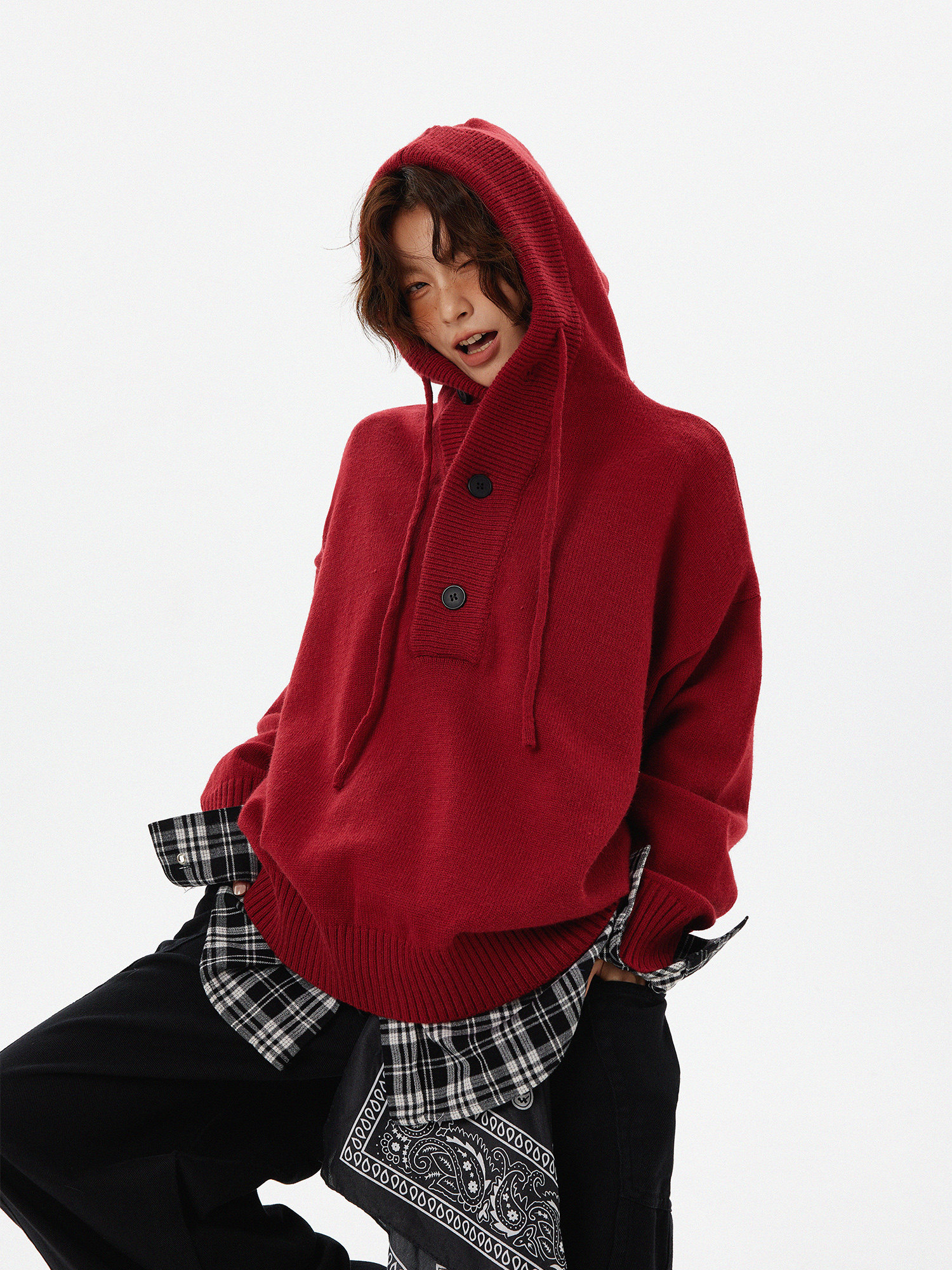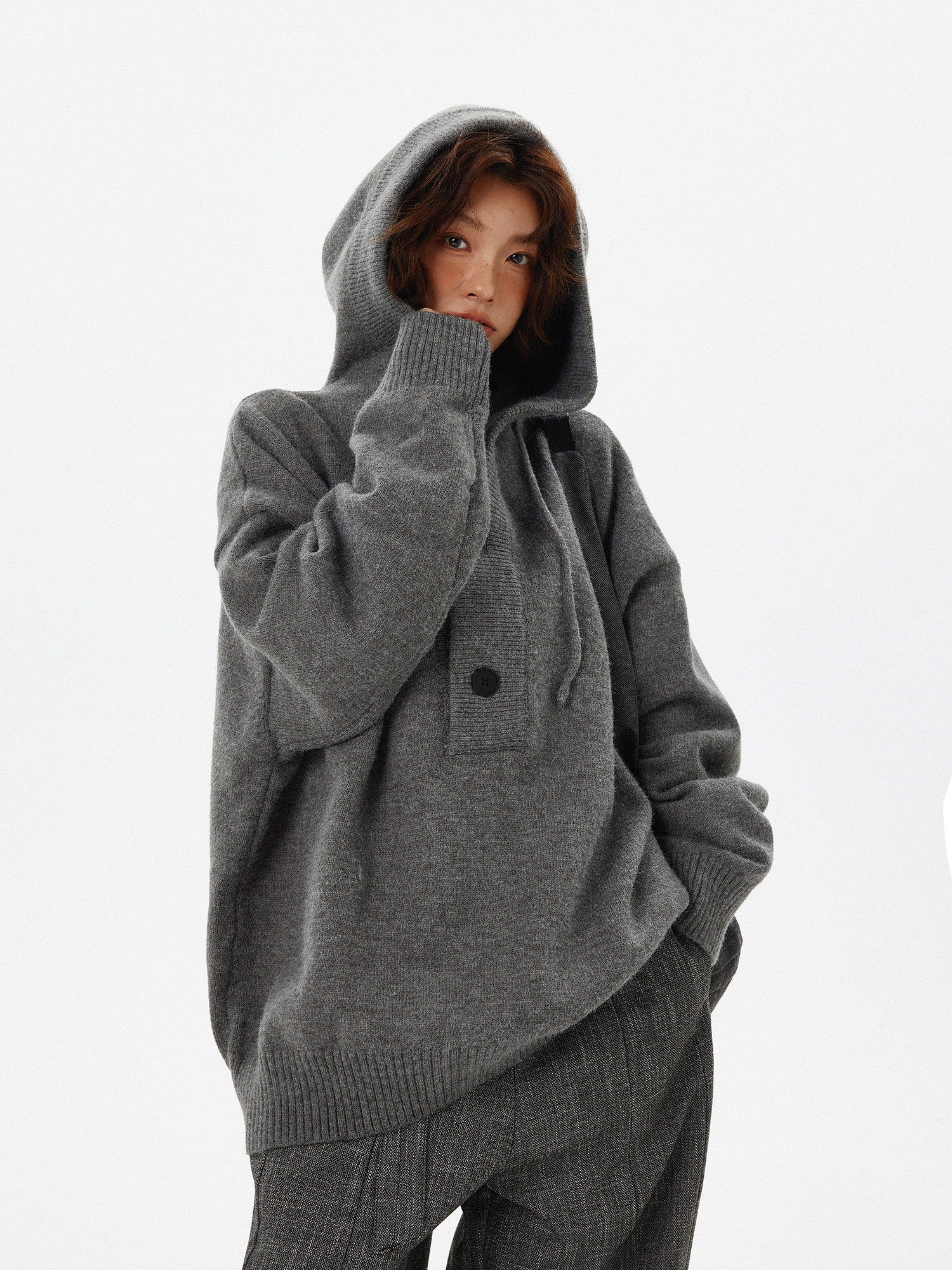 達矇島美式復古慵嬾風半開衫紐釦連帽毛衣男女寬鬆情侶針織衫外套