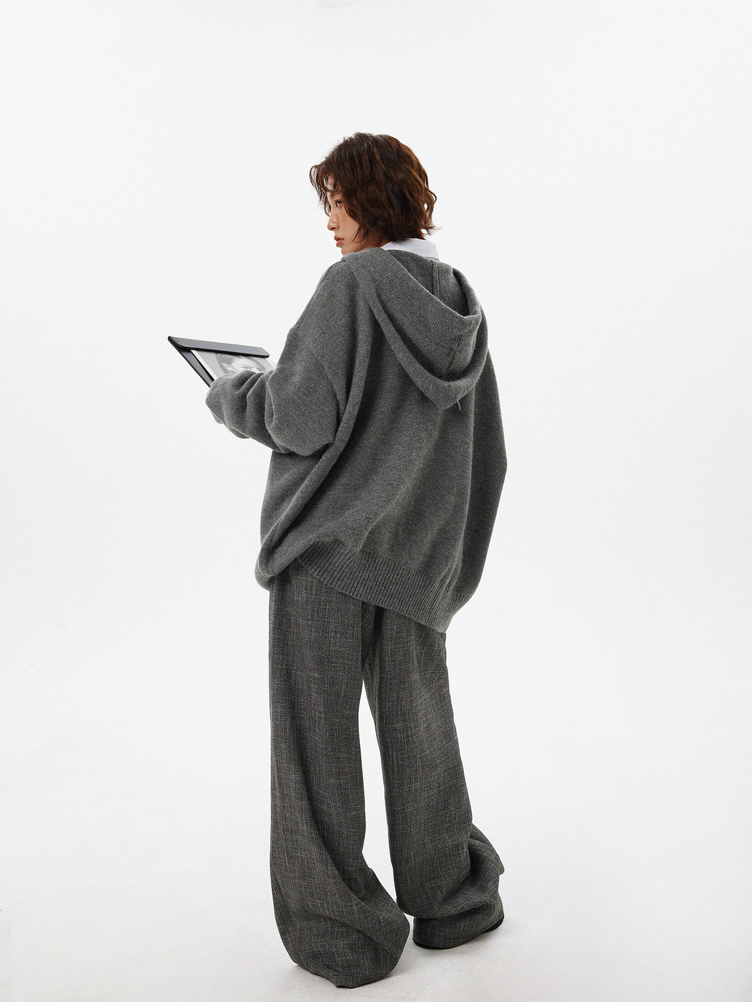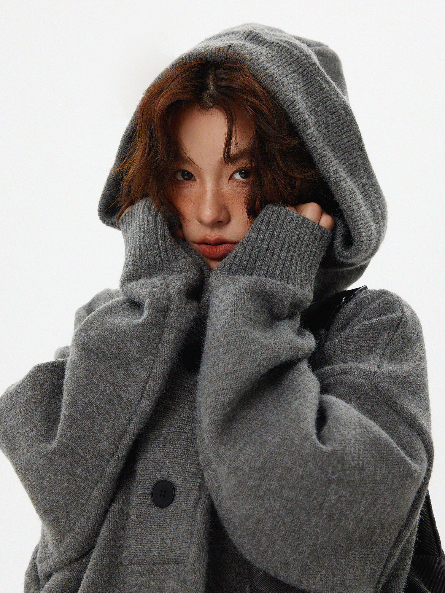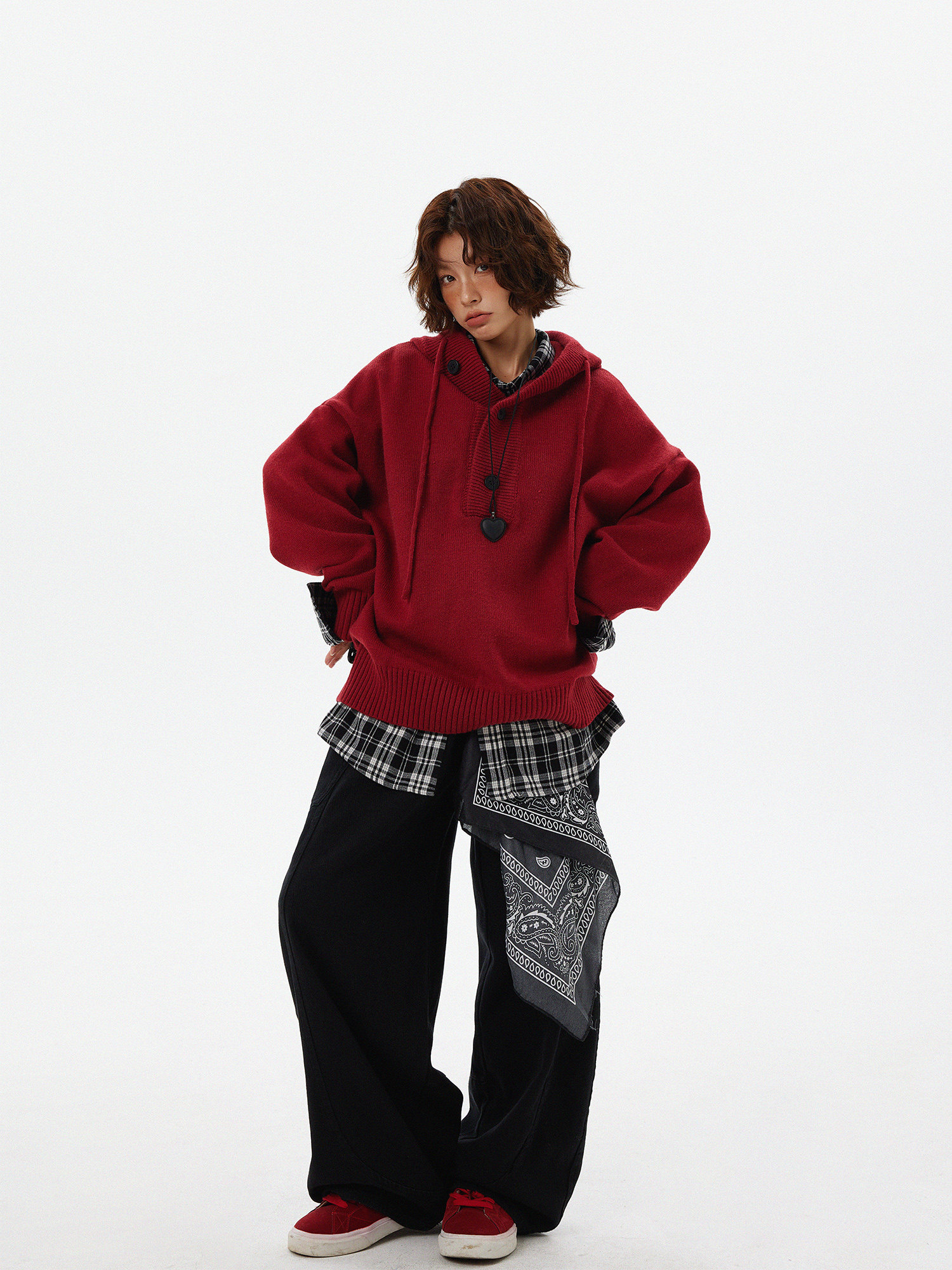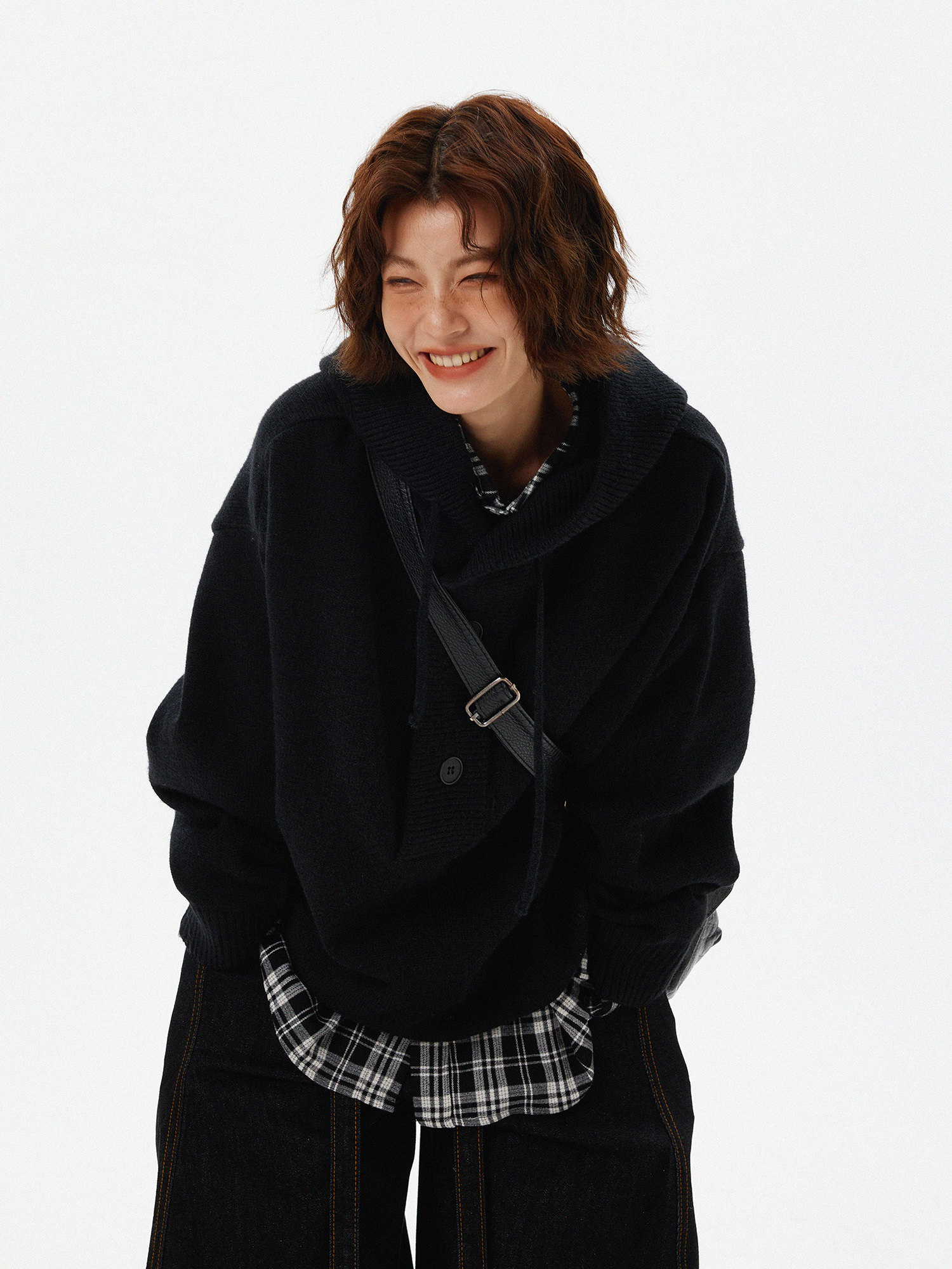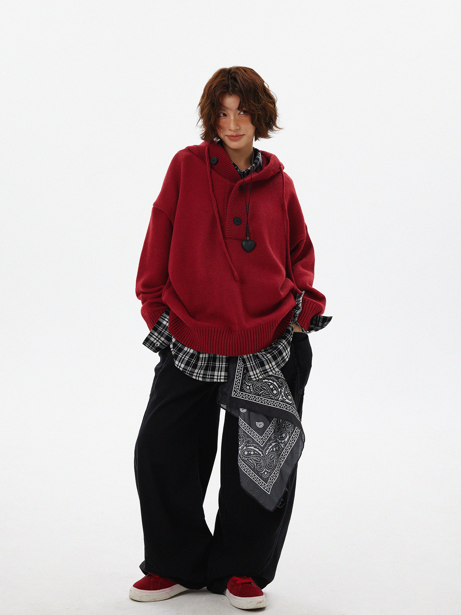 達矇島美式復古慵嬾風半開衫紐釦連帽毛衣男女寬鬆情侶針織衫外套