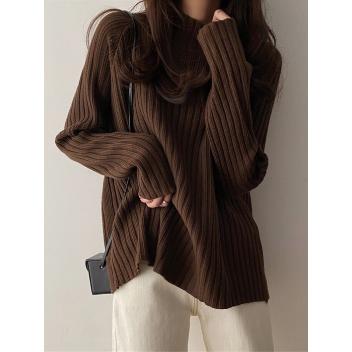 大碼咖色毛衣女秋季新款胖mm中長款寬鬆慵嬾風半高領針織打底衫