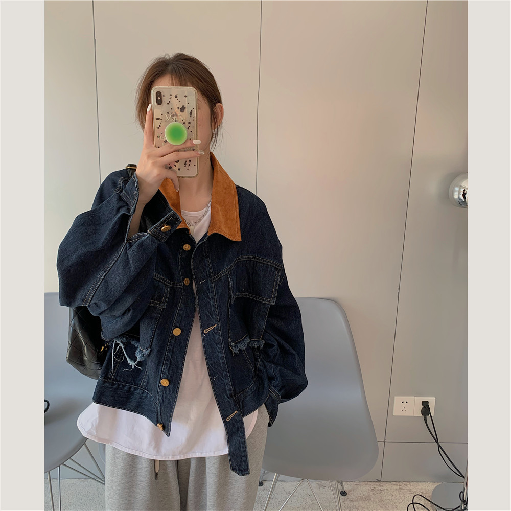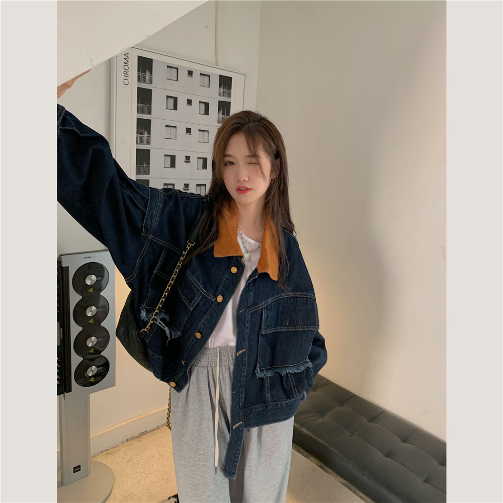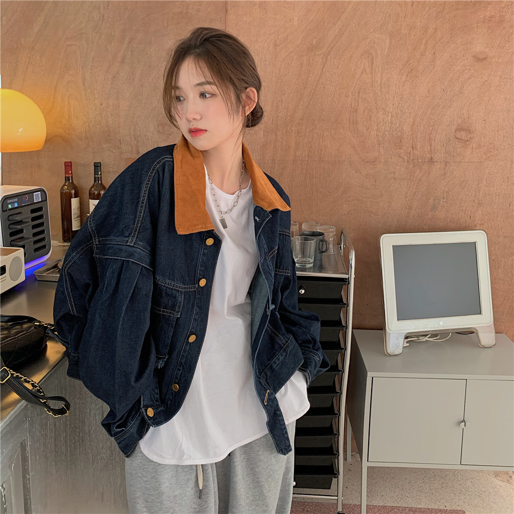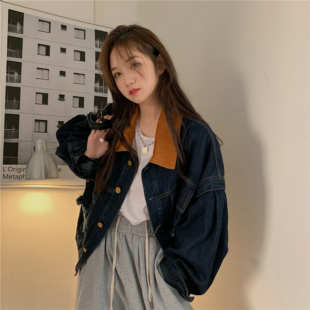 設計感燈芯絨領牛仔外套女短款秋冬大碼寬松復古百搭夾克上衣胖mm