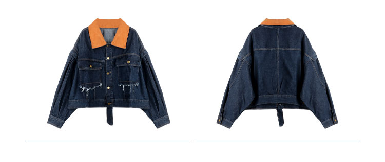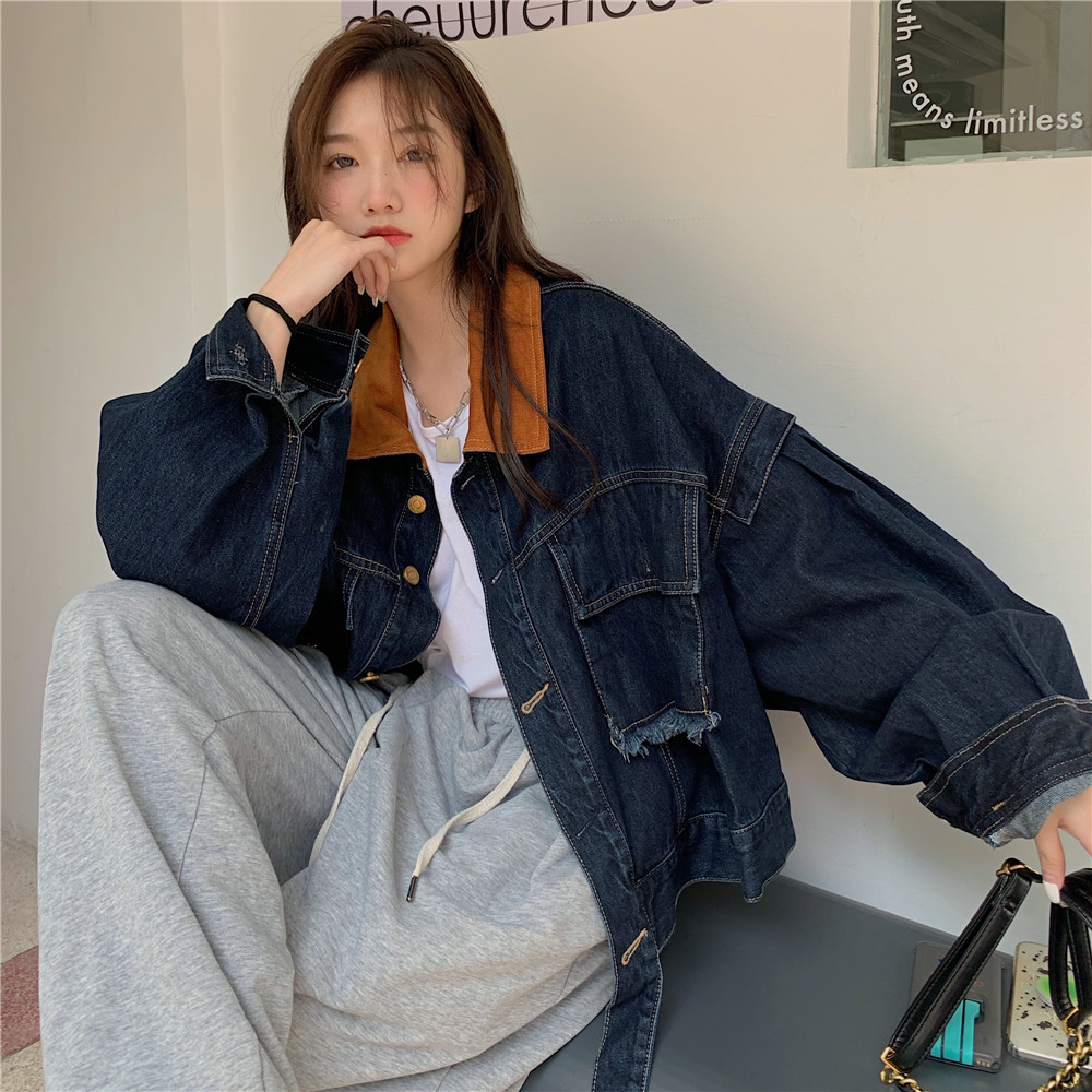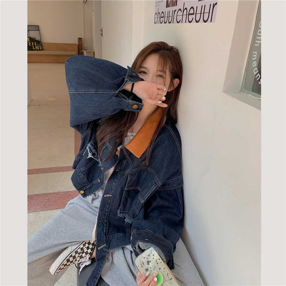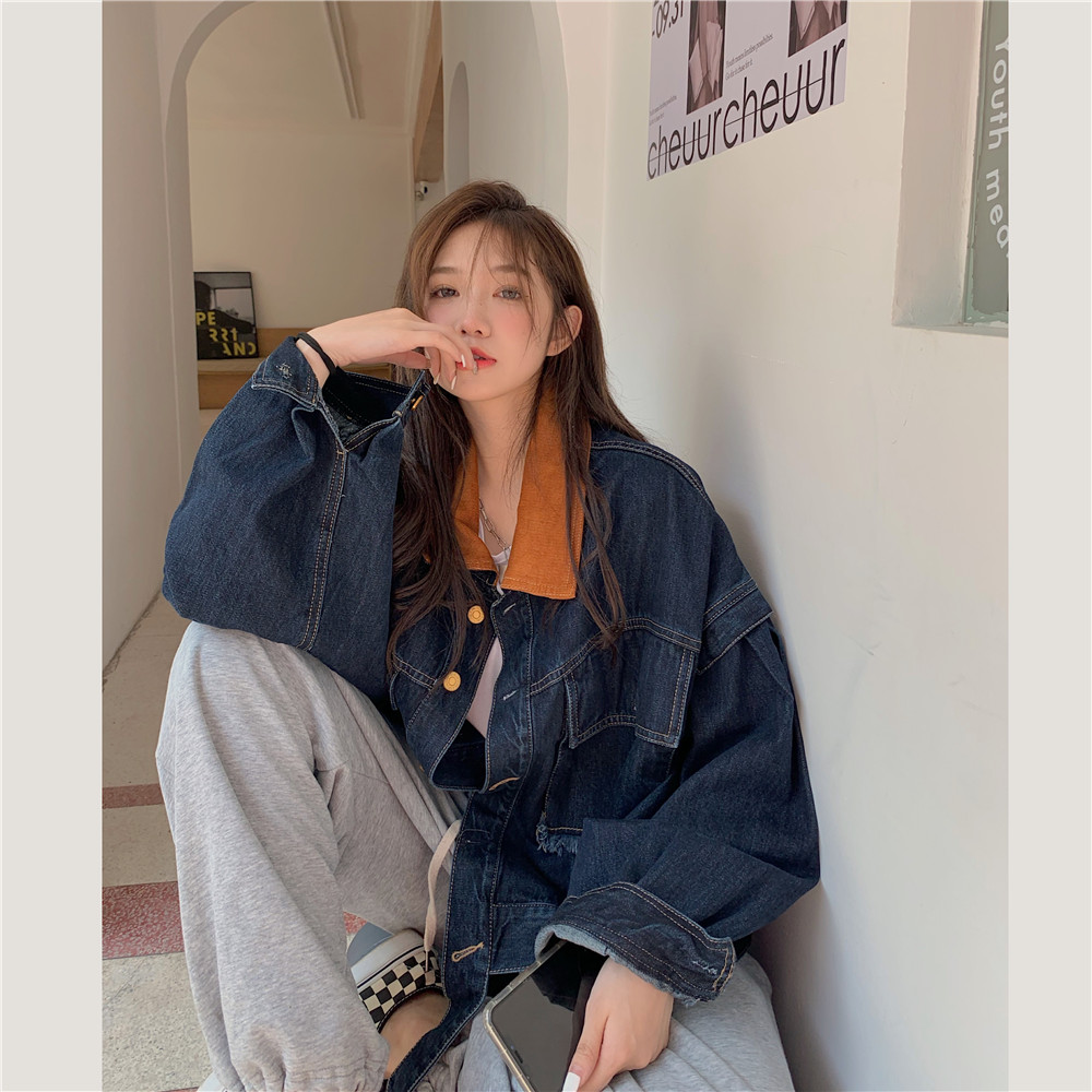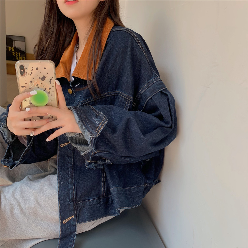 設計感燈芯絨領牛仔外套女短款秋冬大碼寬松復古百搭夾克上衣胖mm