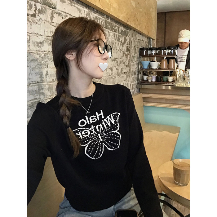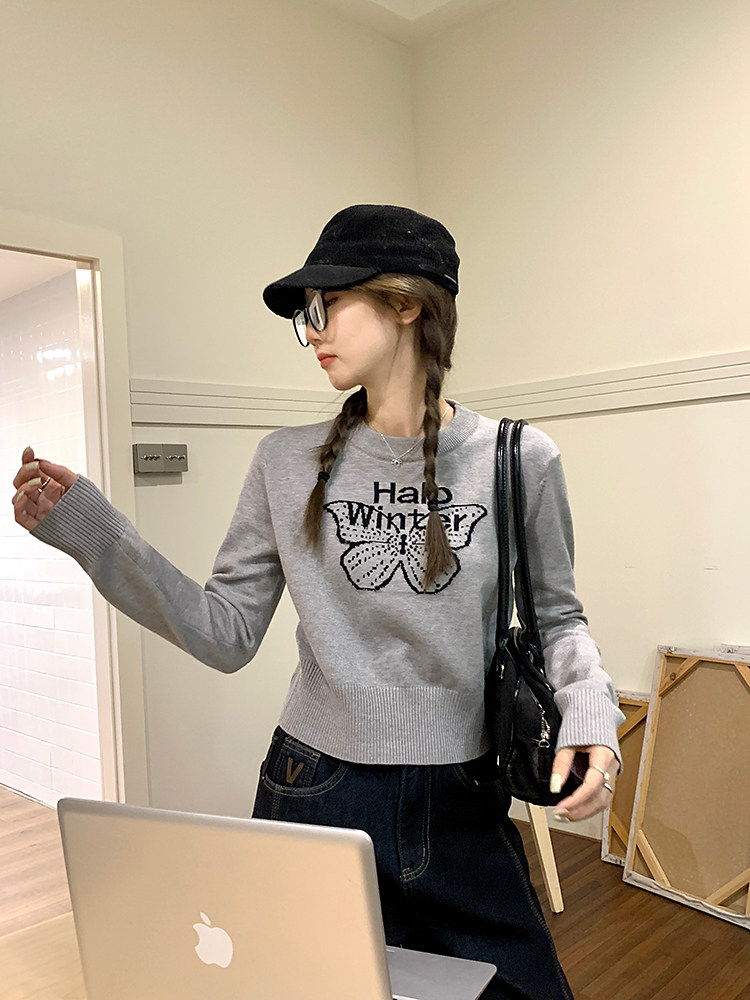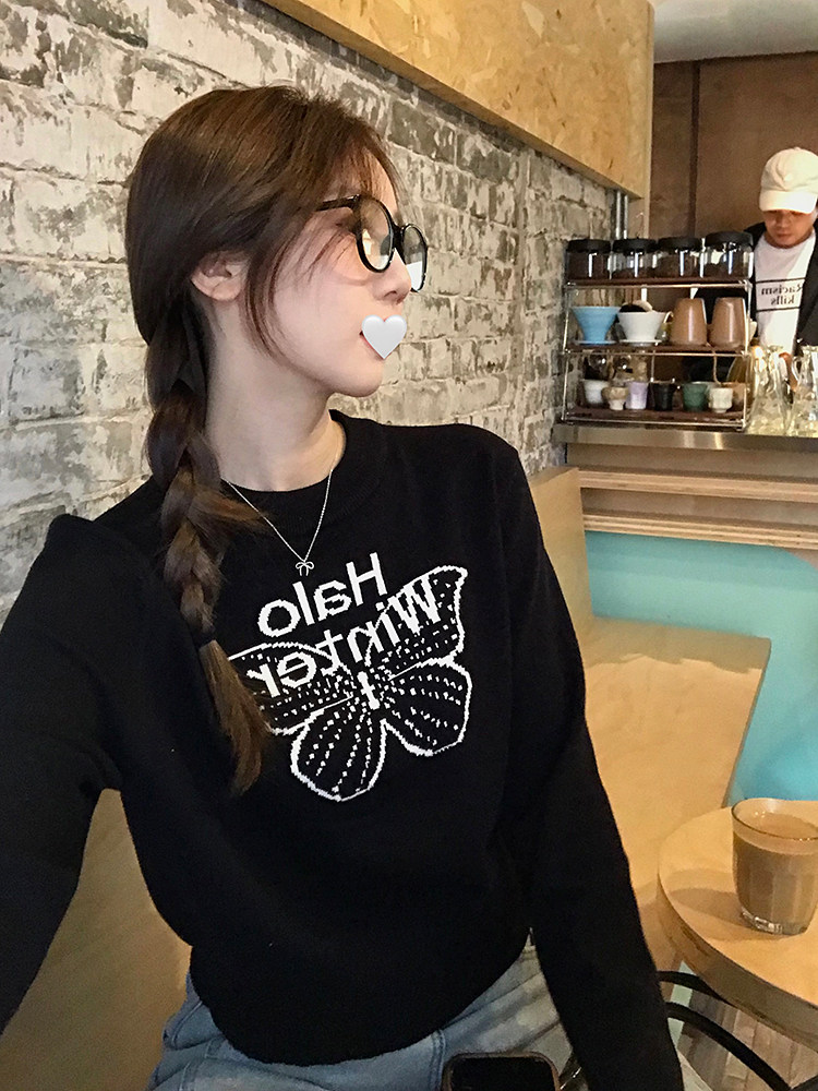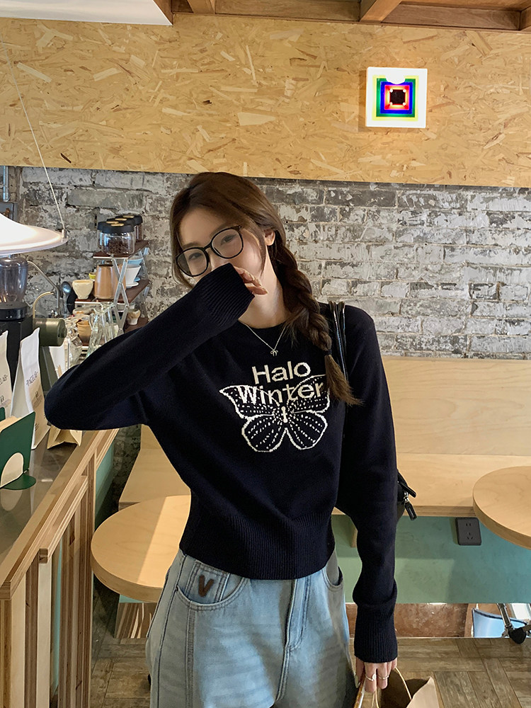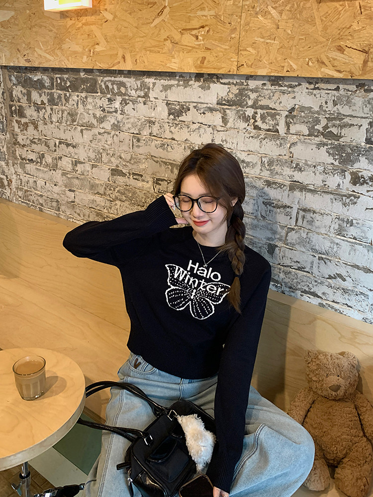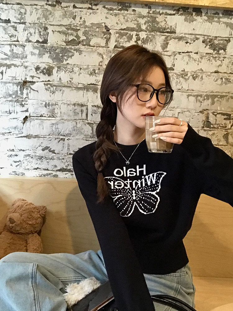 烏77設計感蝴蝶提花圓領毛衣女春內搭修身打底衫短款針織休閒上衣