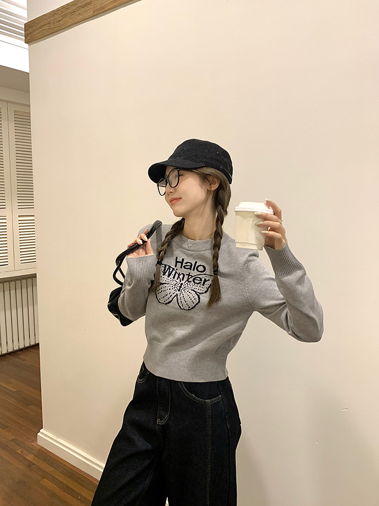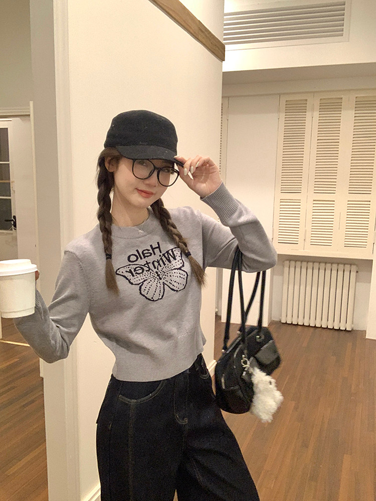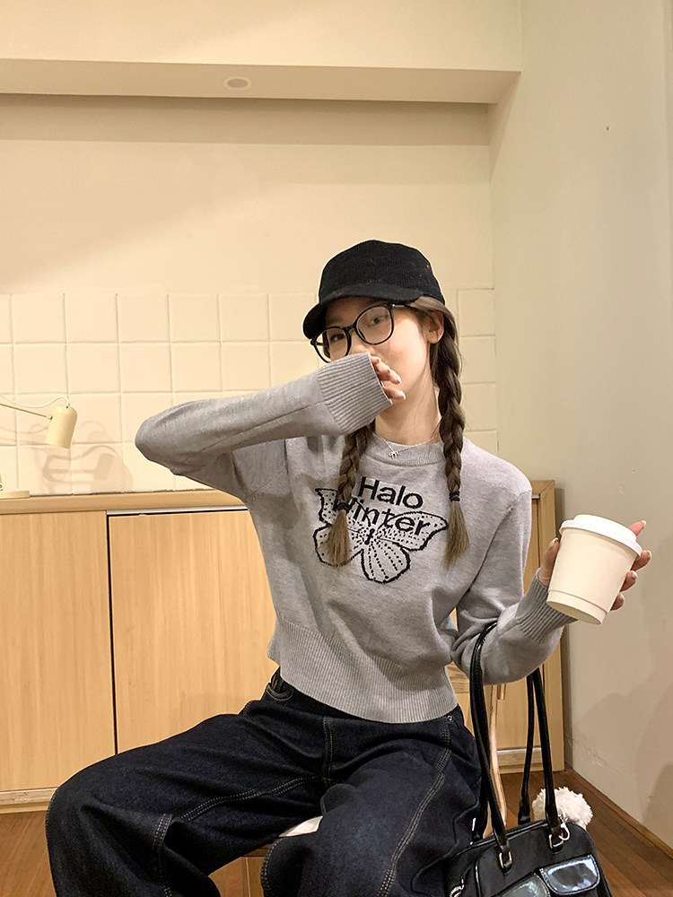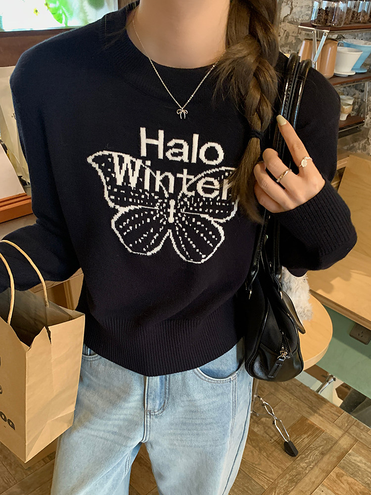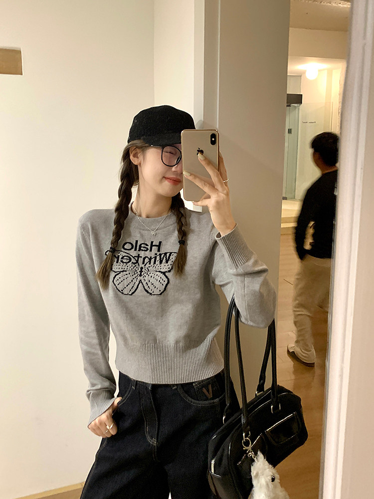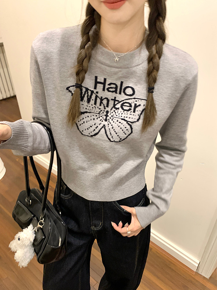 烏77設計感蝴蝶提花圓領毛衣女春內搭修身打底衫短款針織休閒上衣
