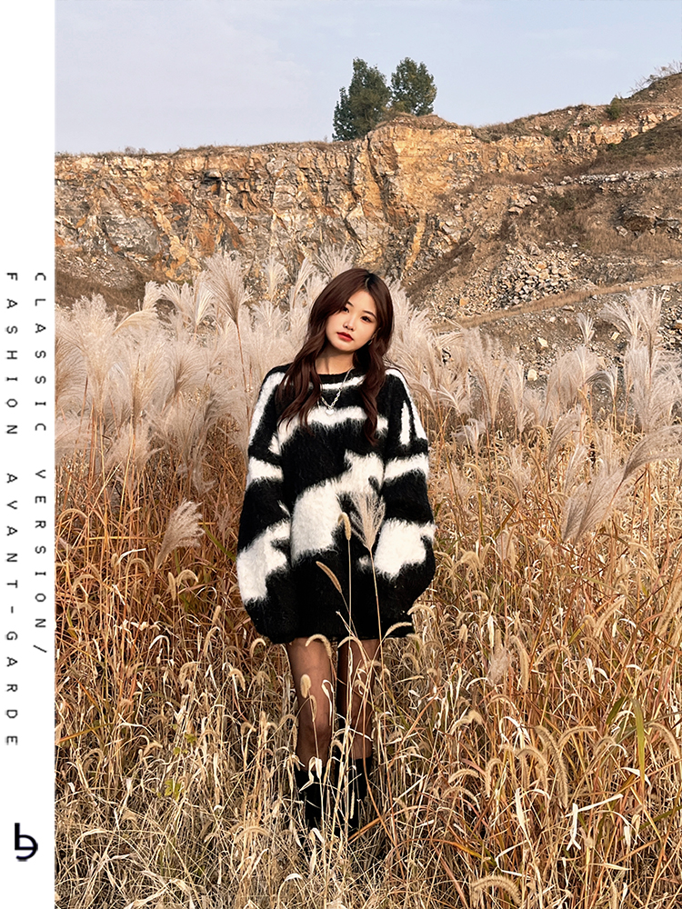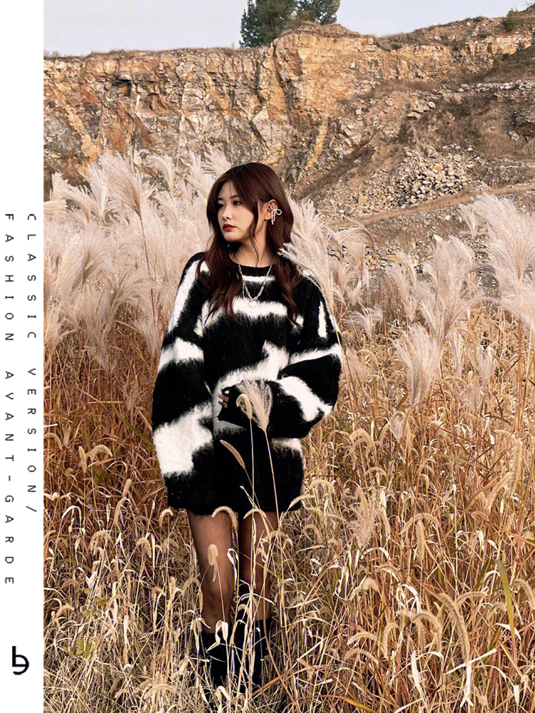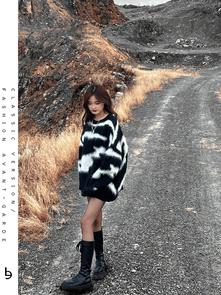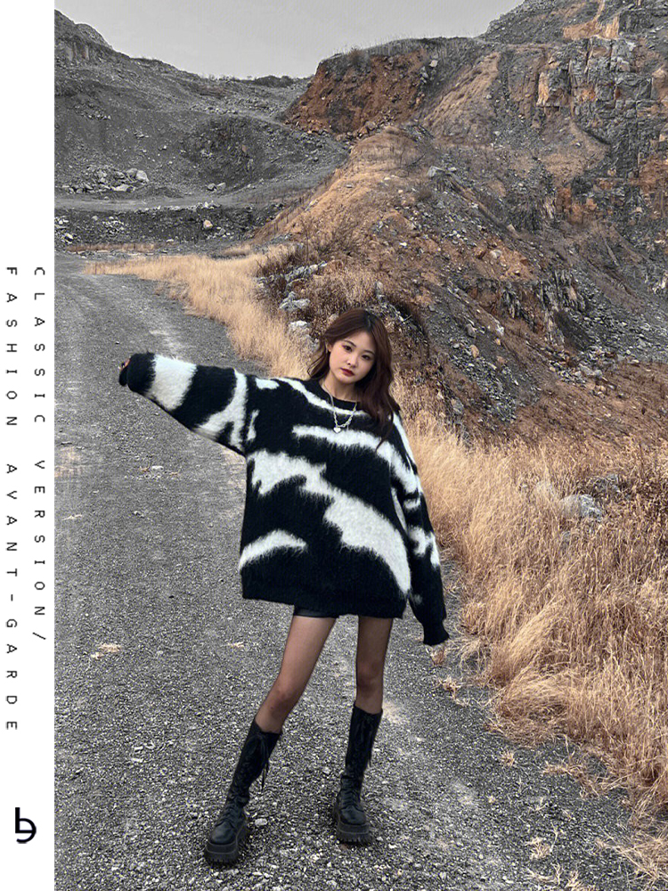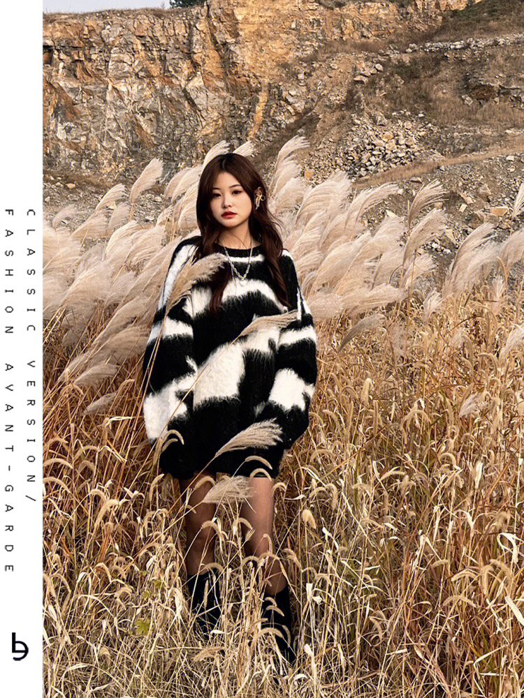 日系慵懶風不規則條紋寬松水貂毛衣高級感oversize甜颯風針織衫潮