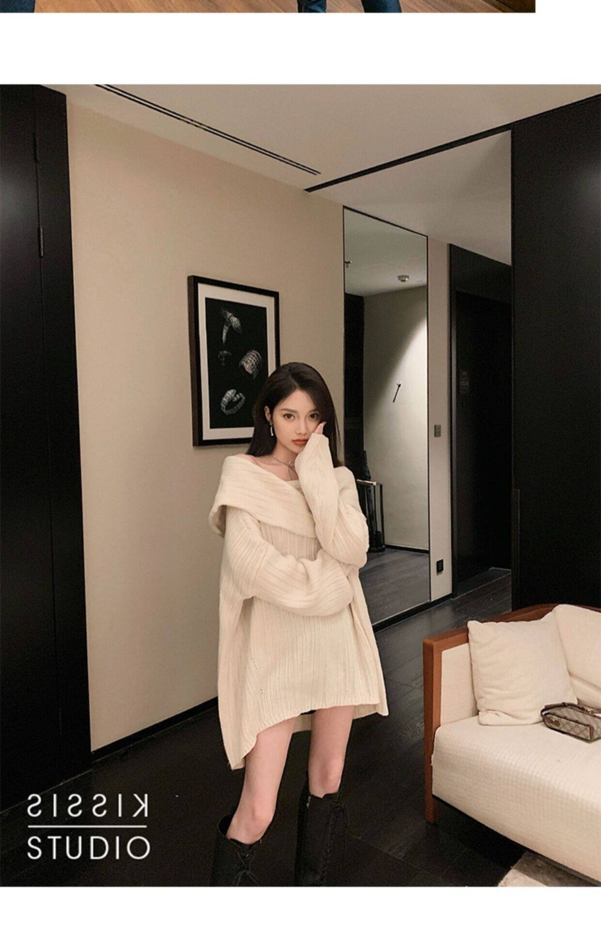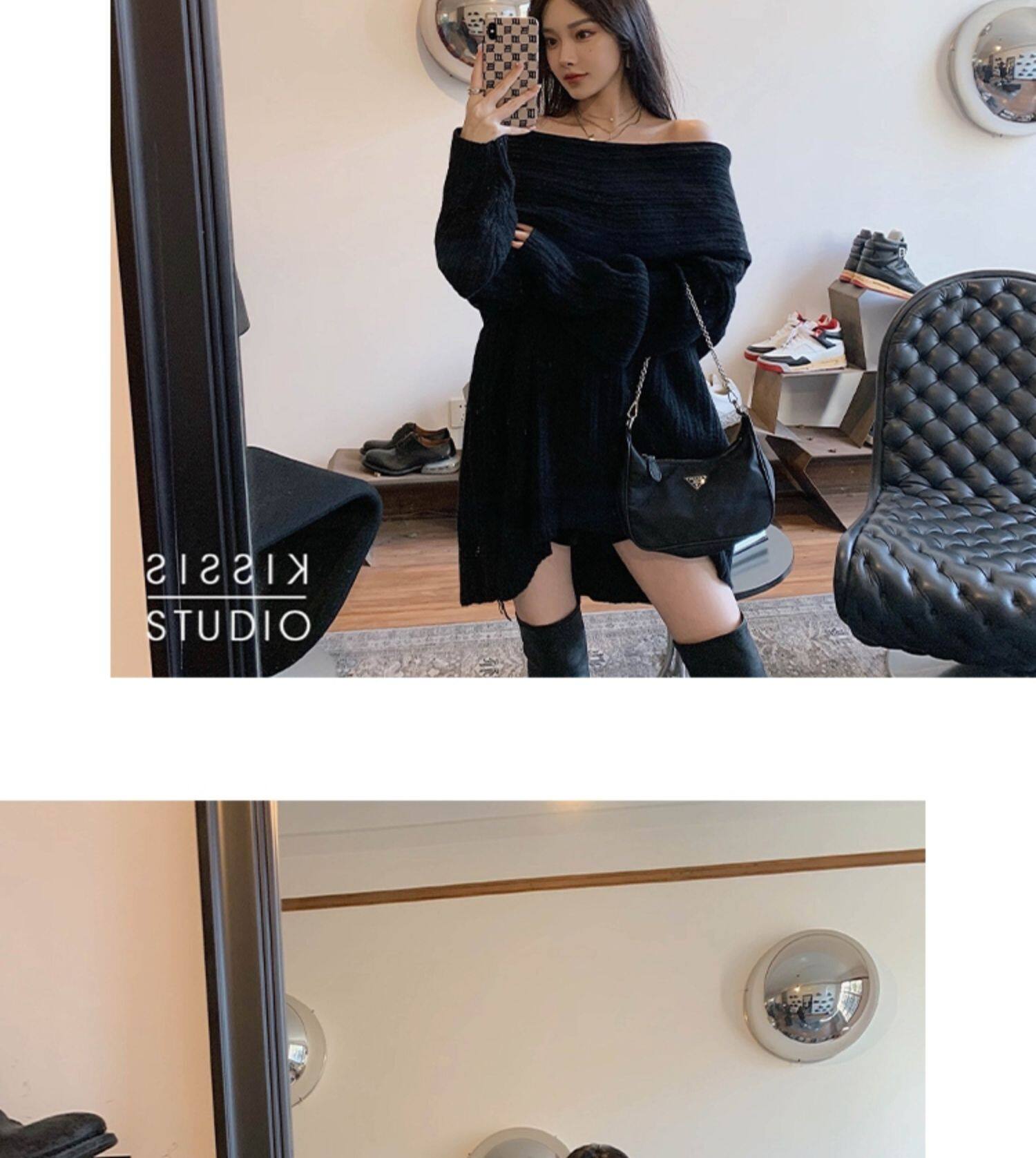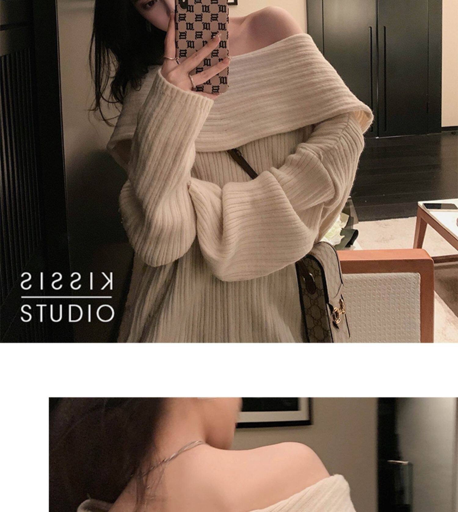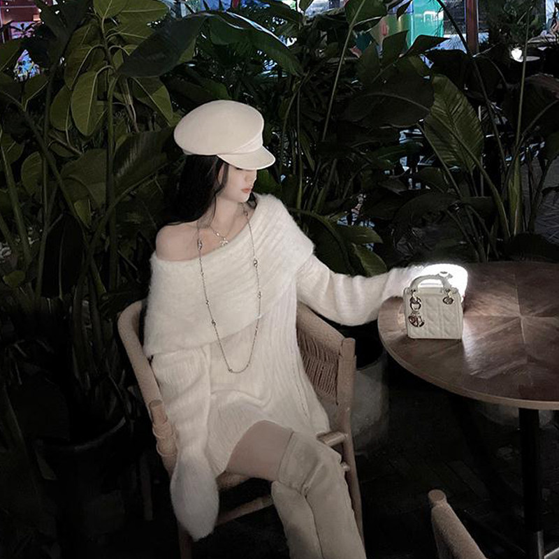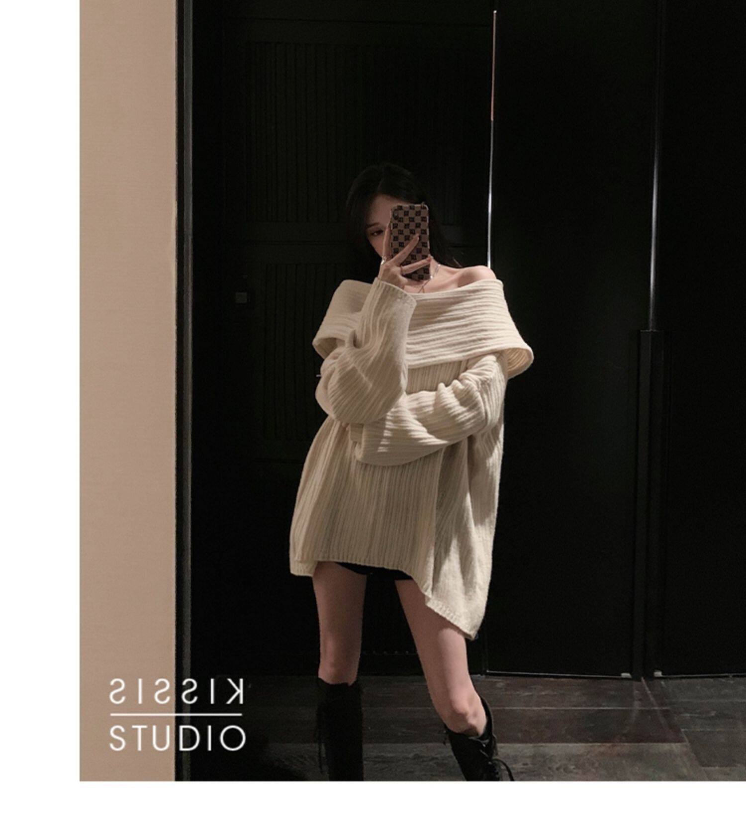 春季氛圍感穿搭露肩上衣一字肩長款大毛衣秋冬女慵懶風高級感寬鬆