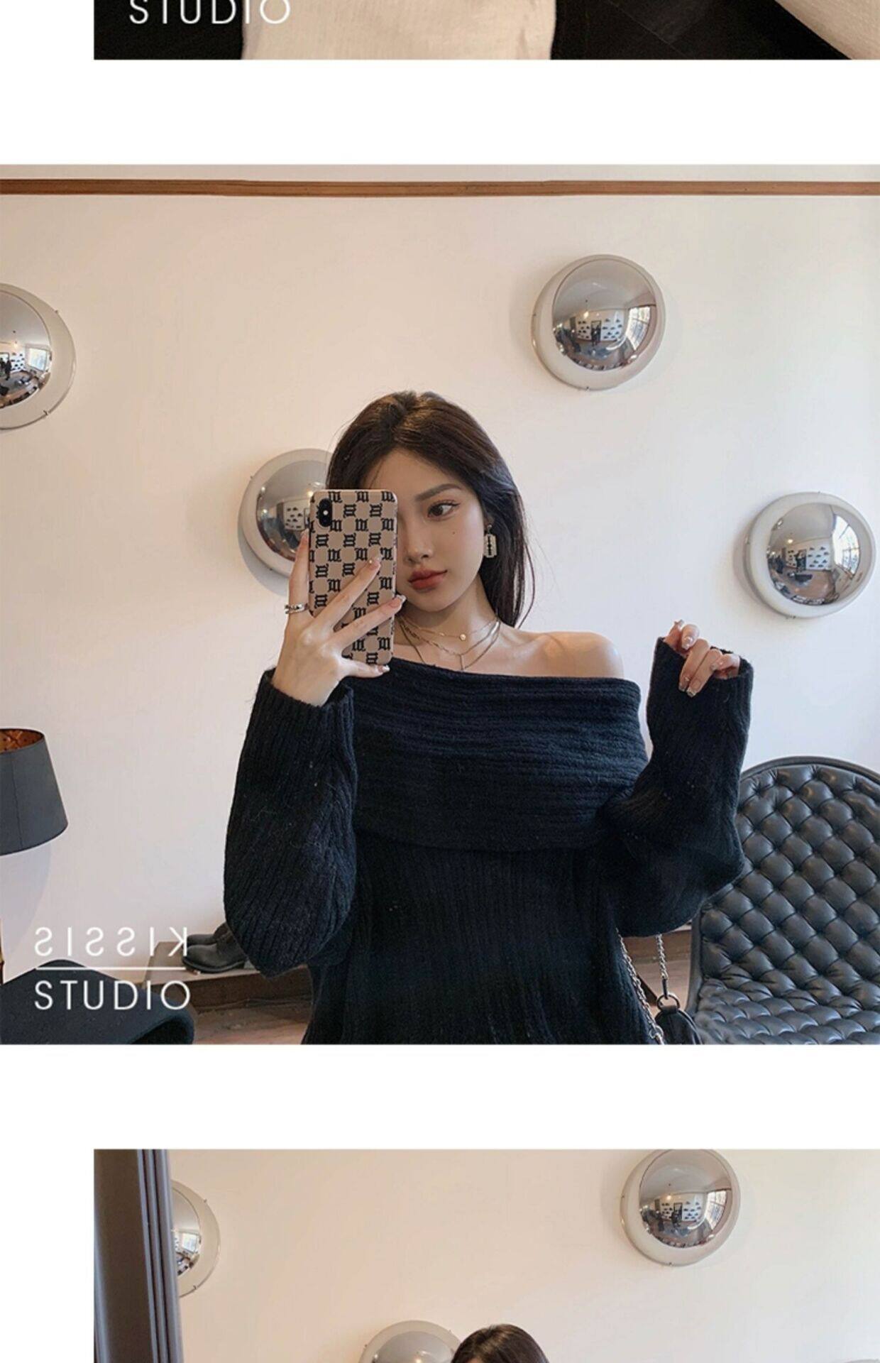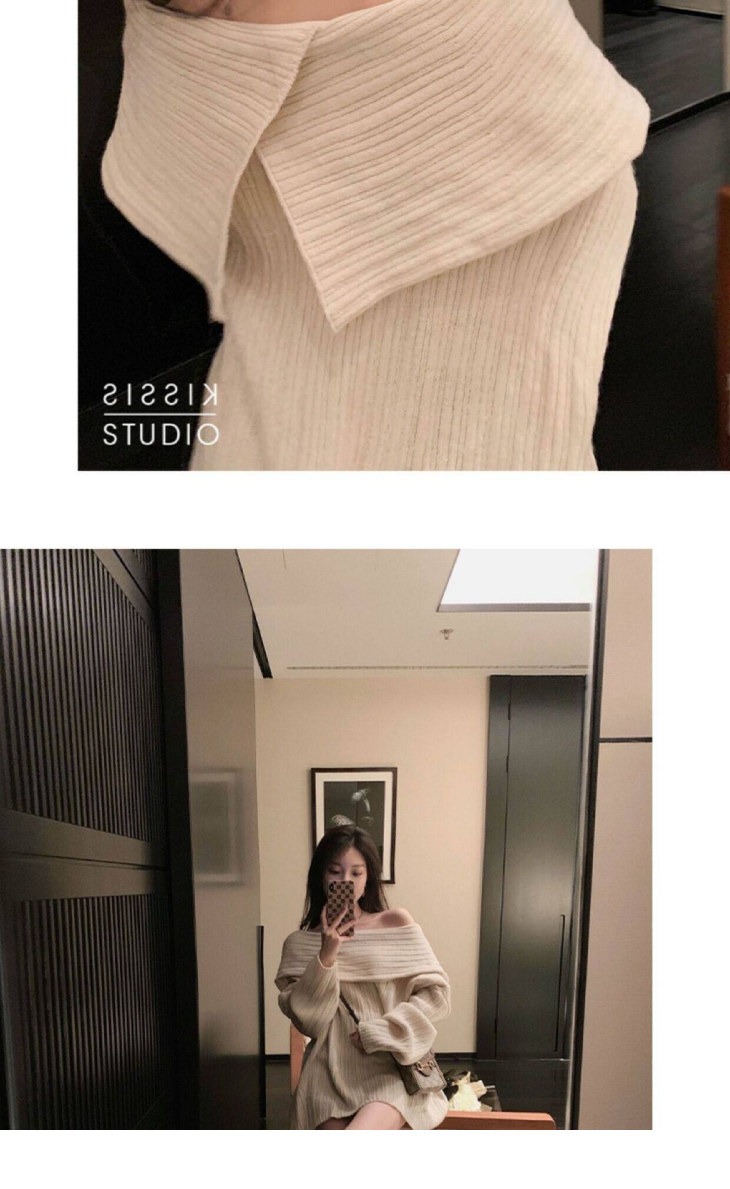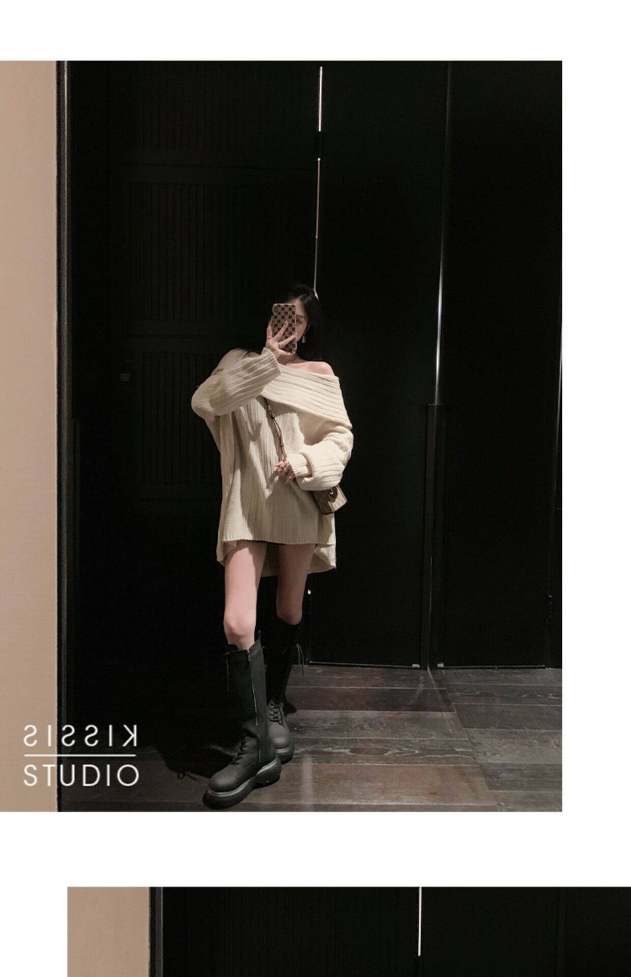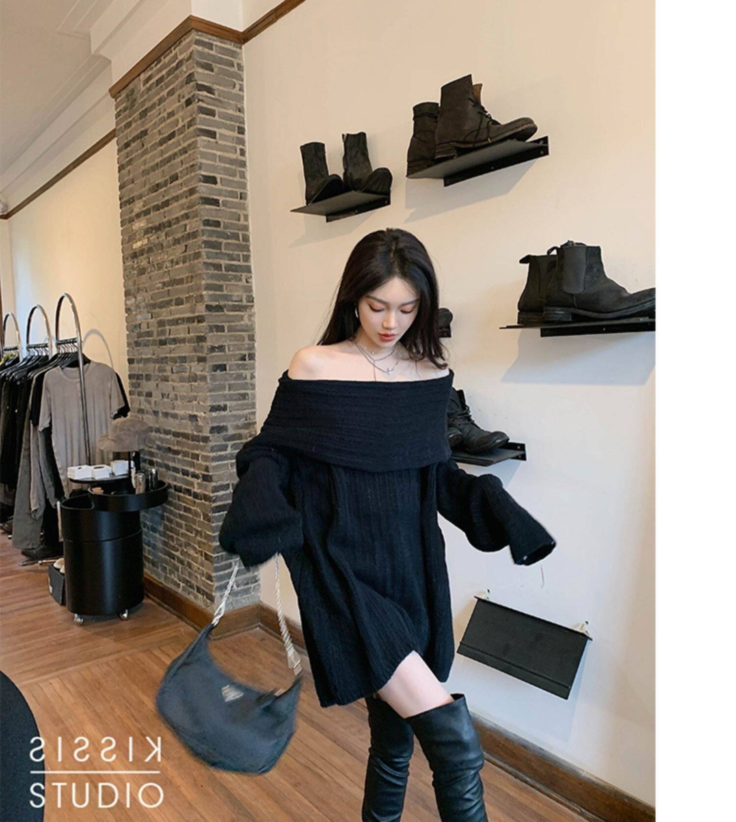春季氛圍感穿搭露肩上衣一字肩長款大毛衣秋冬女慵懶風高級感寬鬆