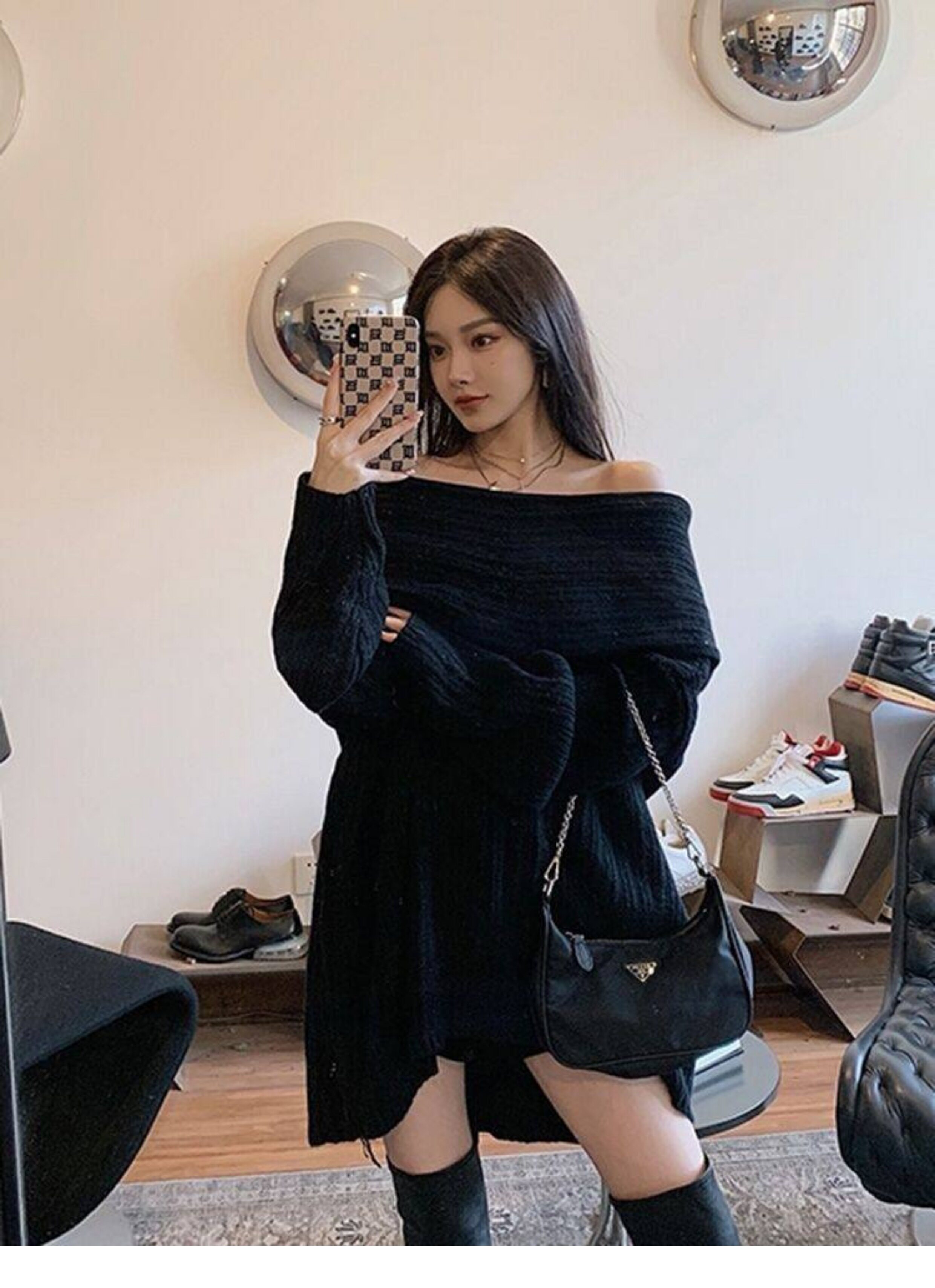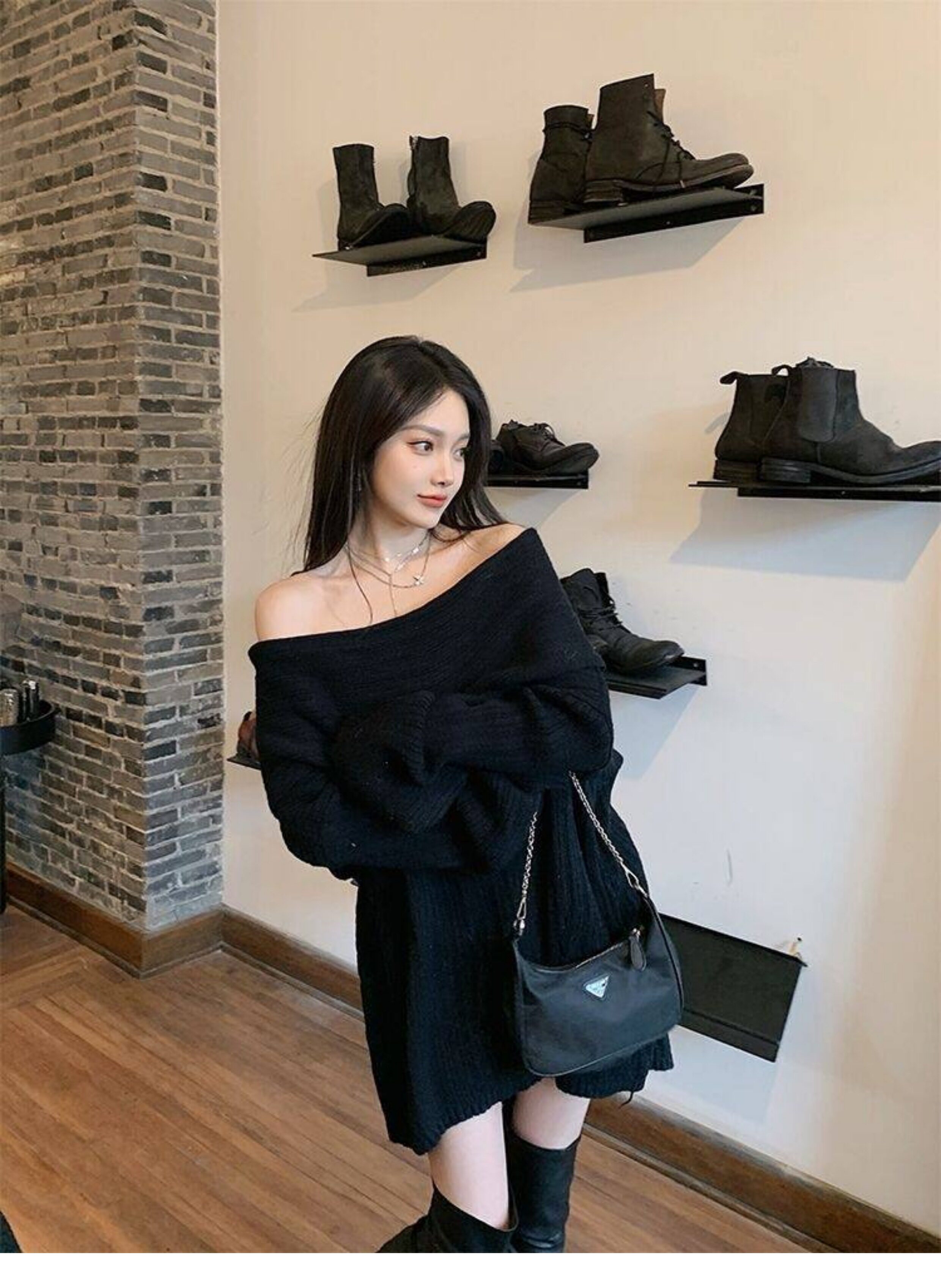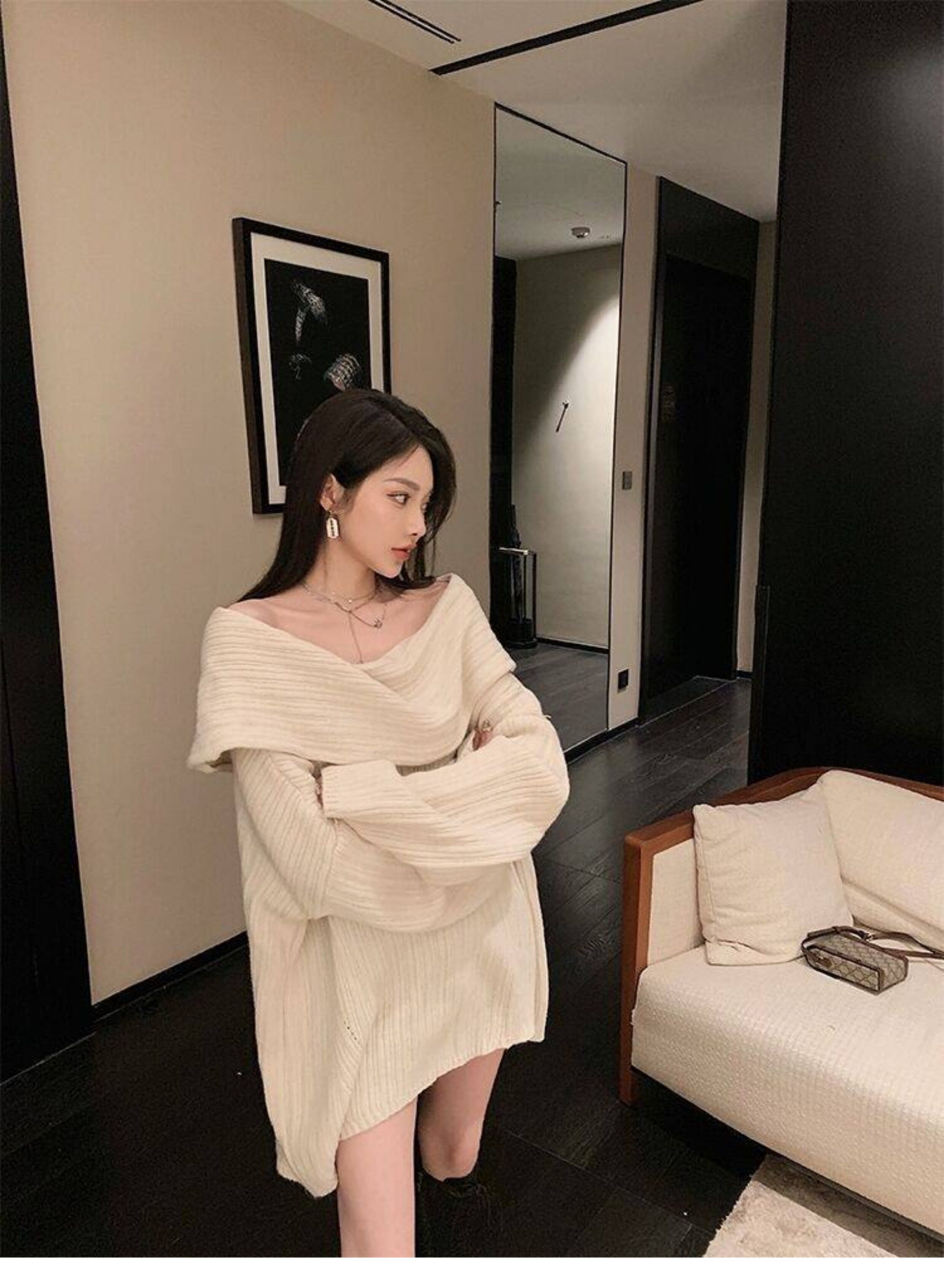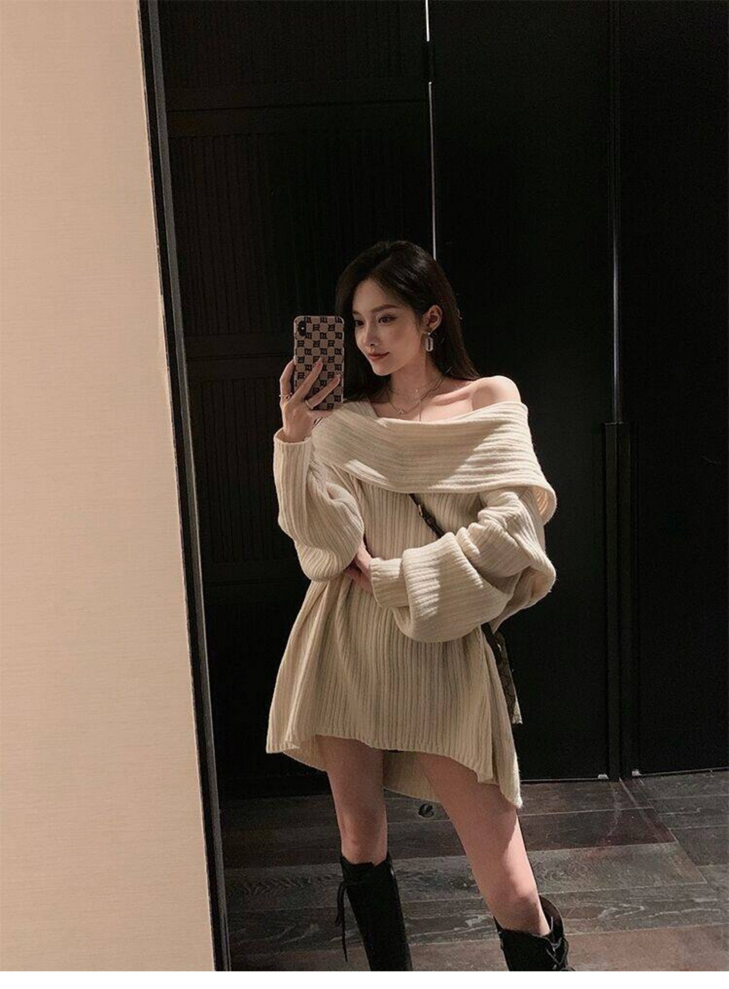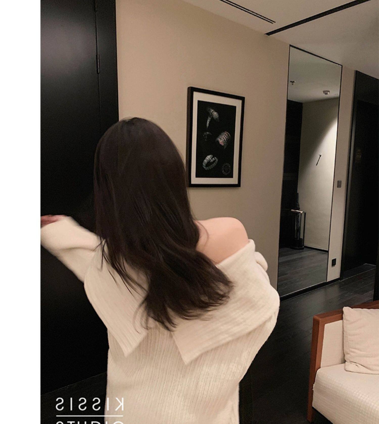 春季氛圍感穿搭露肩上衣一字肩長款大毛衣秋冬女慵懶風高級感寬鬆