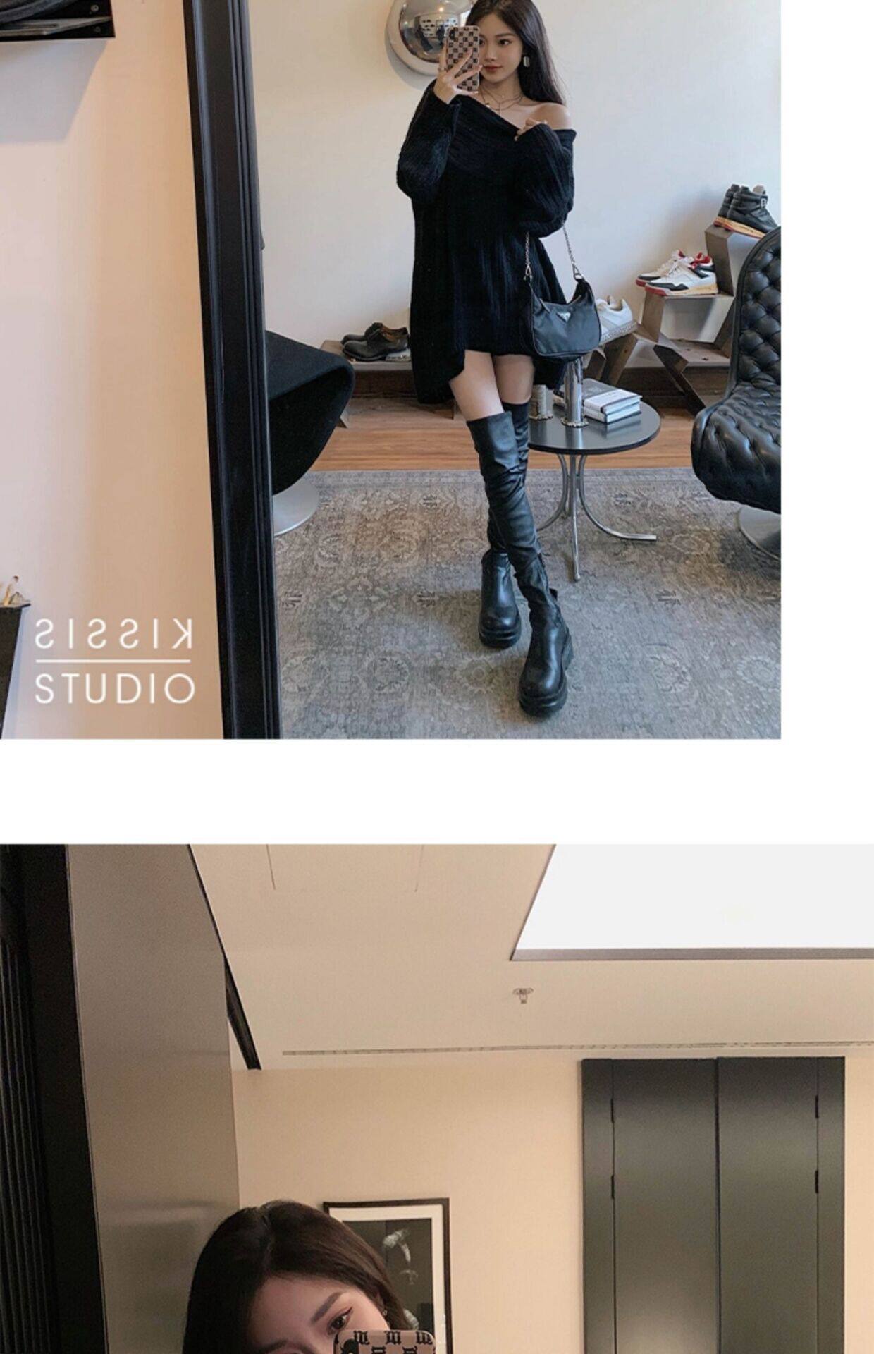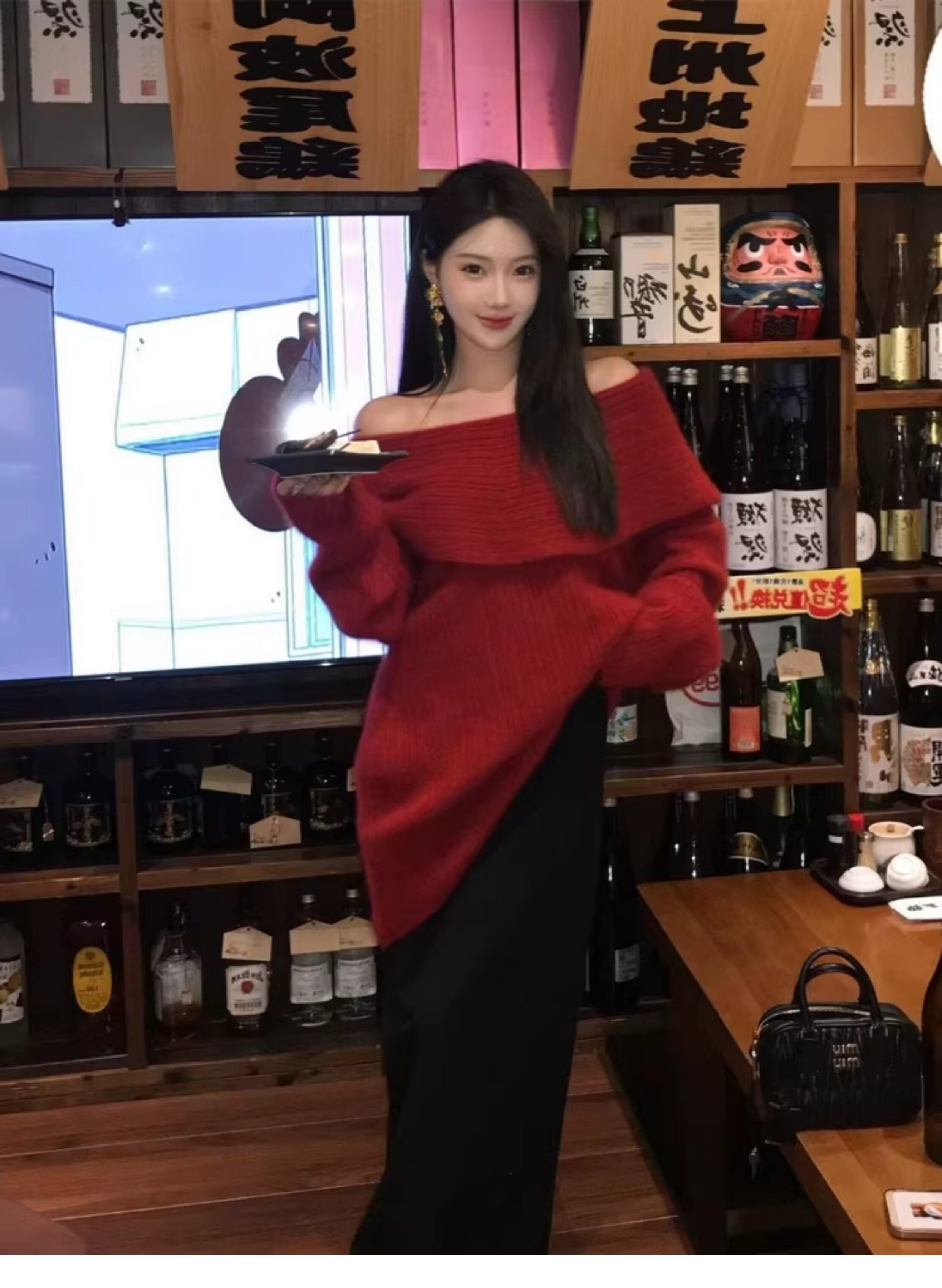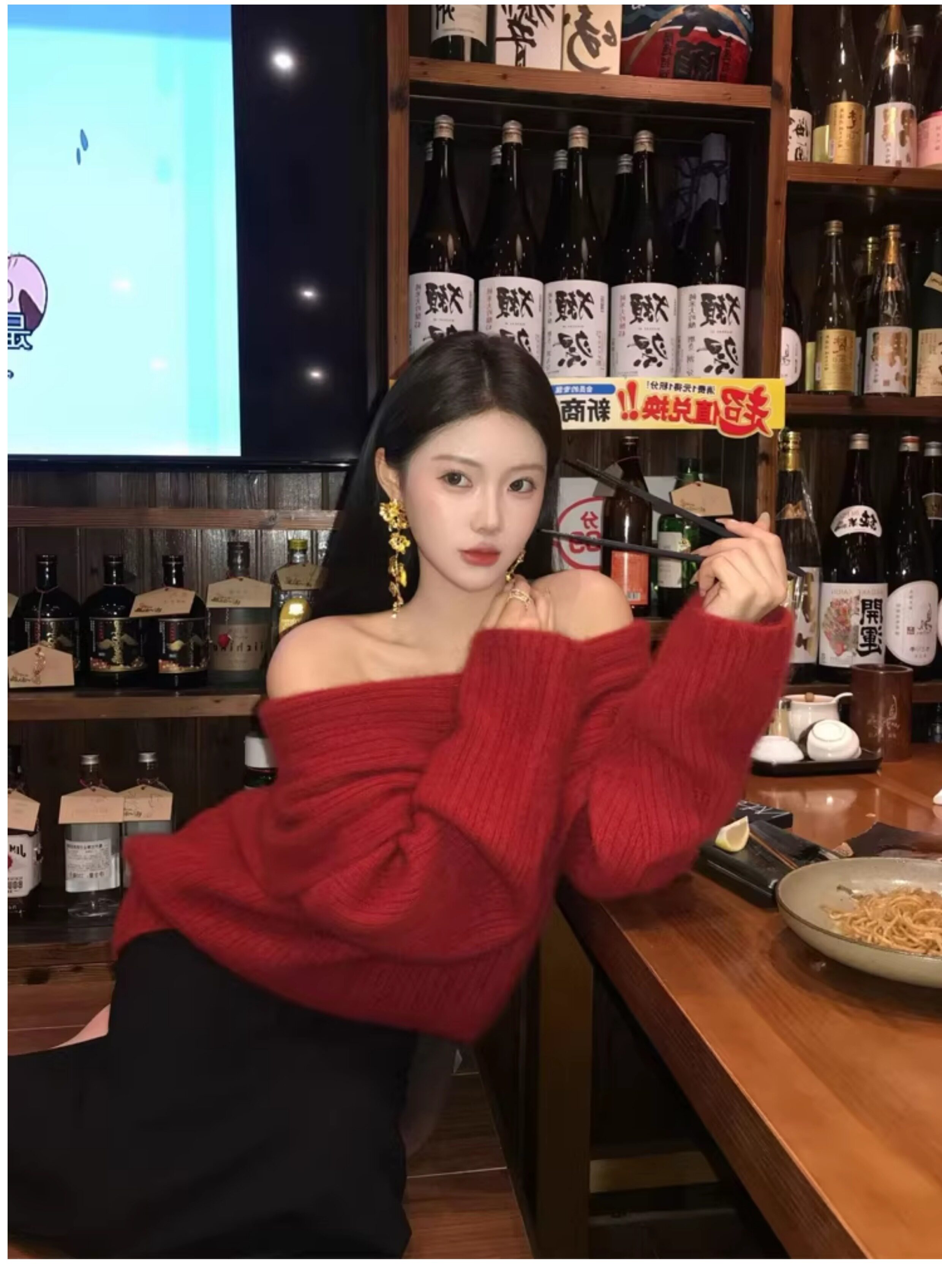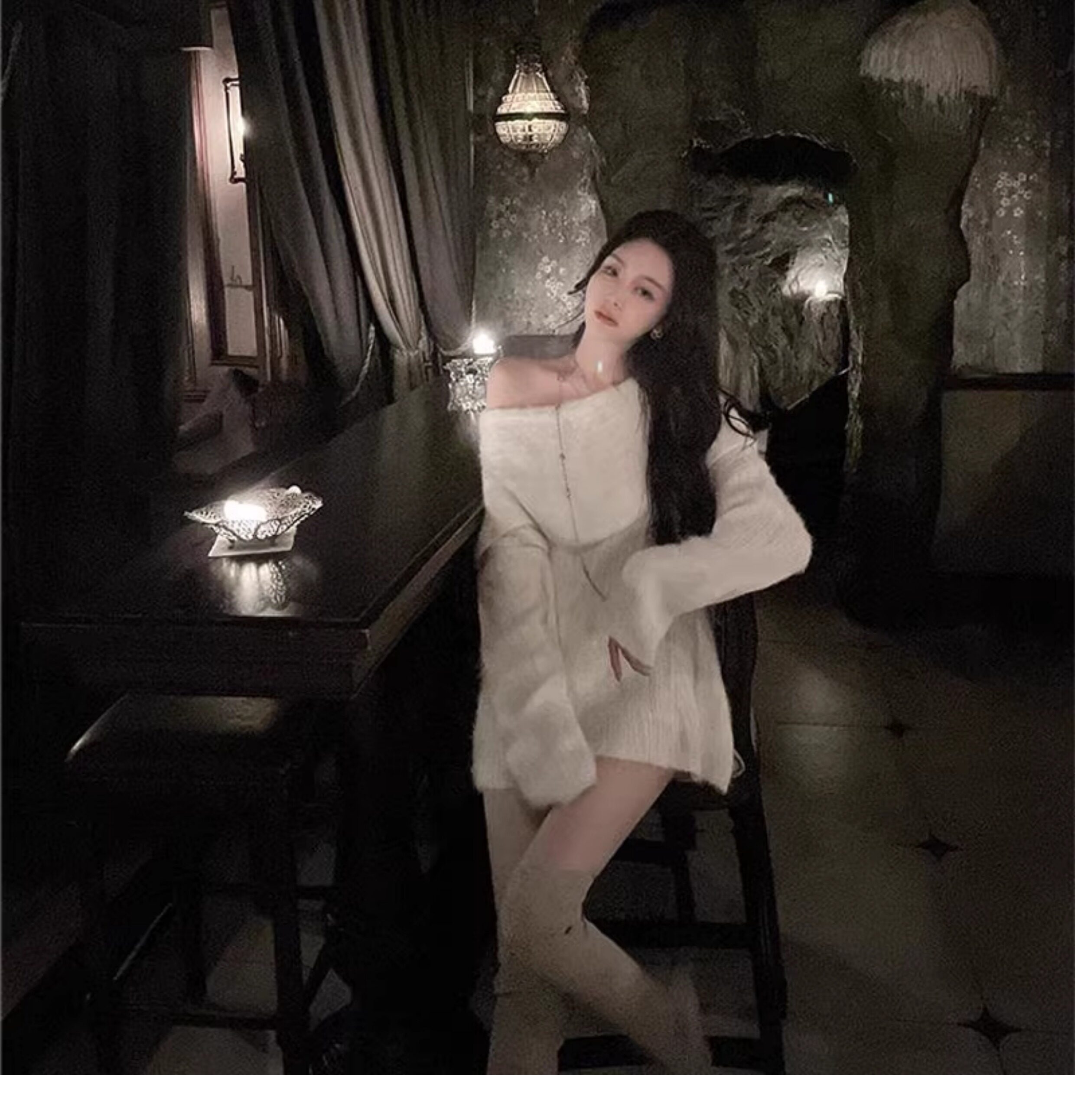 春季氛圍感穿搭露肩上衣一字肩長款大毛衣秋冬女慵懶風高級感寬鬆