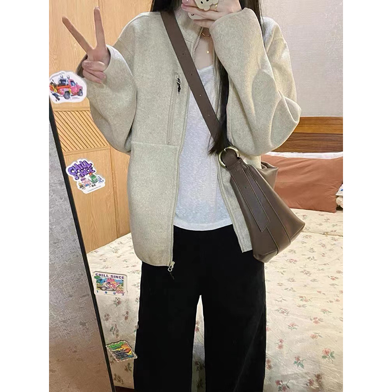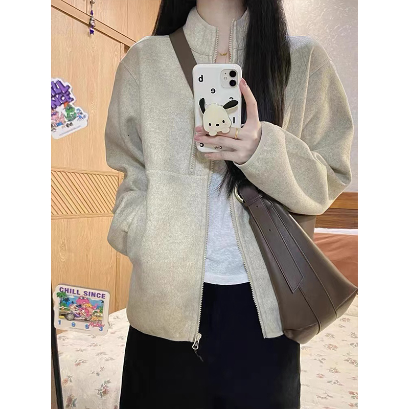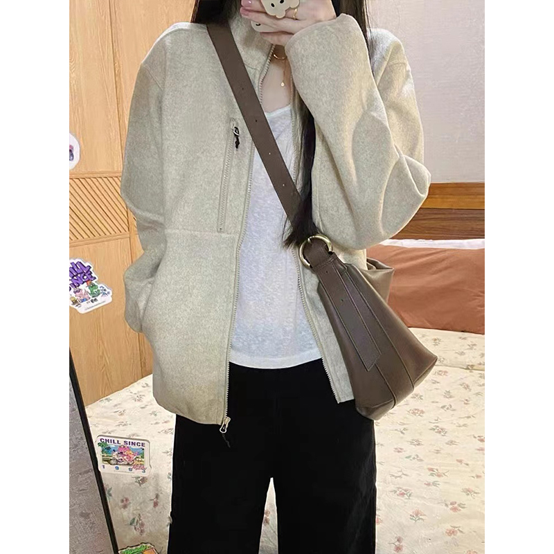 美式復古毛呢夾克女春秋季2024新款寬松休閒百搭立領衛衣開衫外套