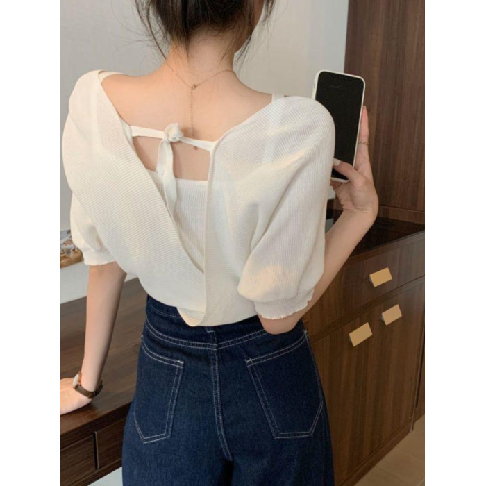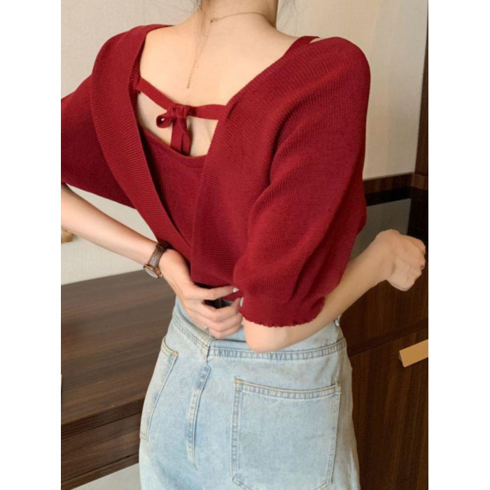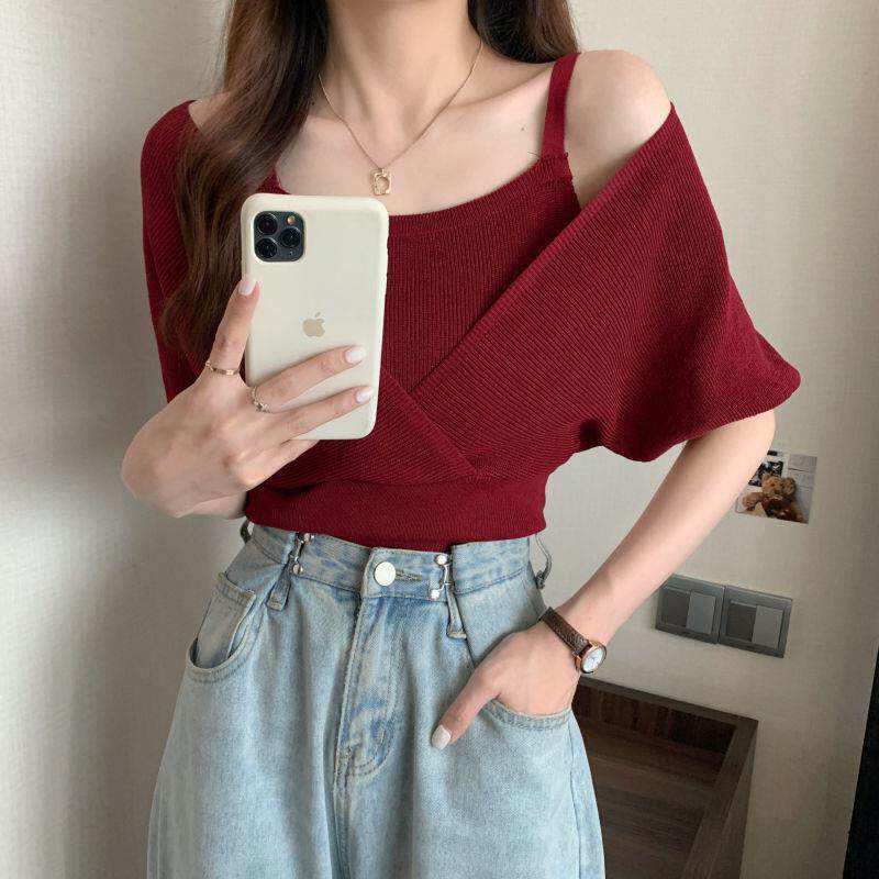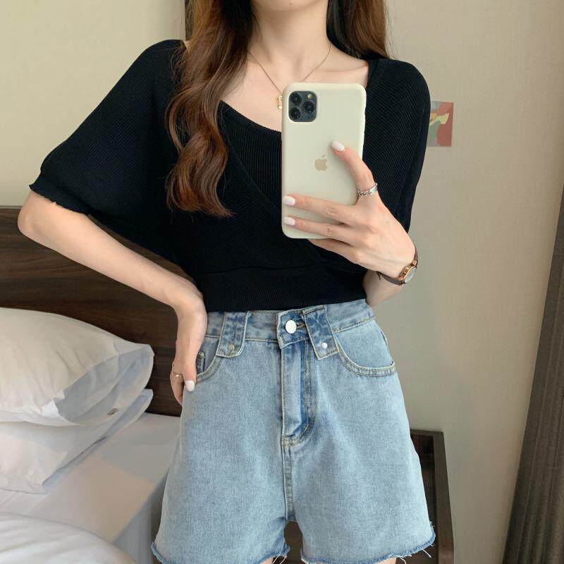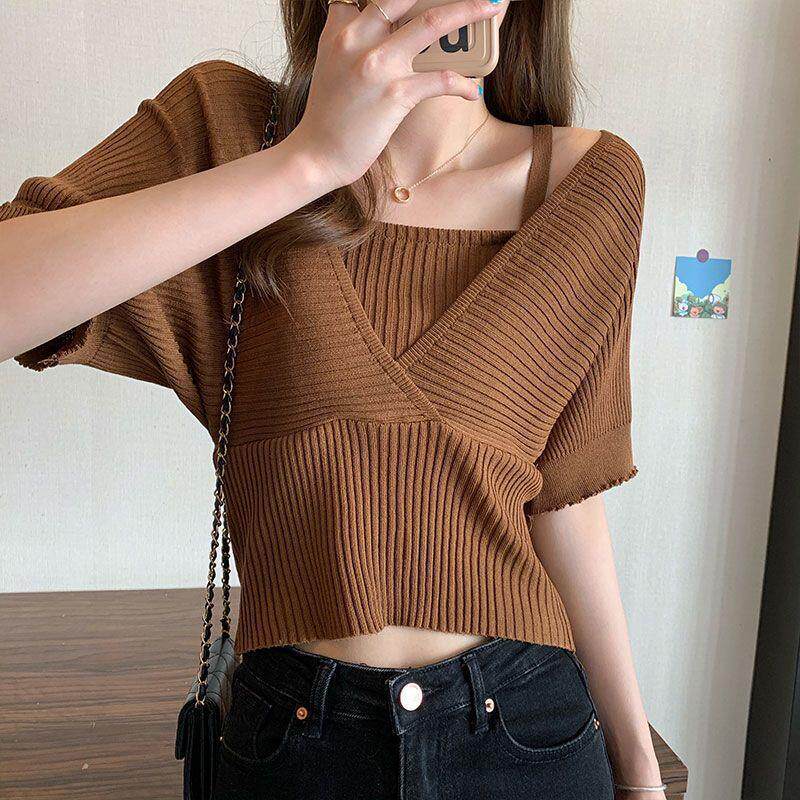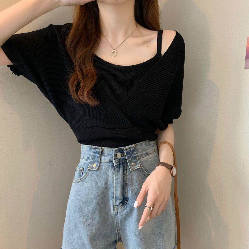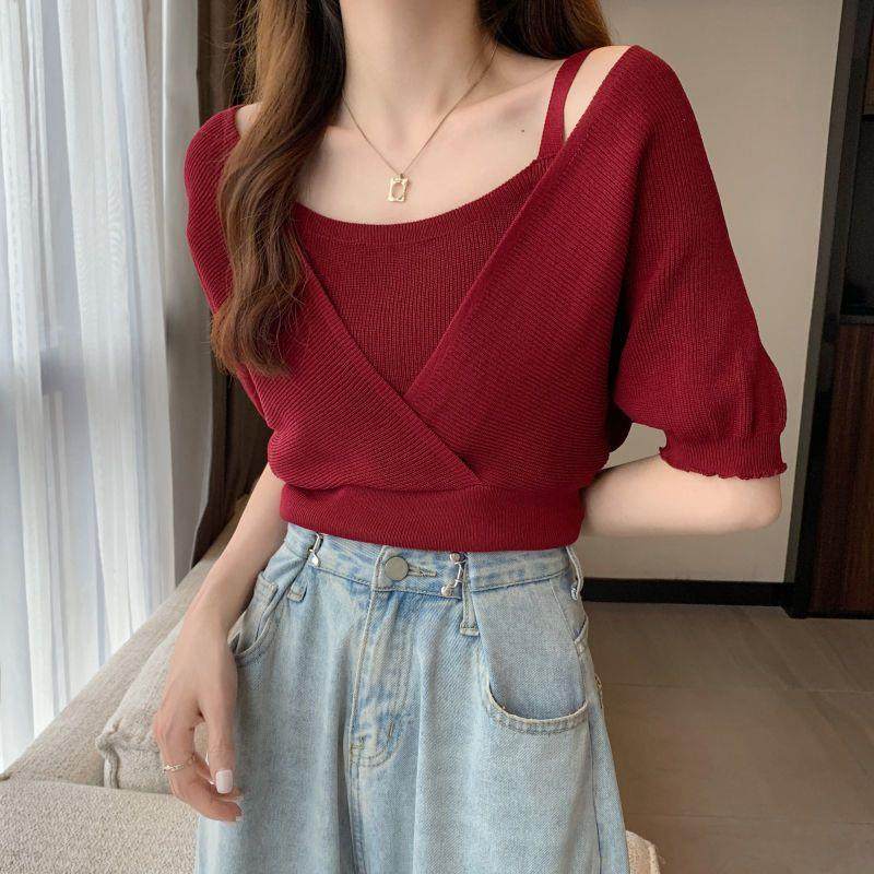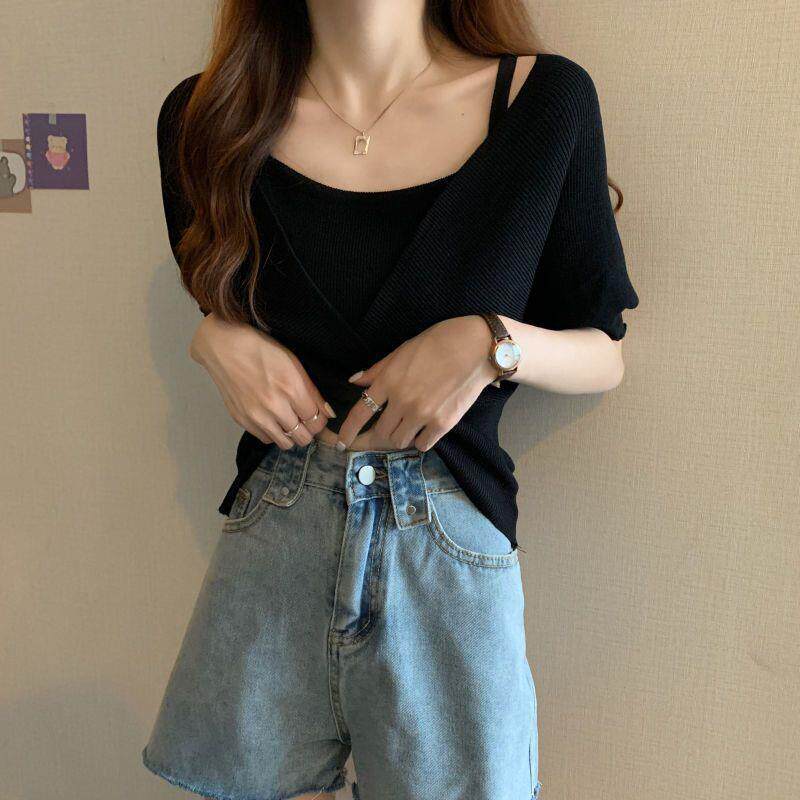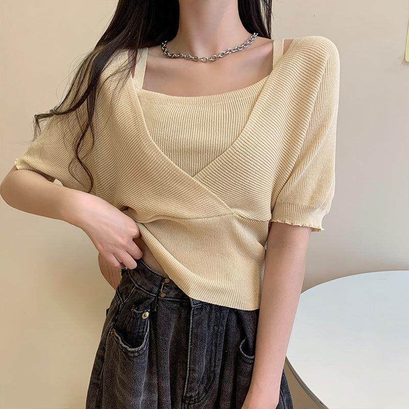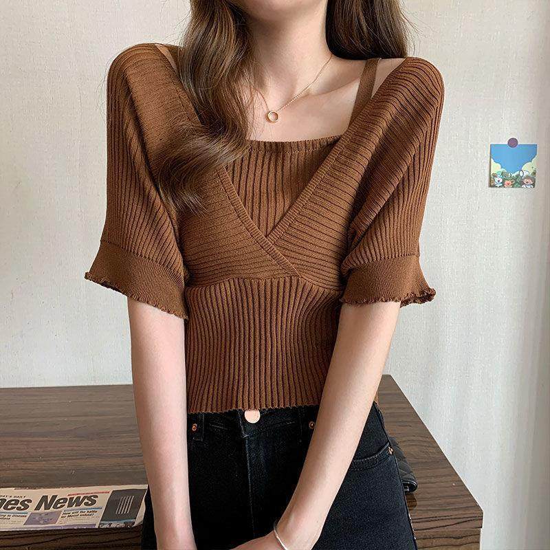 小衆假兩件洋氣收腰短袖針織衫女裝2025夏季新款修身短款打底上衣