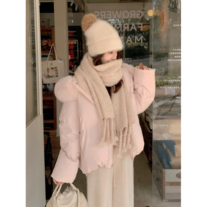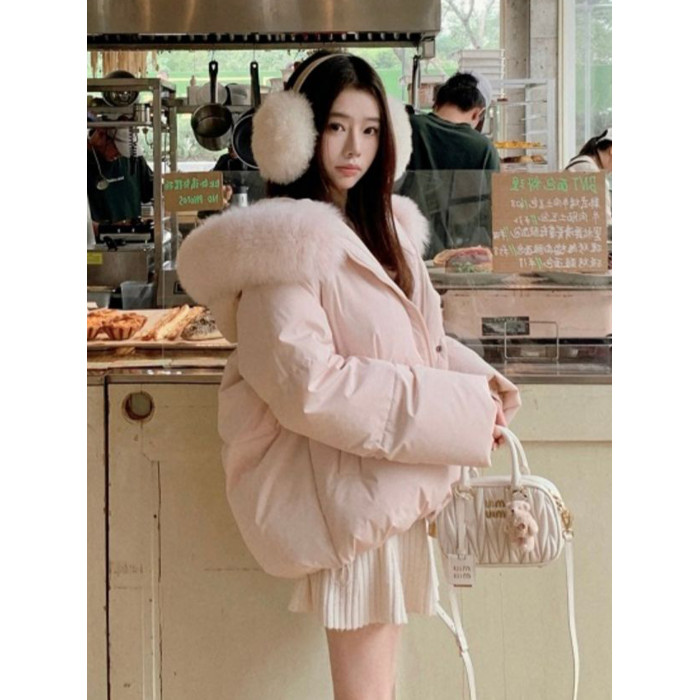 粉色羽絨服女冬季2025新款韓版寬松加厚保暖大毛領麵包服外套女款
