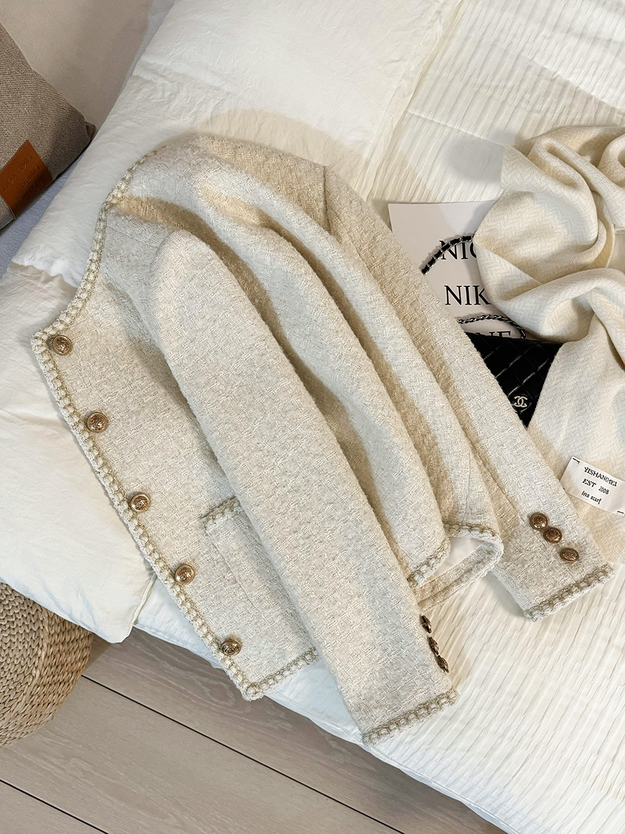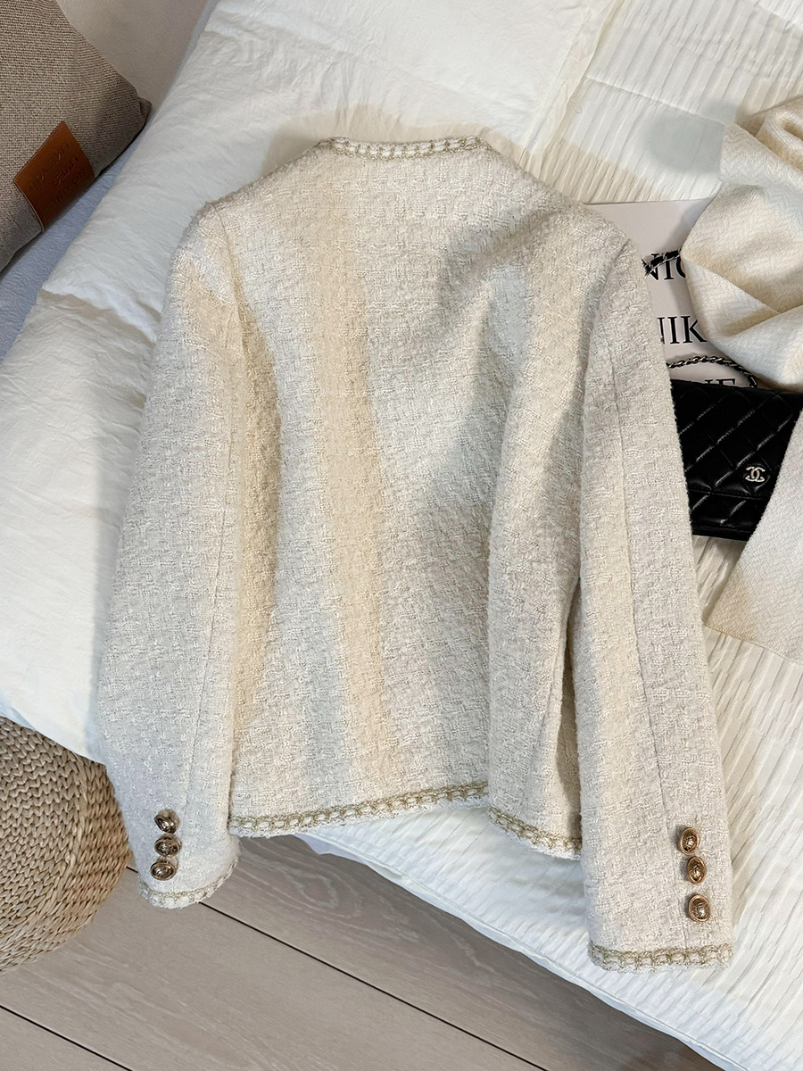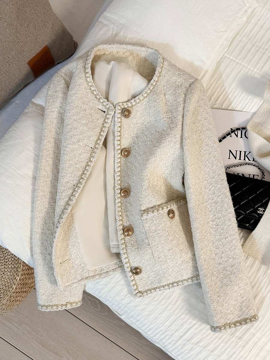 米白色氣質洋氣粗花呢小香風短外套女2025秋冬新款爆款圓領上衣潮