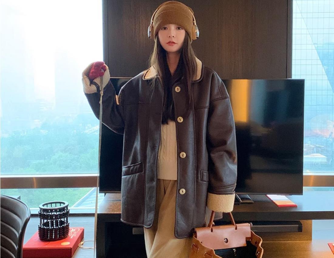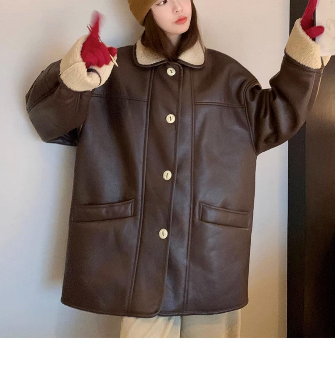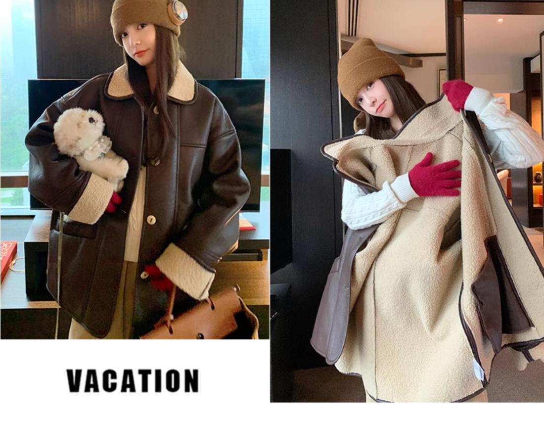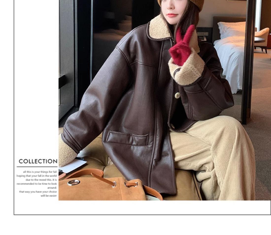 胖mm300斤大碼復古羊羔毛外套女秋冬寬松撞色加厚皮毛一體機車服