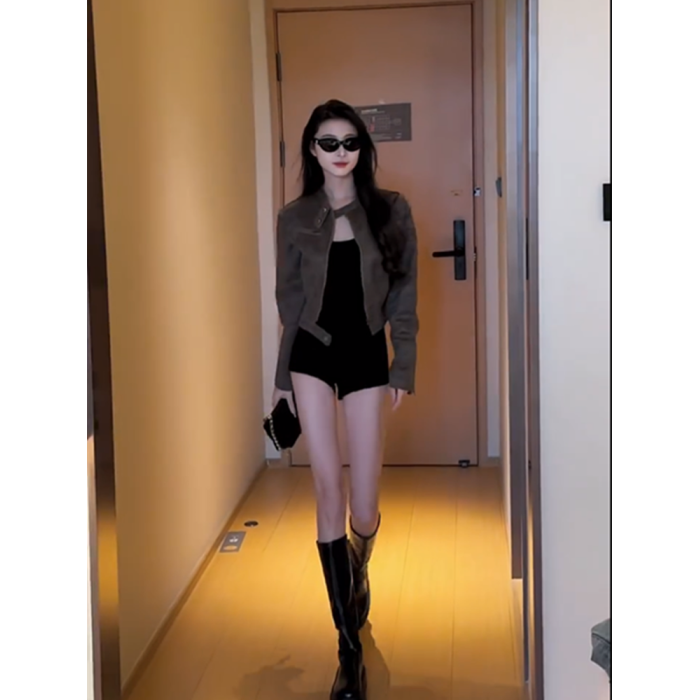 秋季復古風氣質做舊美式短款拉鍊長袖小皮衣小個子禦姐風夾克外套