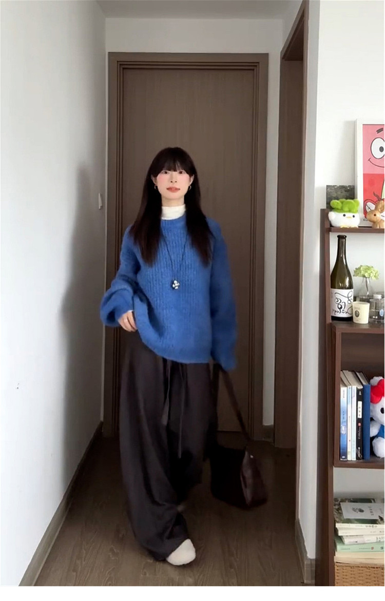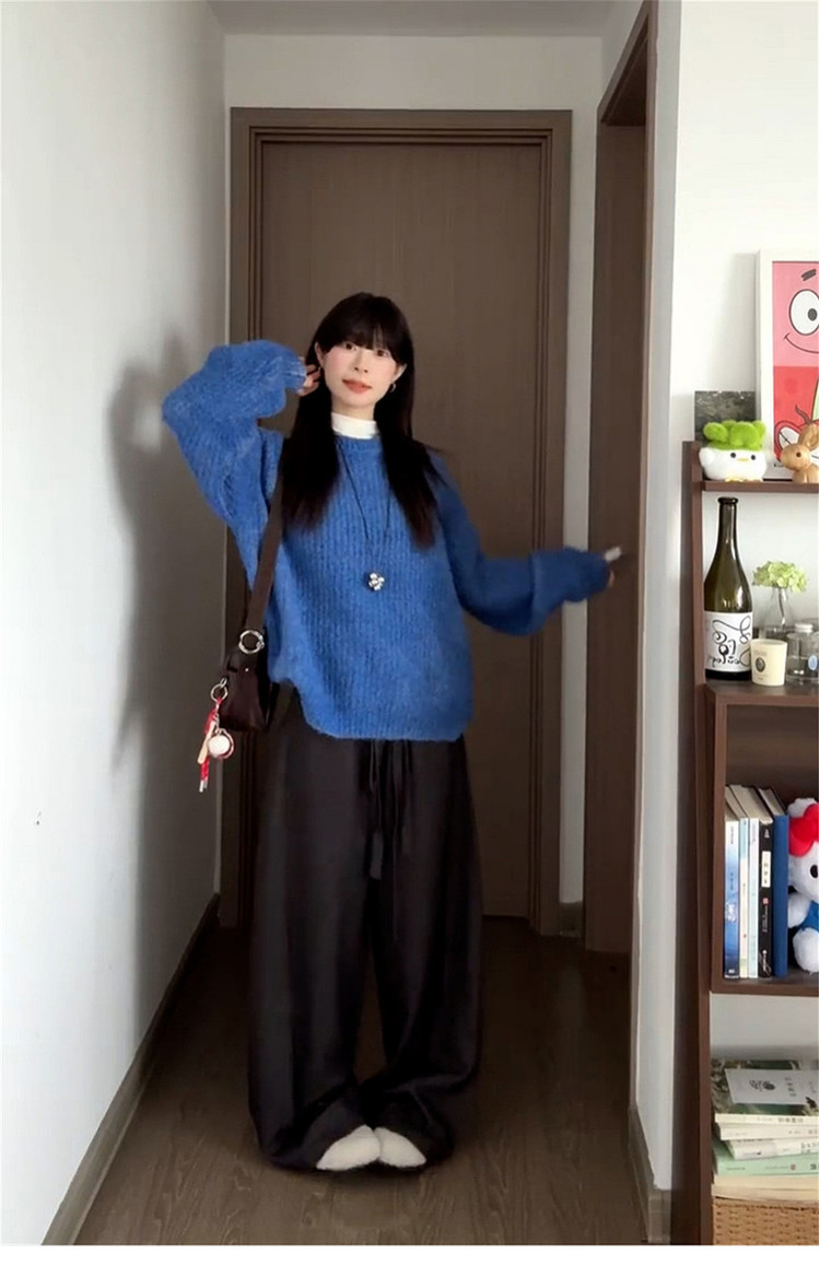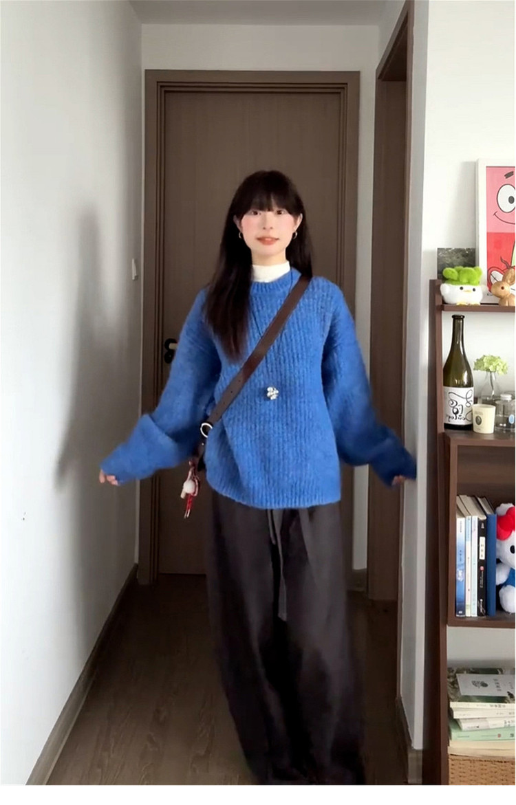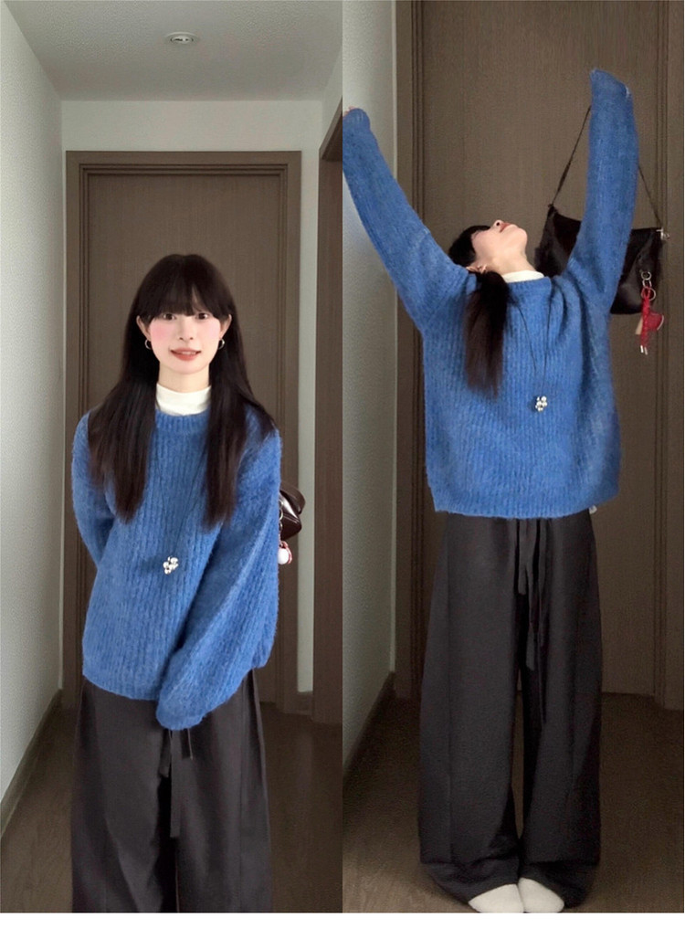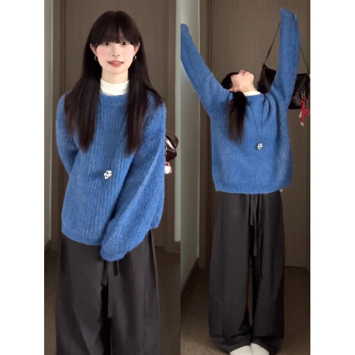 藍色圓領套頭毛衣女秋冬2025新款韓系巨好看慵懶松弛感針織衫上衣