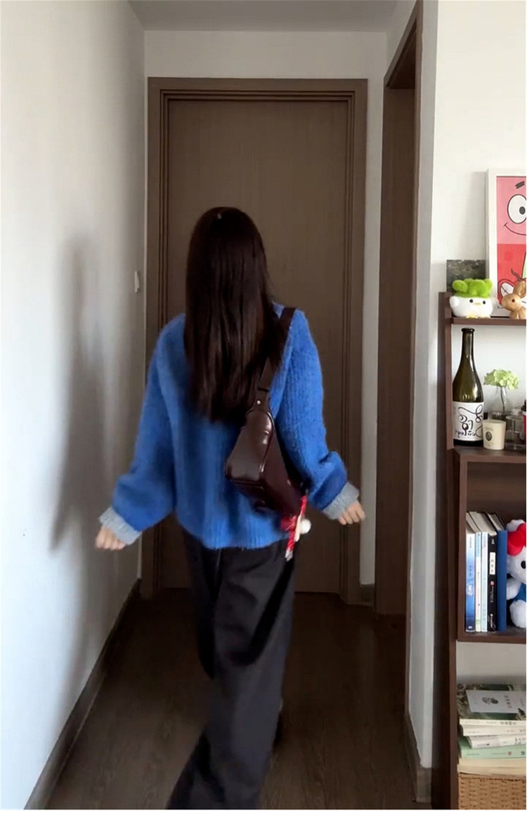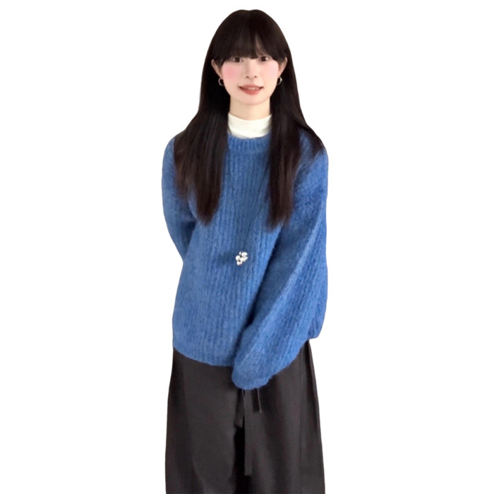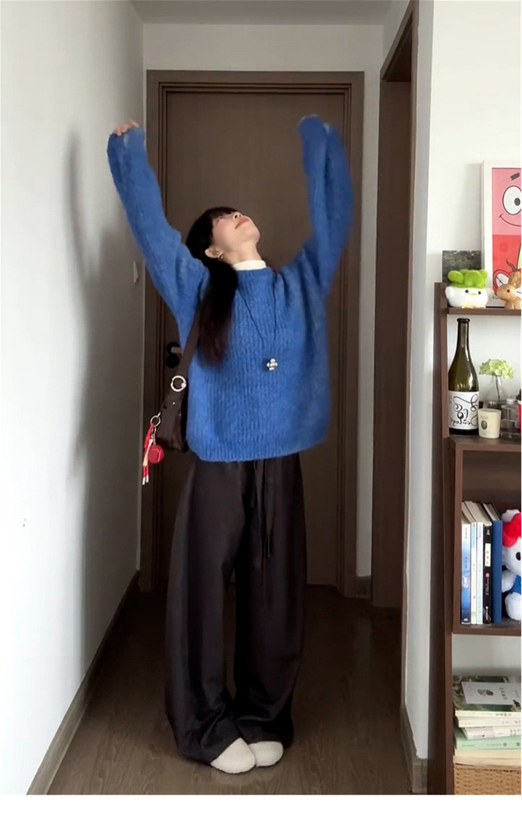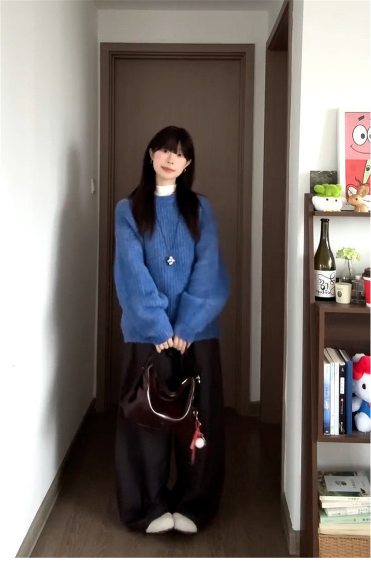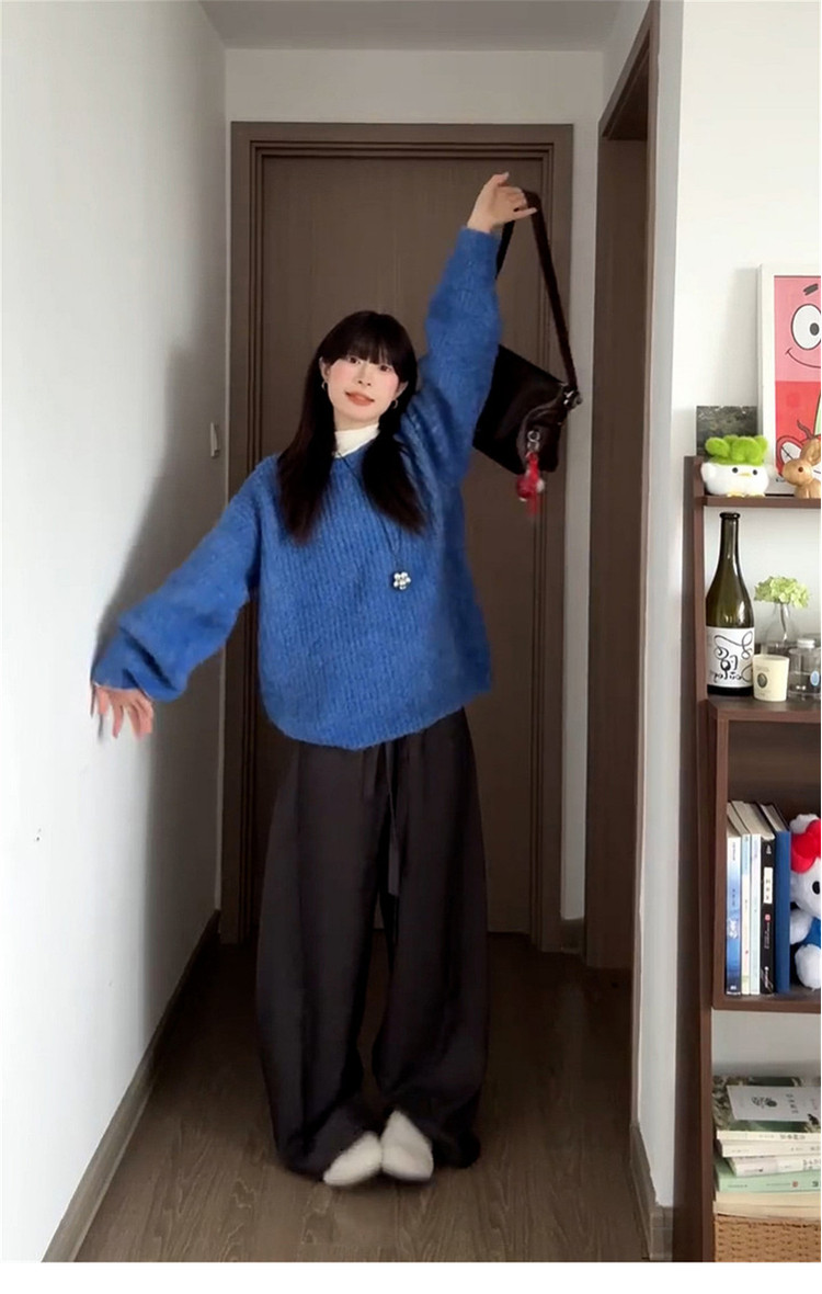 藍色圓領套頭毛衣女秋冬2025新款韓系巨好看慵懶松弛感針織衫上衣
