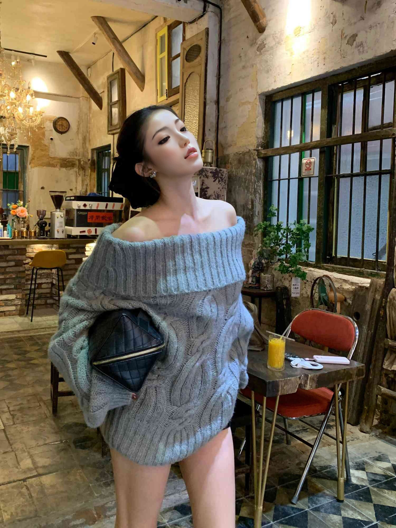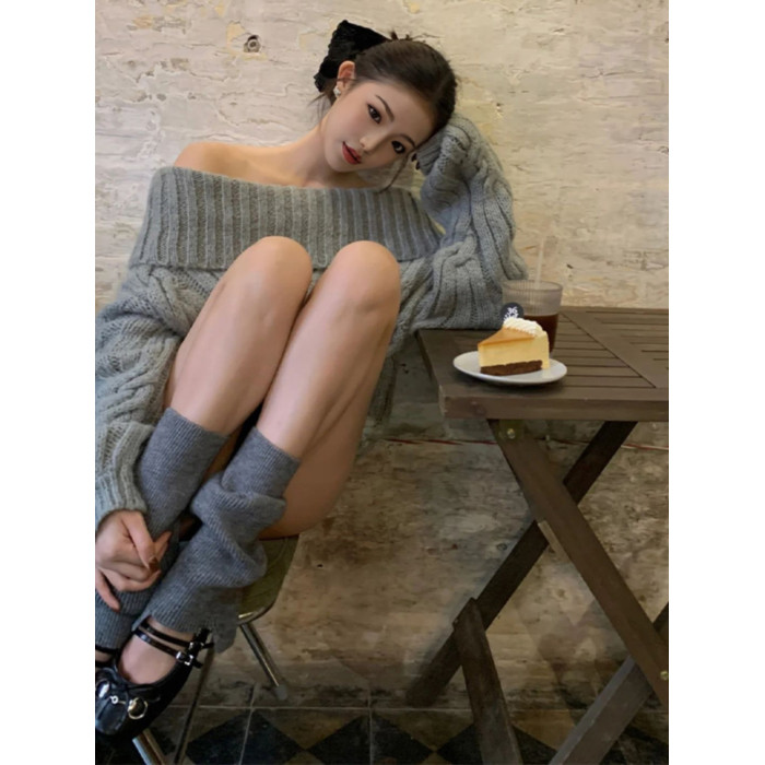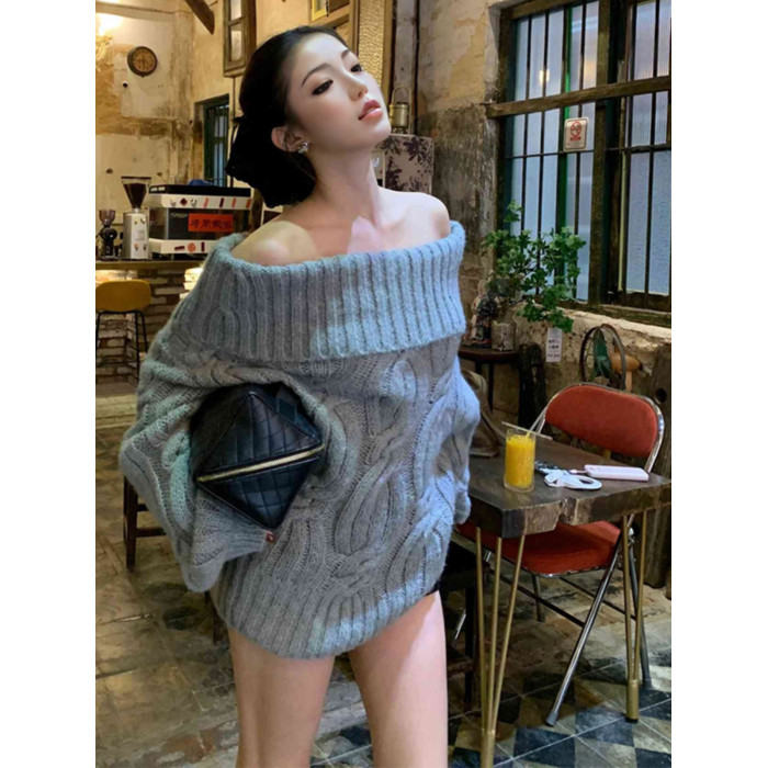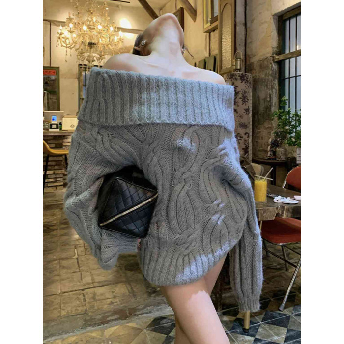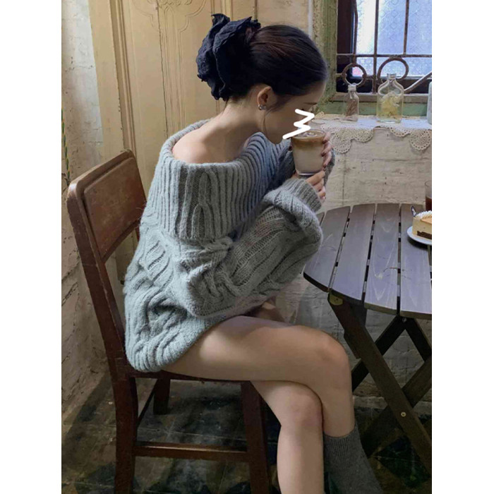 慵懶風韓系灰色針織毛衣女春冬一字肩獨特設計感寬松復古長袖上衣