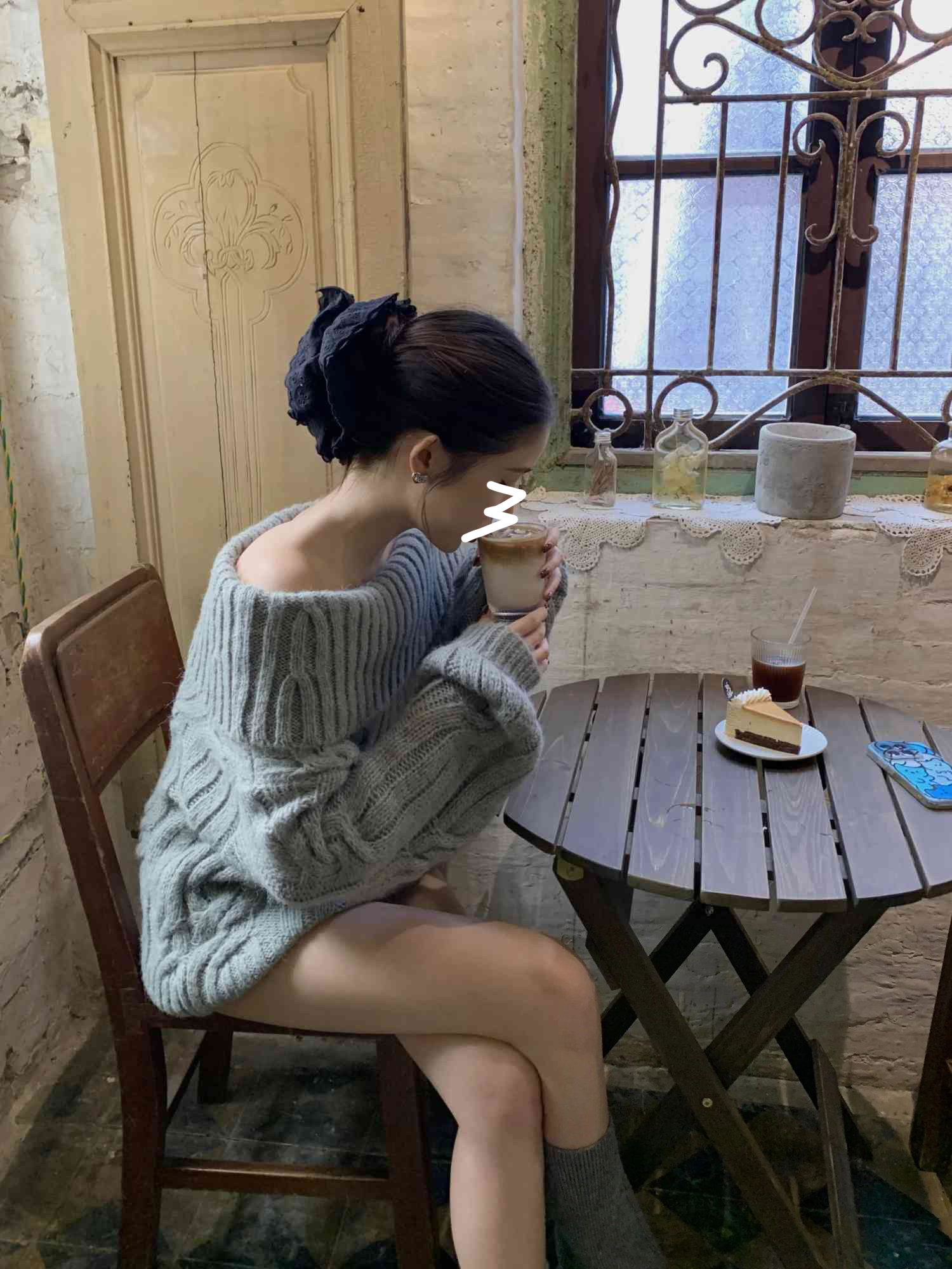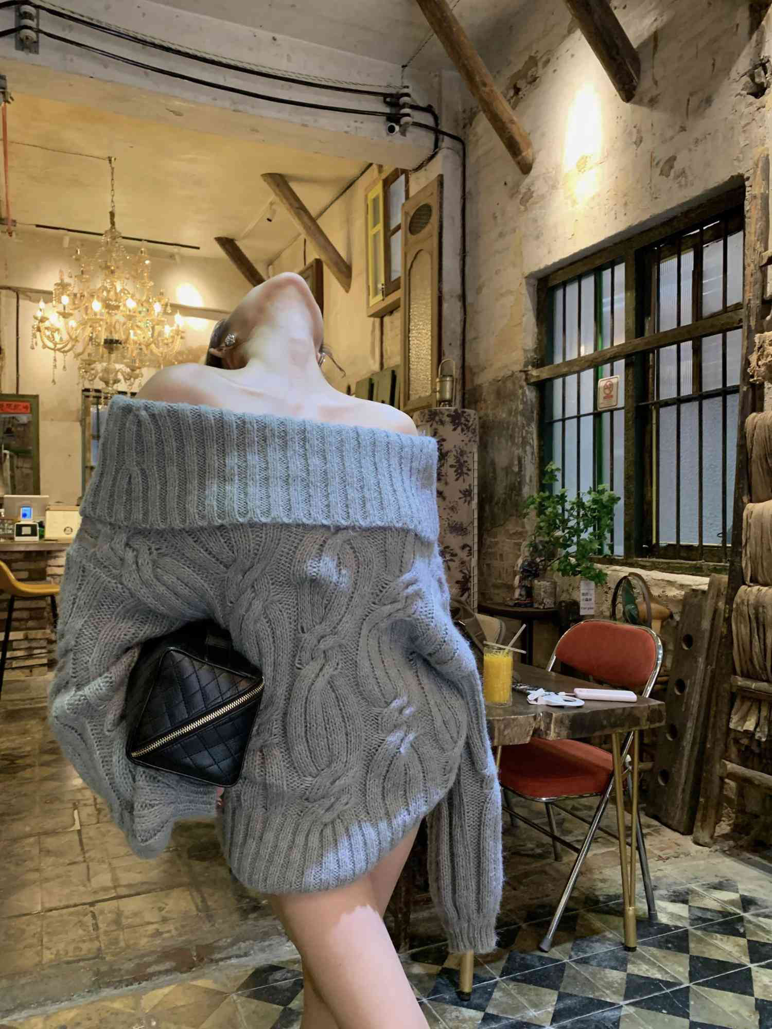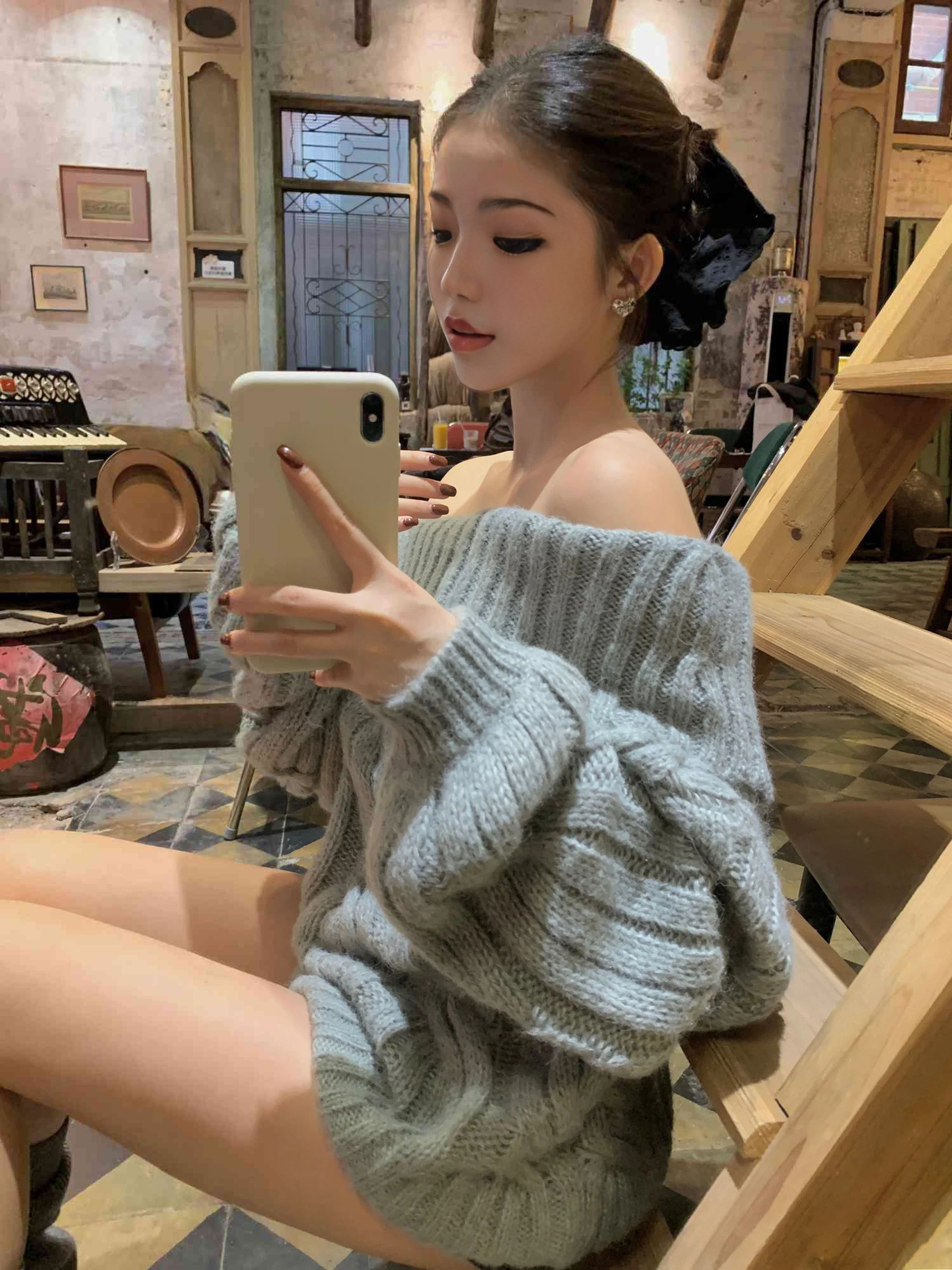 慵懶風韓系灰色針織毛衣女春冬一字肩獨特設計感寬松復古長袖上衣