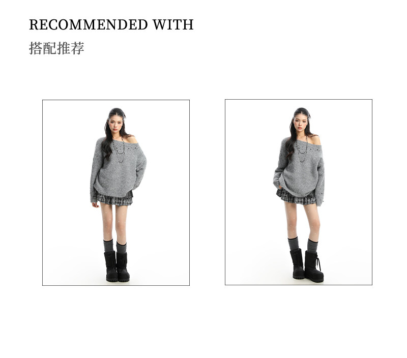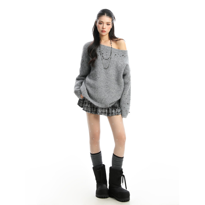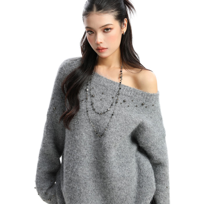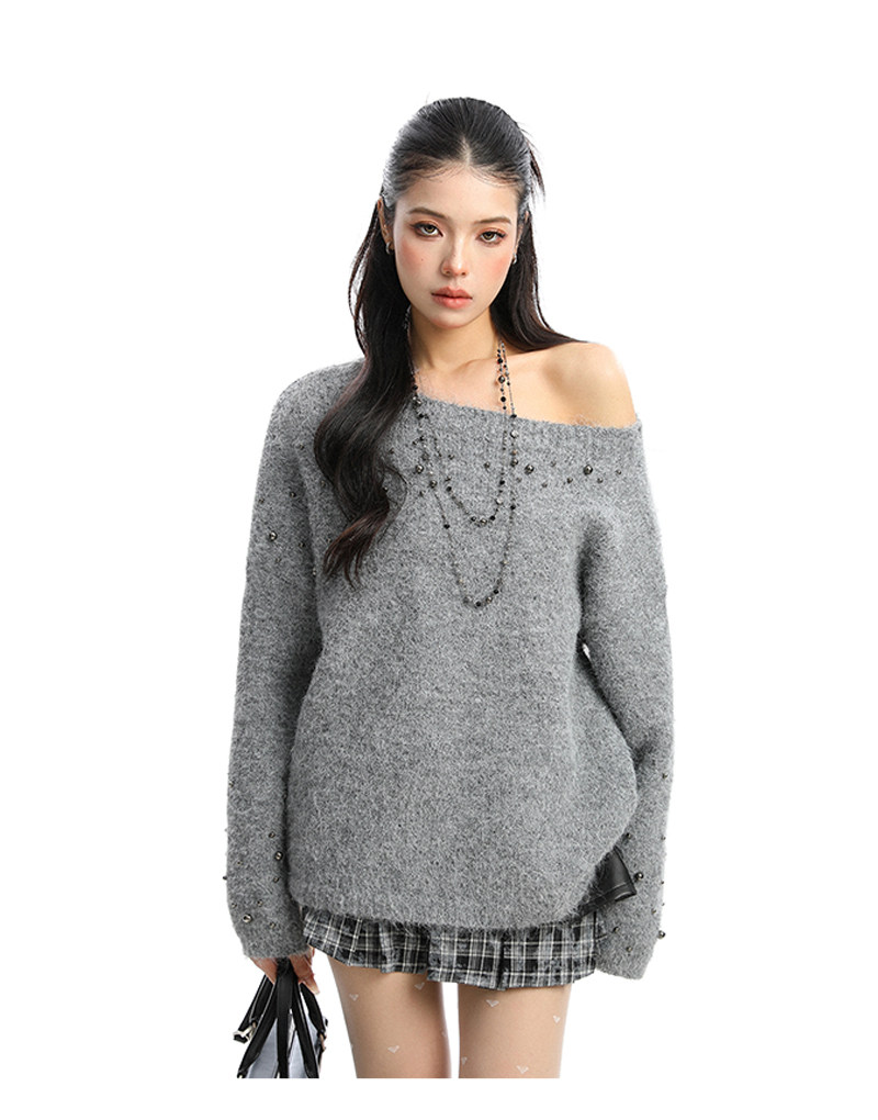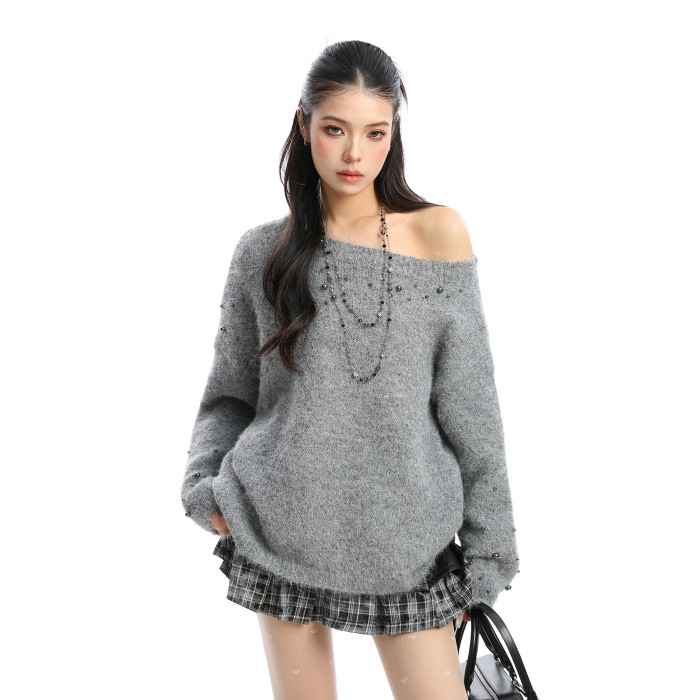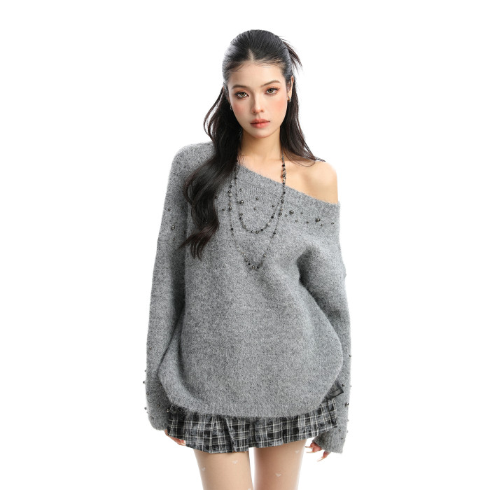 BIGGOLD韓系柳釘珍珠斜肩毛衣女秋冬慵懶感軟糯針織衫寬松上衣ins