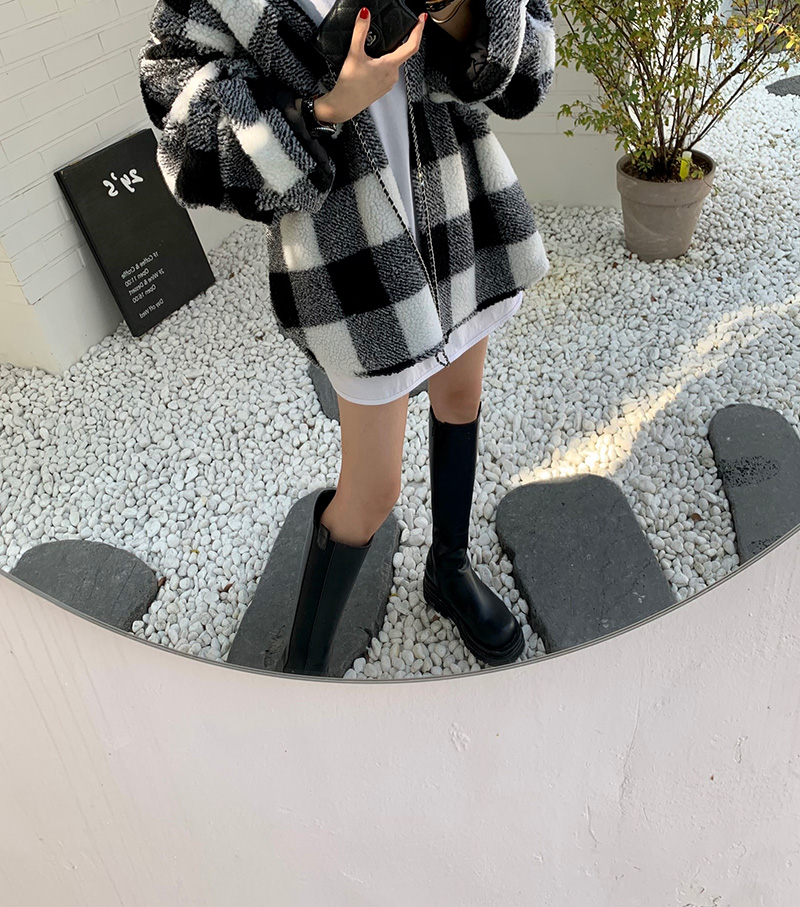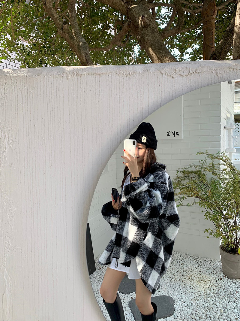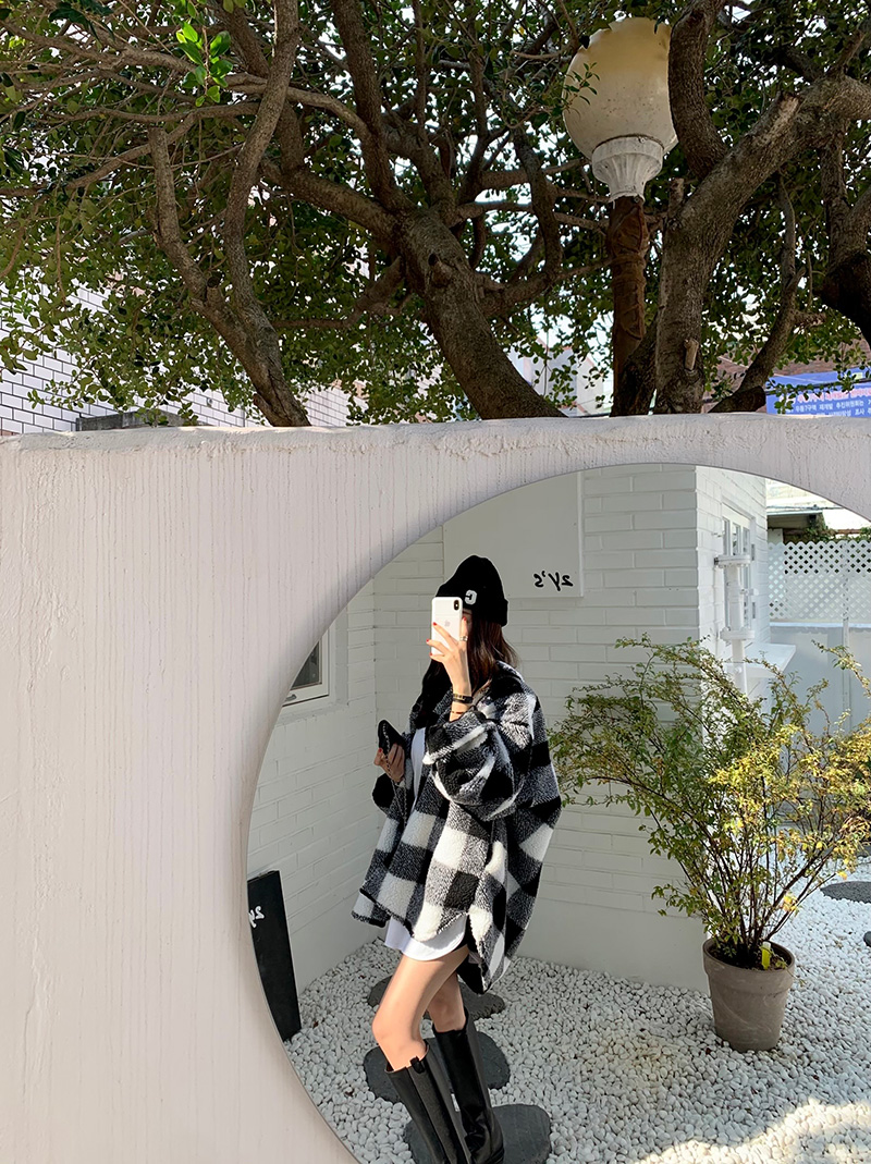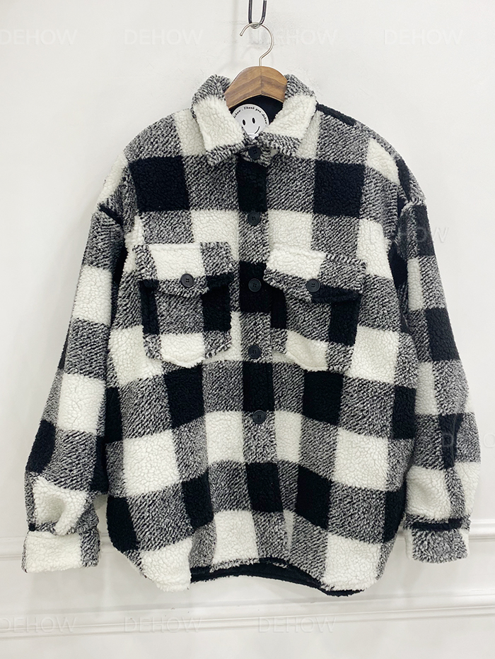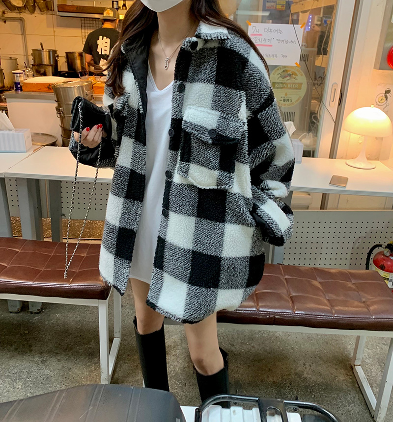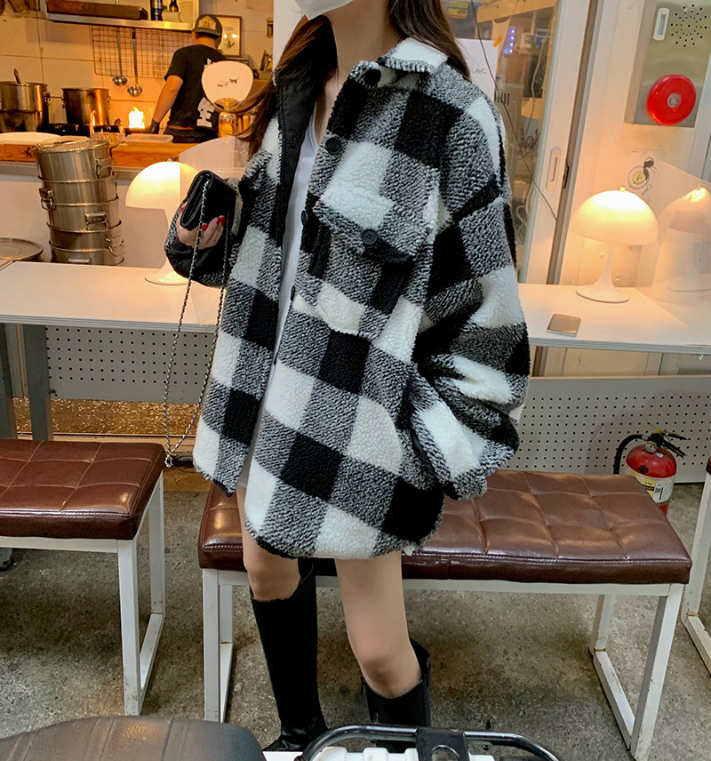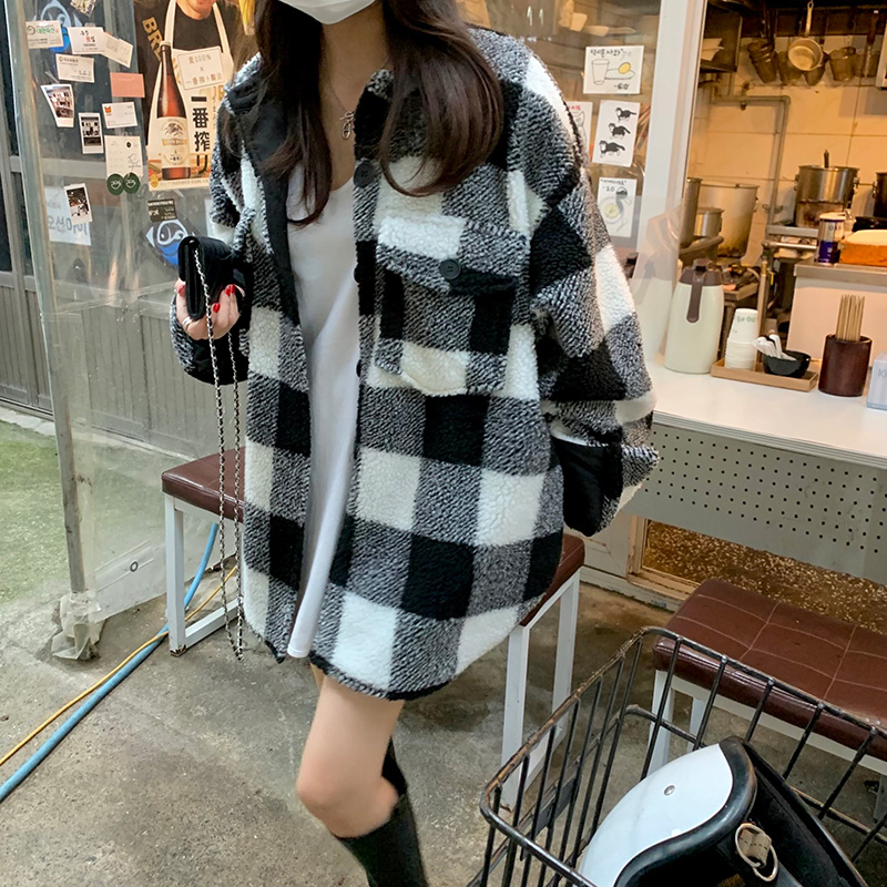 韓國翻領格子毛呢外套女冬加厚慵懶風寬松百搭系釦羊羔毛棉服保暖