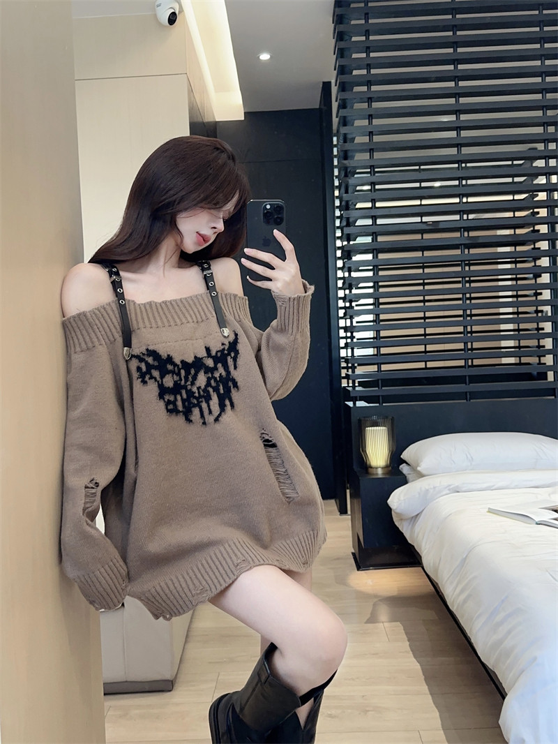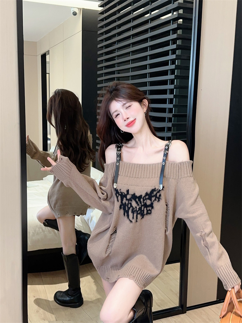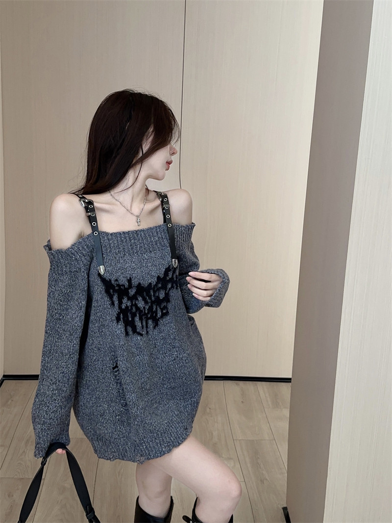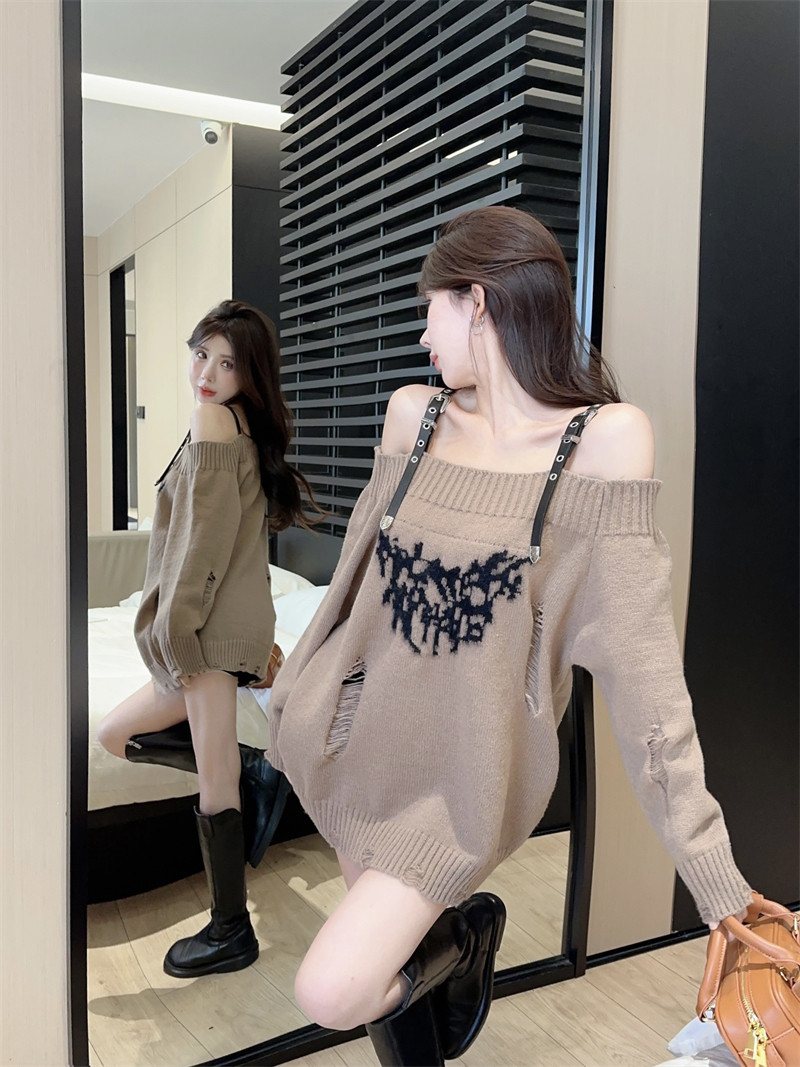 廢土風毛衣女秋季純欲辣妹一字肩吊帶上衣中長款高級感針織衫外套