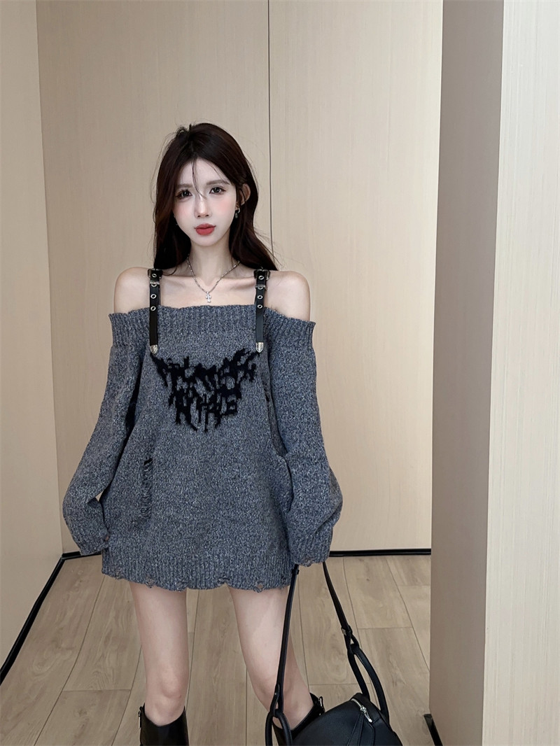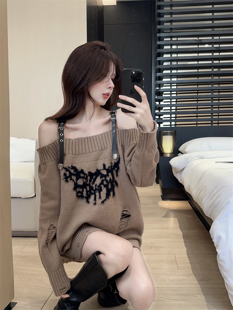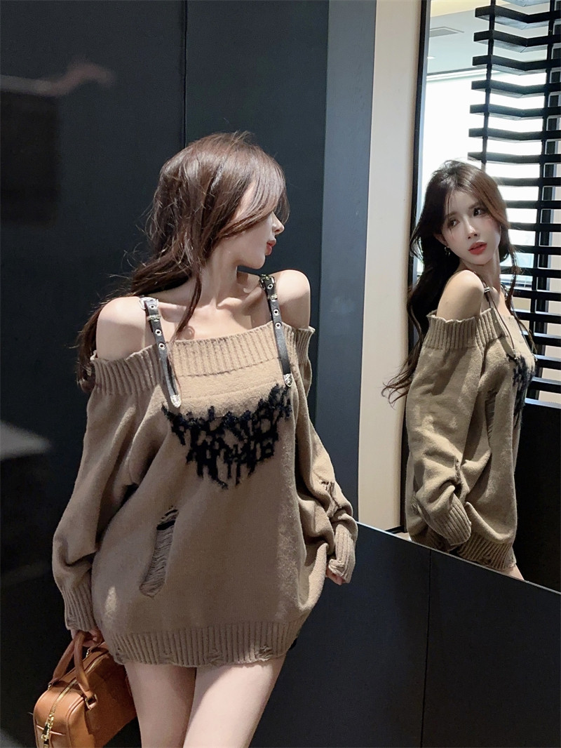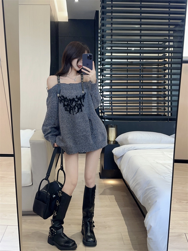 廢土風毛衣女秋季純欲辣妹一字肩吊帶上衣中長款高級感針織衫外套