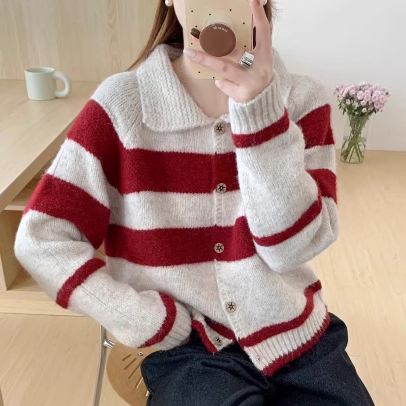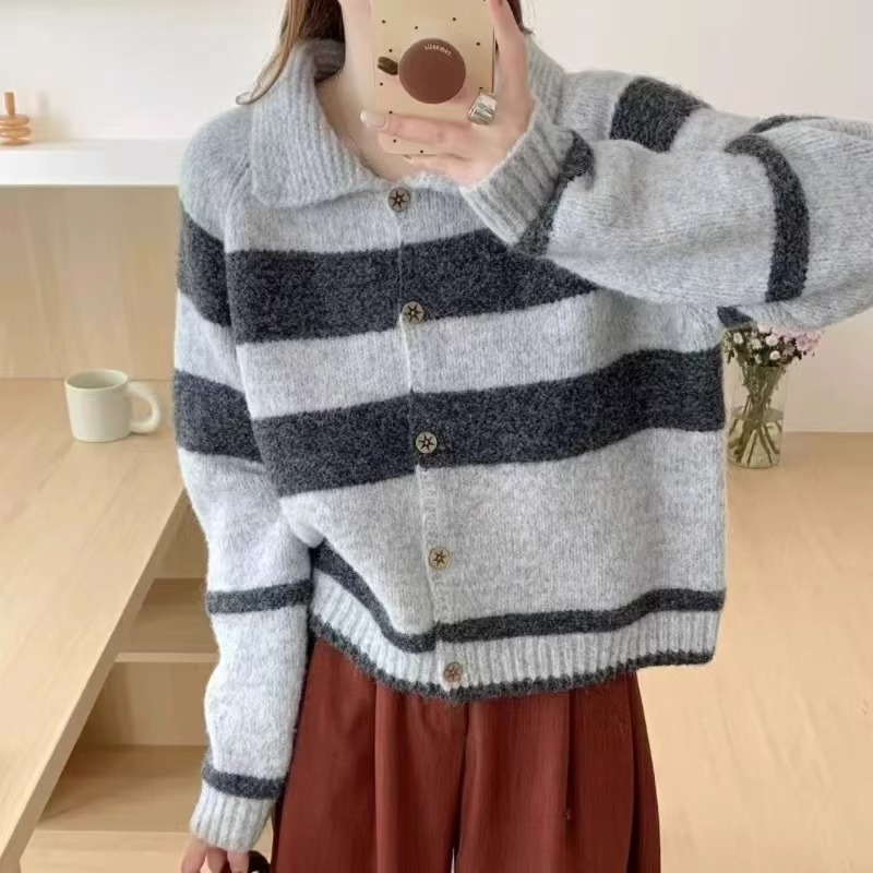 韓系復古撞色條紋翻領毛衣開衫外套女秋冬寬松慵懶風小個子針織衫