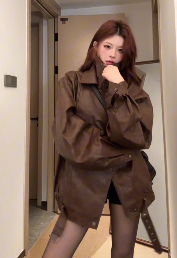 復古高級感PU皮衣外套女2025春秋季新款寬松棕色機車服夾克上衣潮