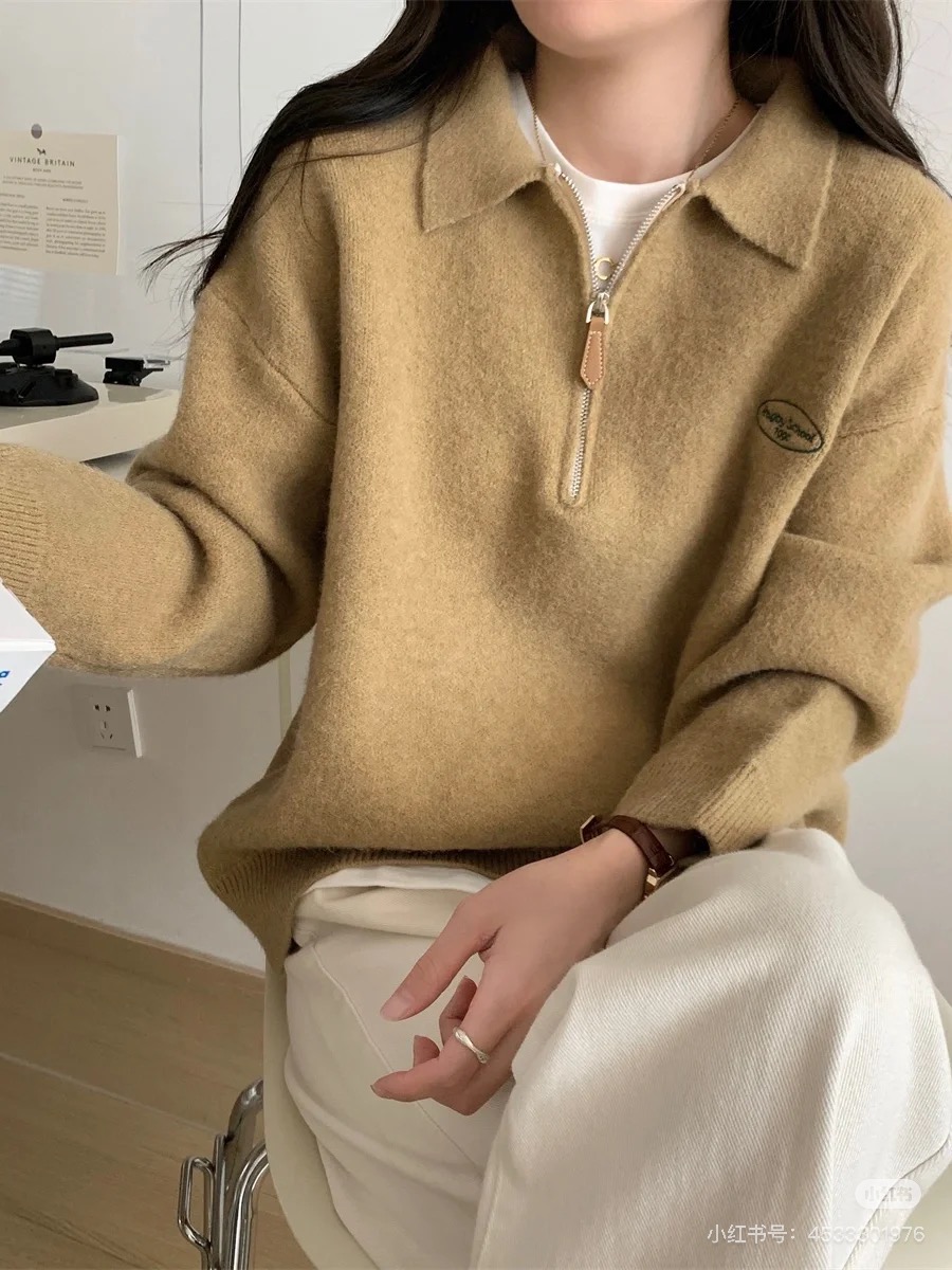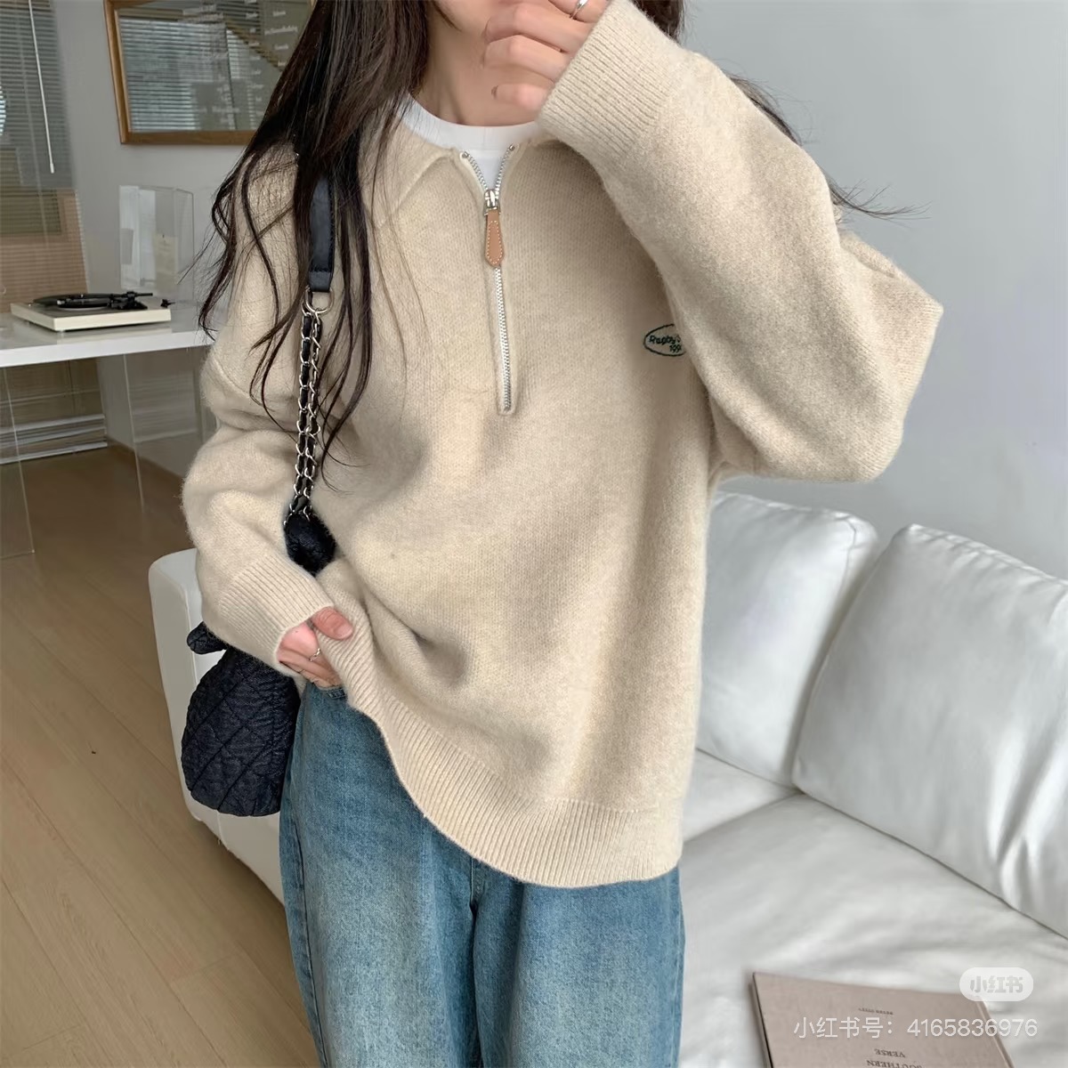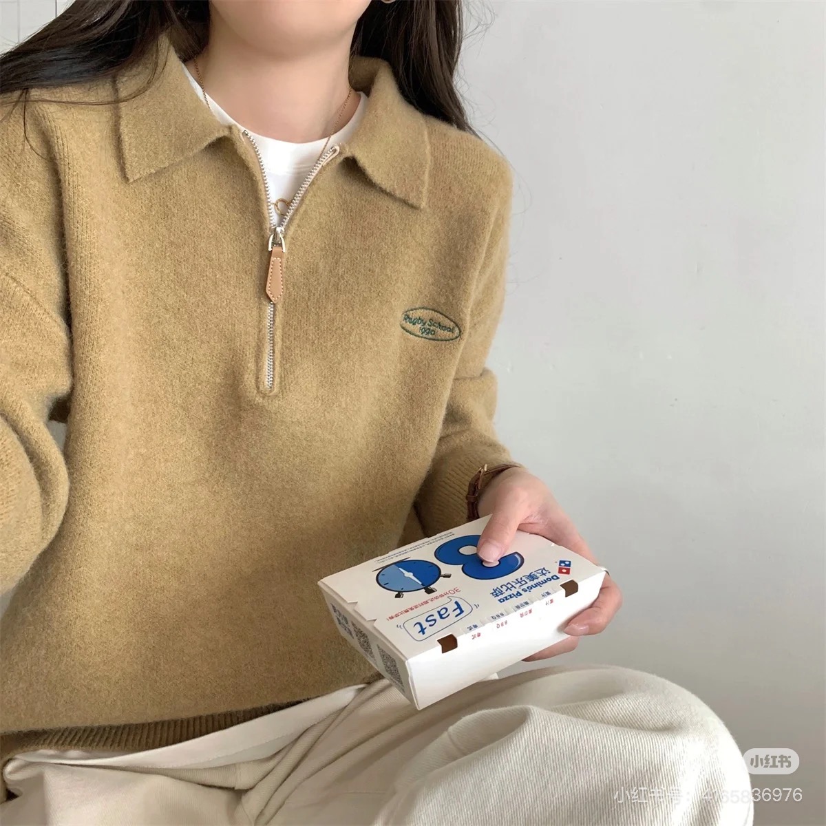 日韓系簡約拉鍊polo翻領毛衣半拉鍊外穿秋冬設計感內搭針織衫上衣