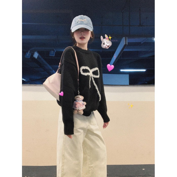 原創毛絨蝴蝶結黑色套頭毛衣女秋冬季慵懶風設計感百搭針織衫上衣