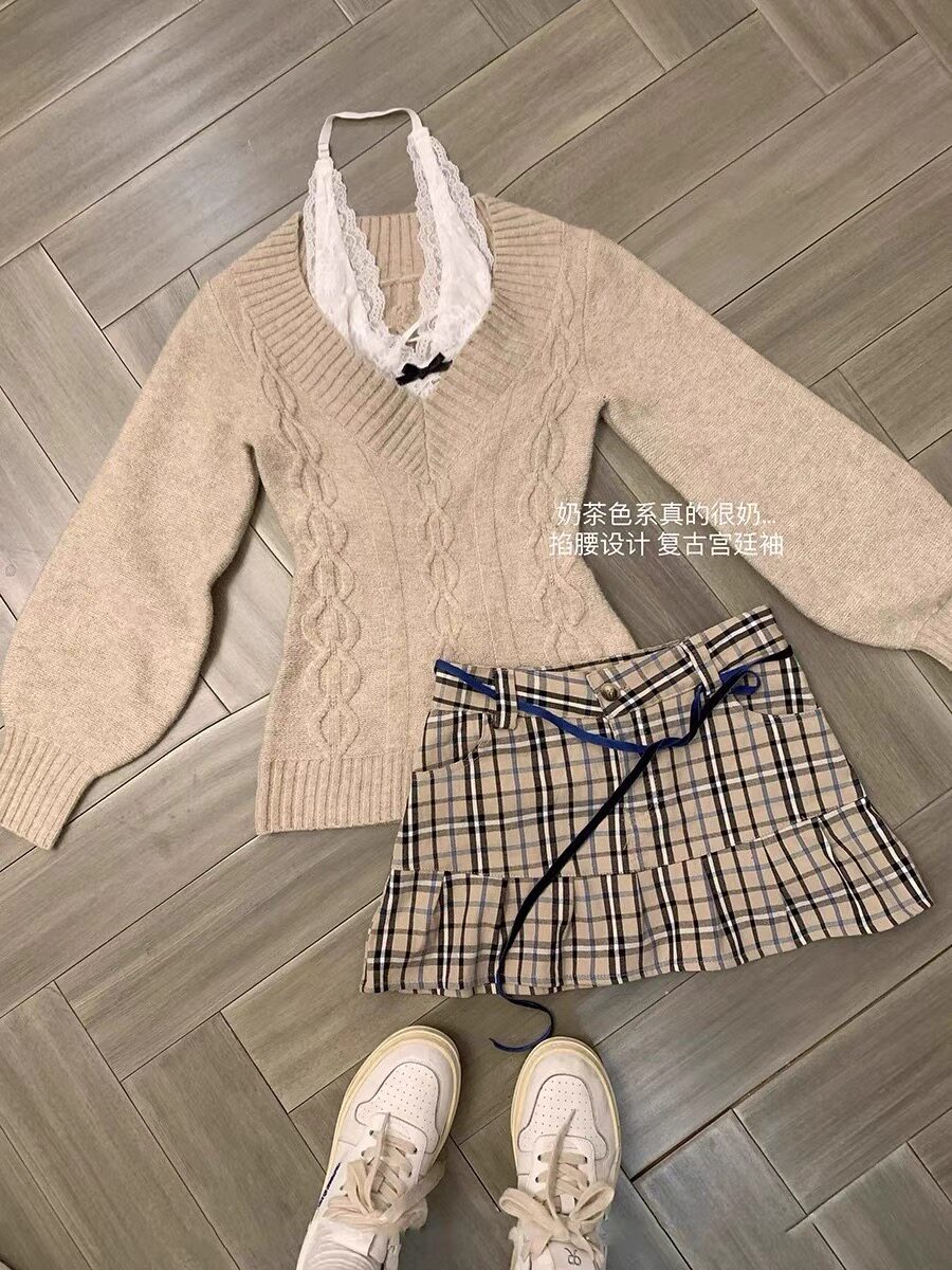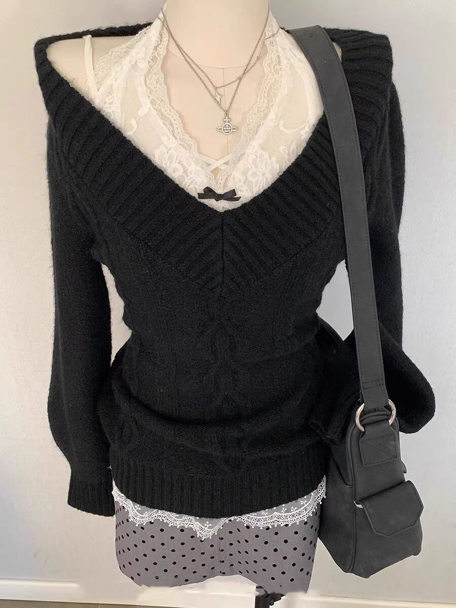黑色收腰顯瘦v領毛衣女韓系大領口V領露肩設計感長袖針織上衣