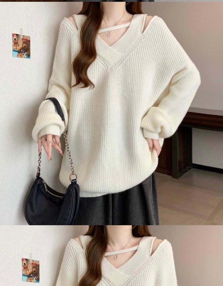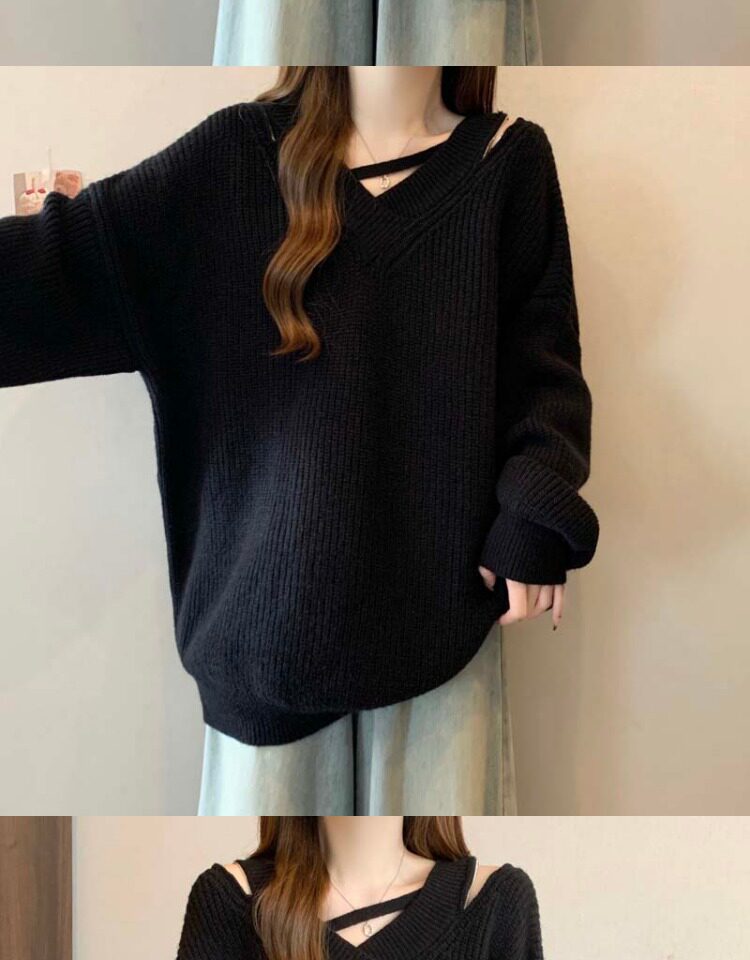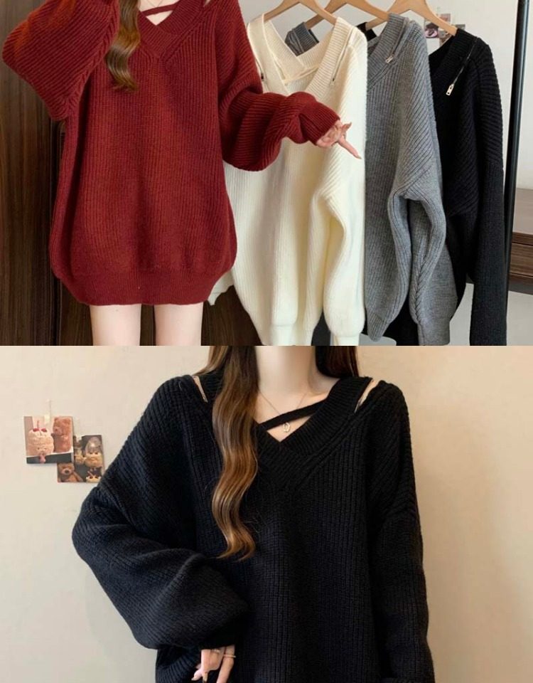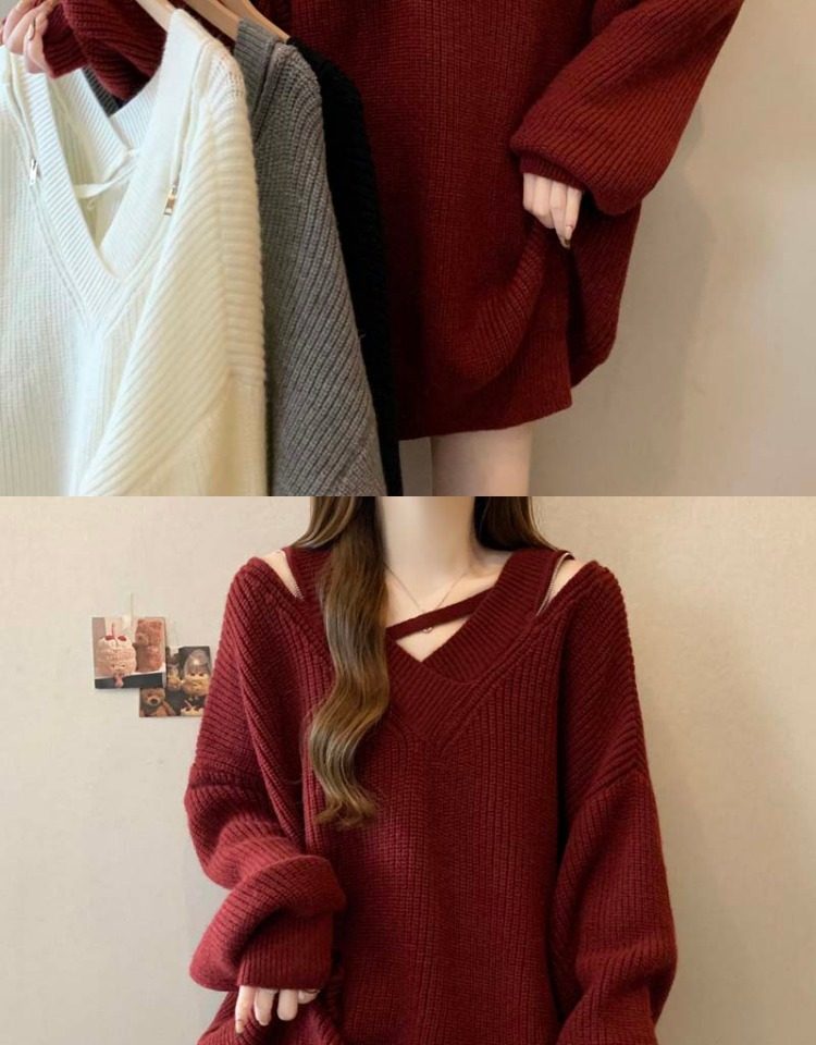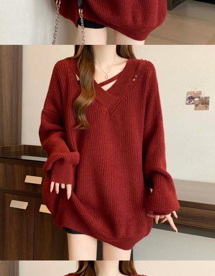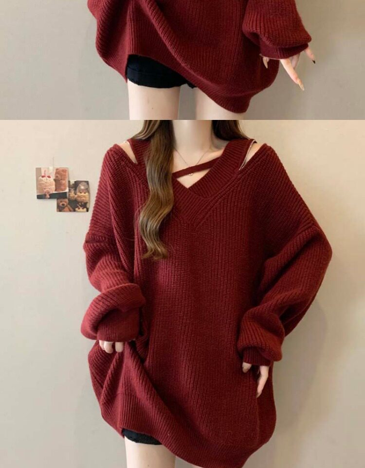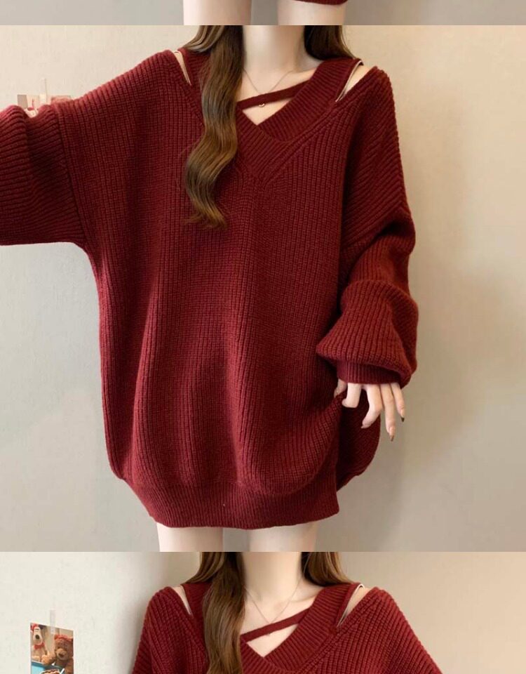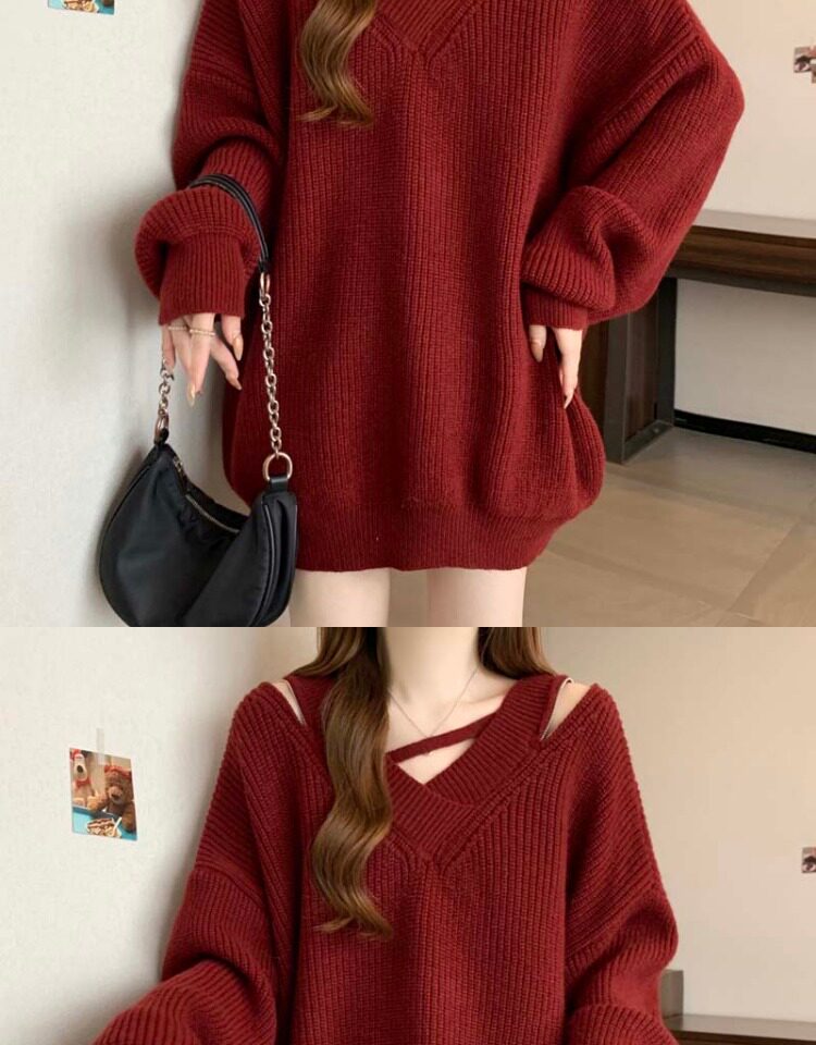 Tina CLUB大碼女裝秋冬季胖mm新年穿搭設計感露肩中長款紅色毛衣