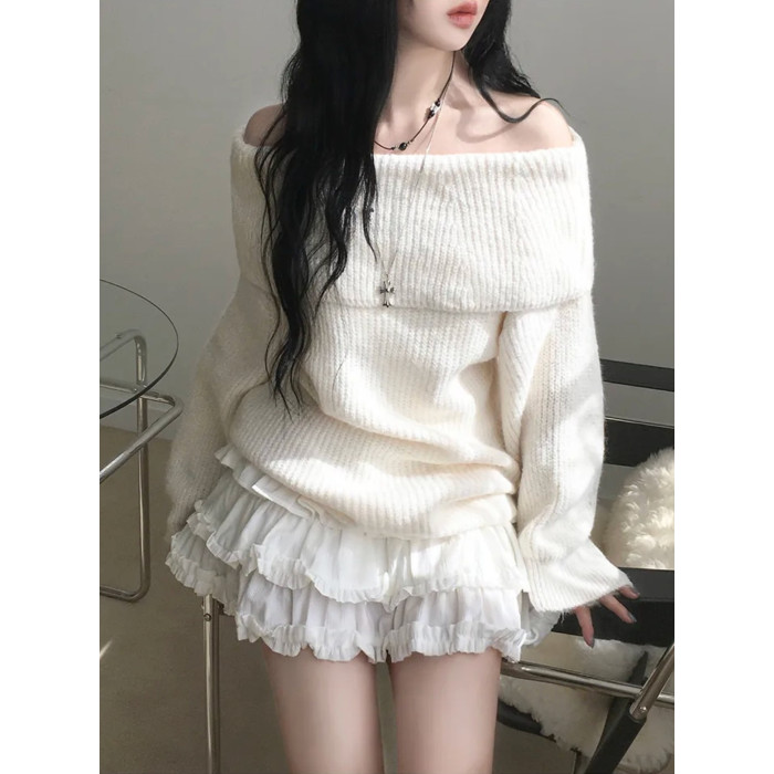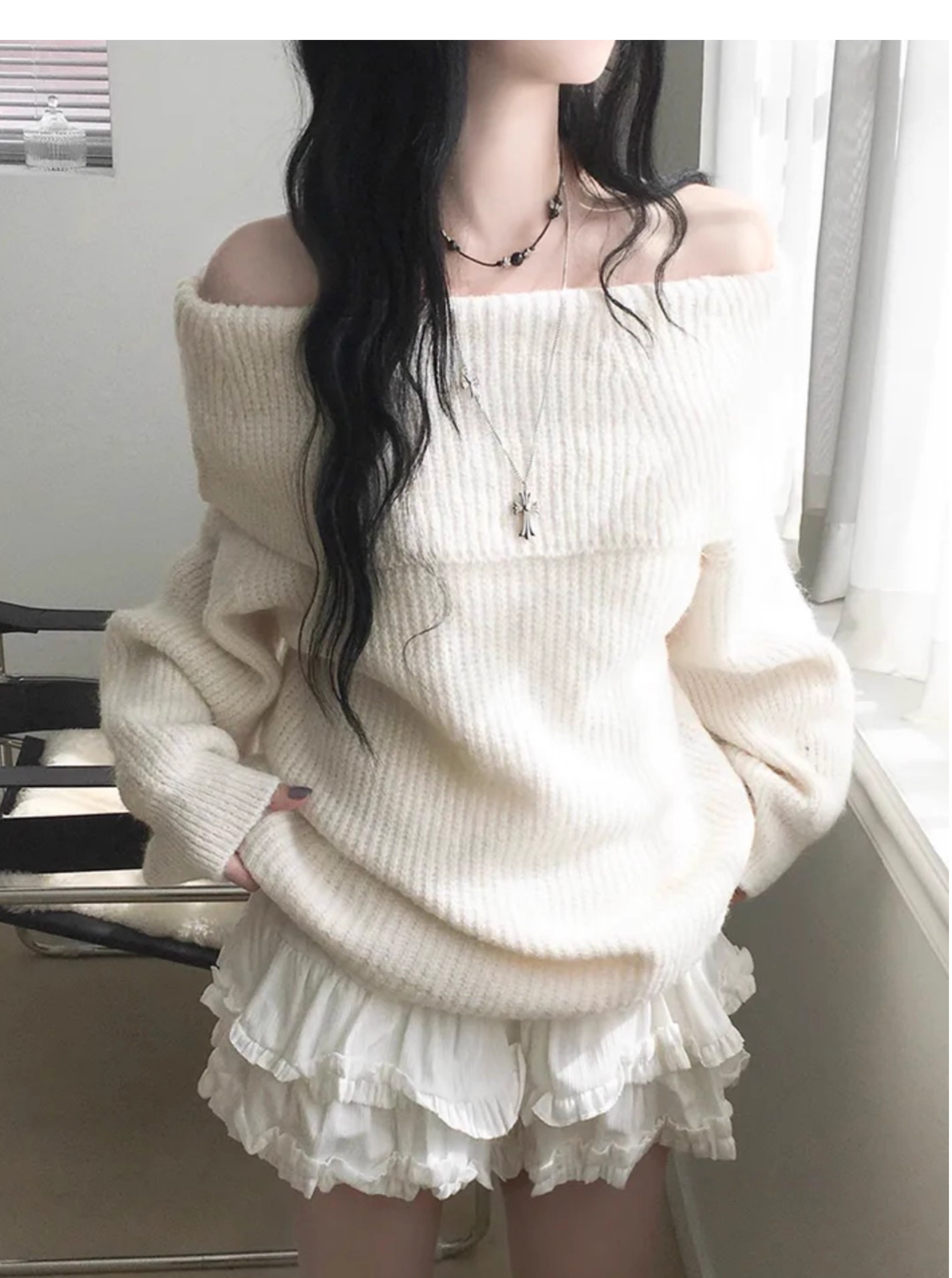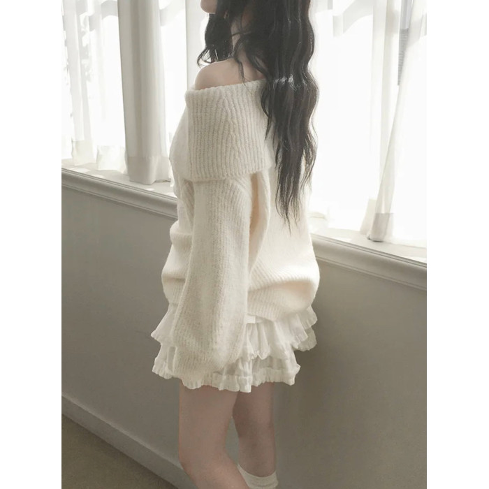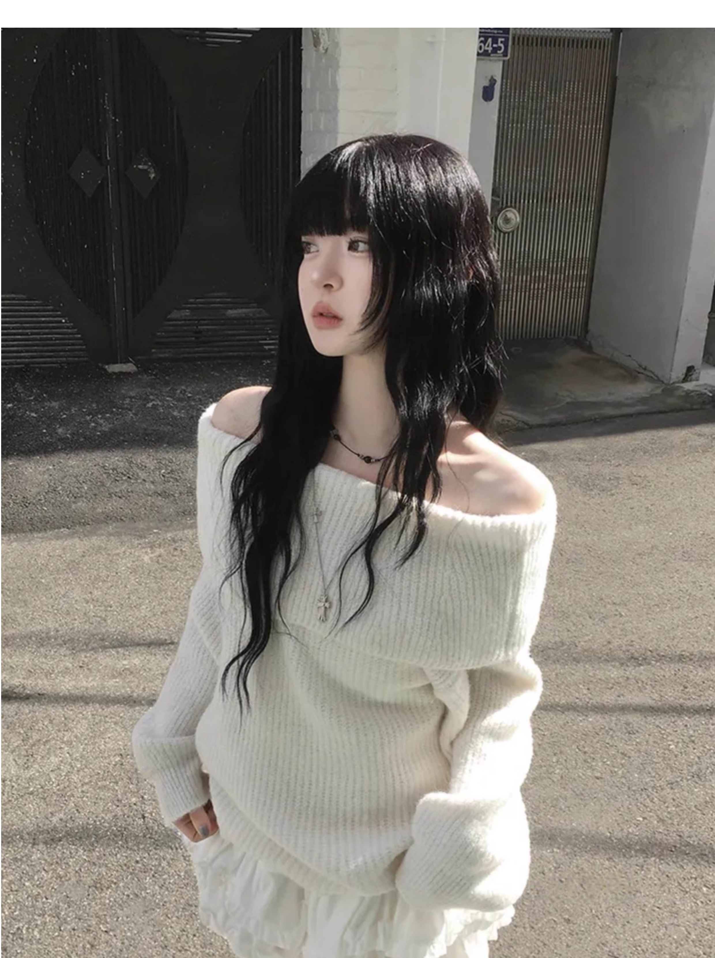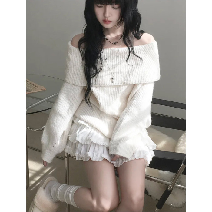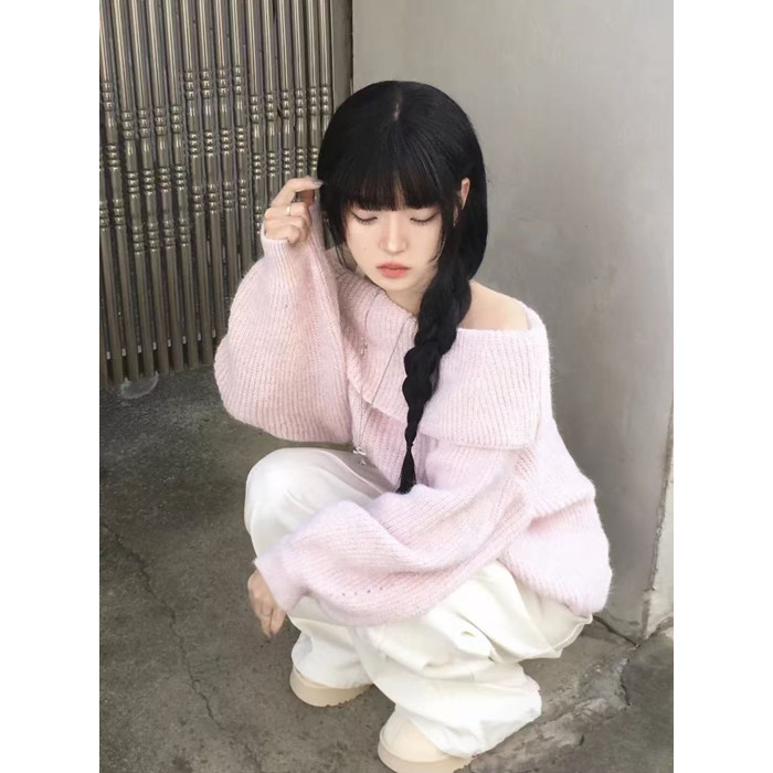 Up and on 韓系秋冬純欲風辣妹毛茸茸露肩休閒百搭寬松針織衫毛衣