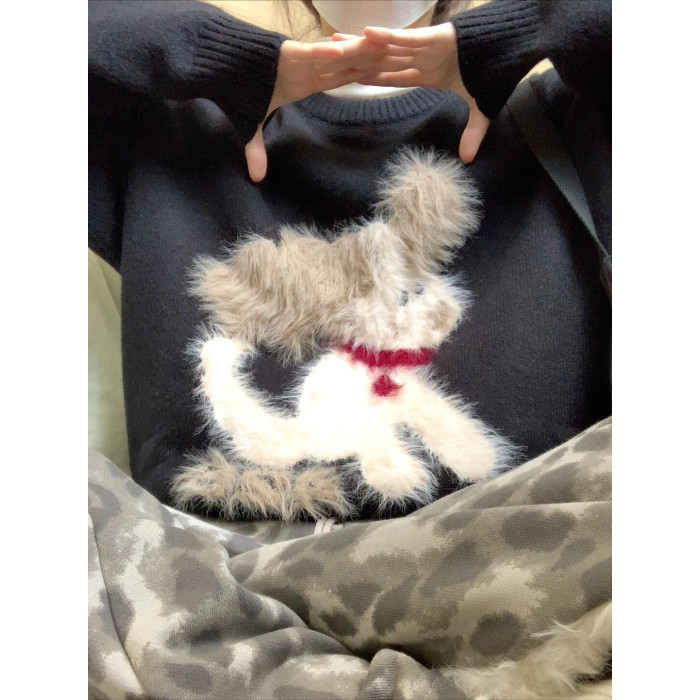 國潮牌情侶休閒寬松時尚毛絨小狗提花毛衣秋冬新款黑色針織衫上衣
