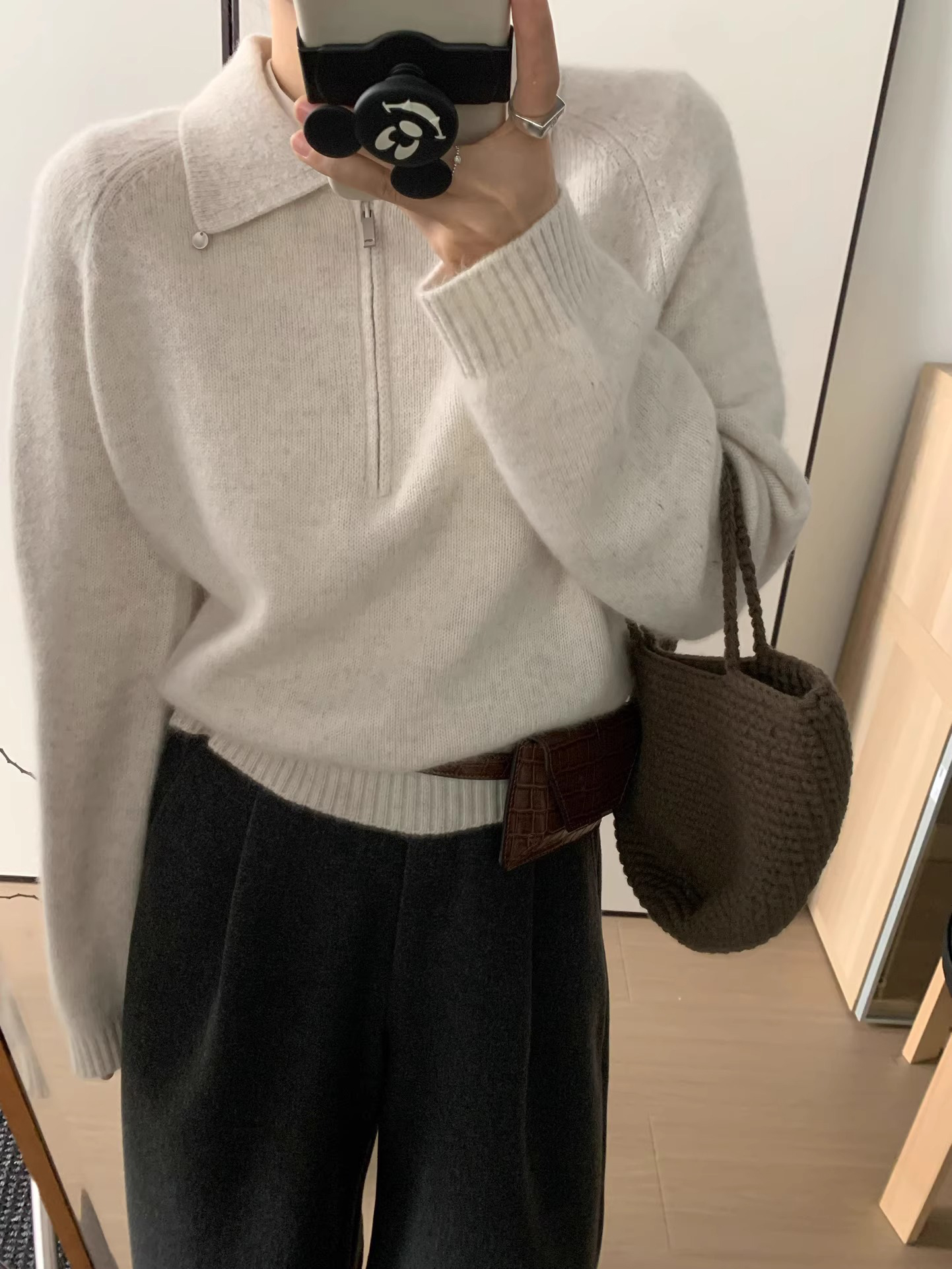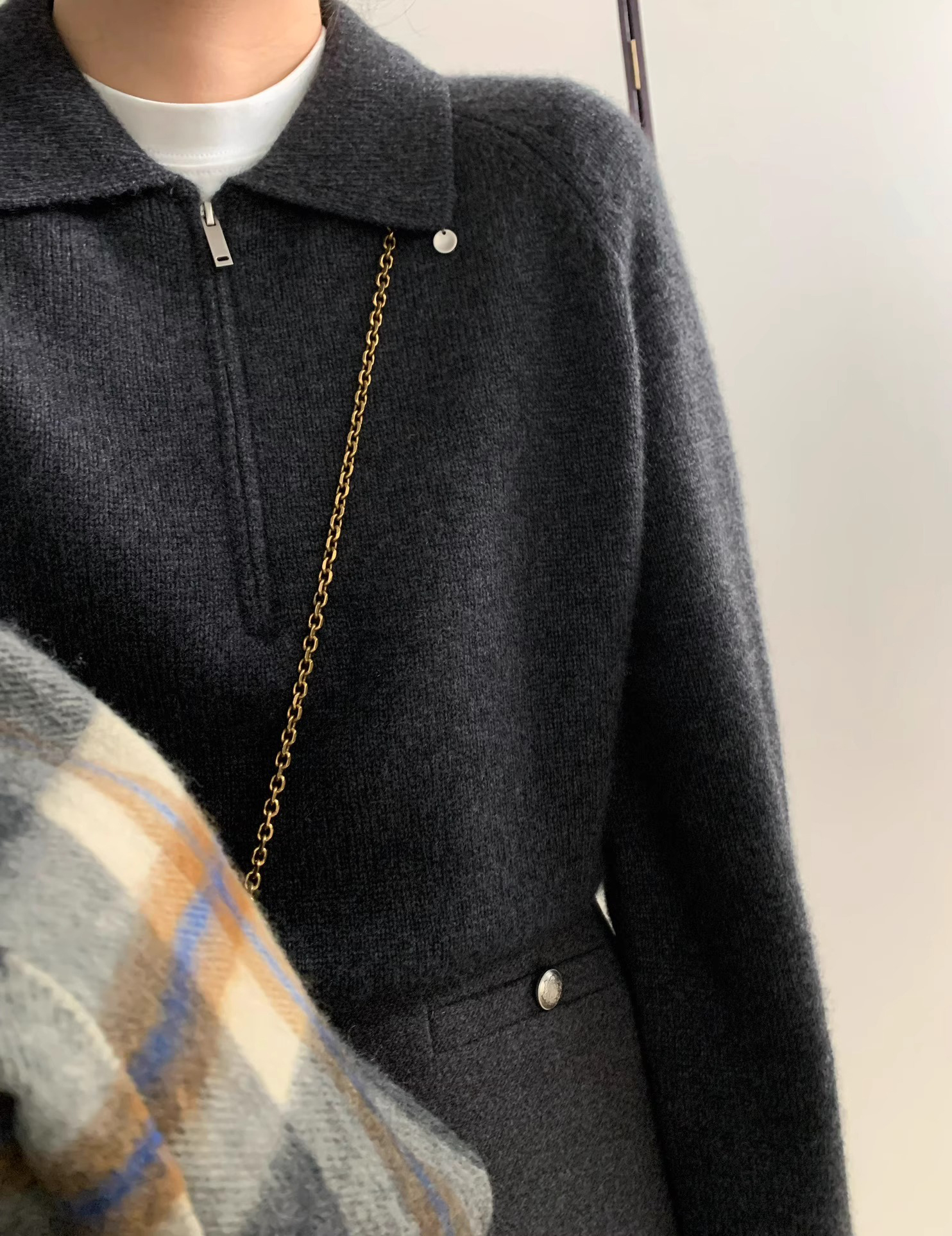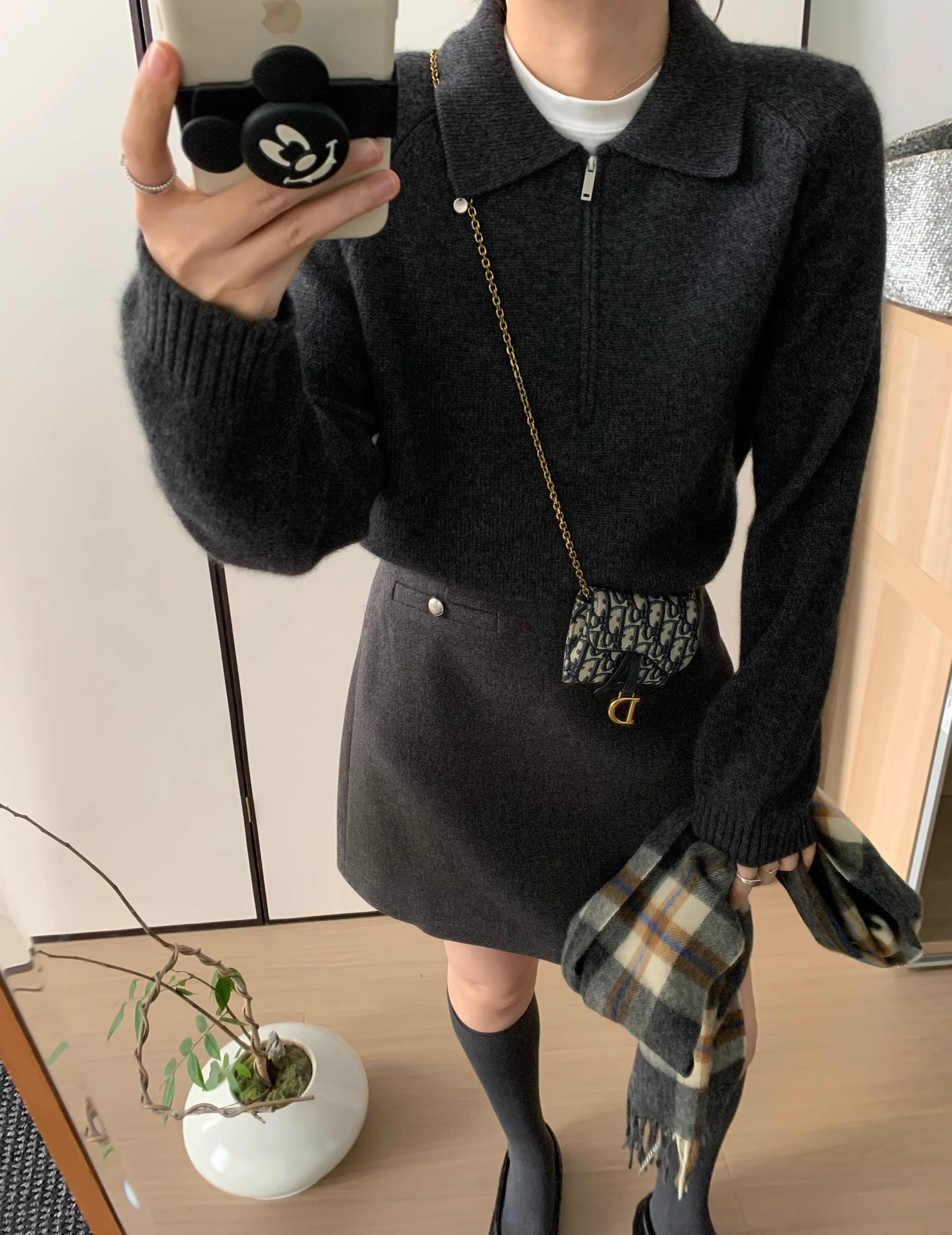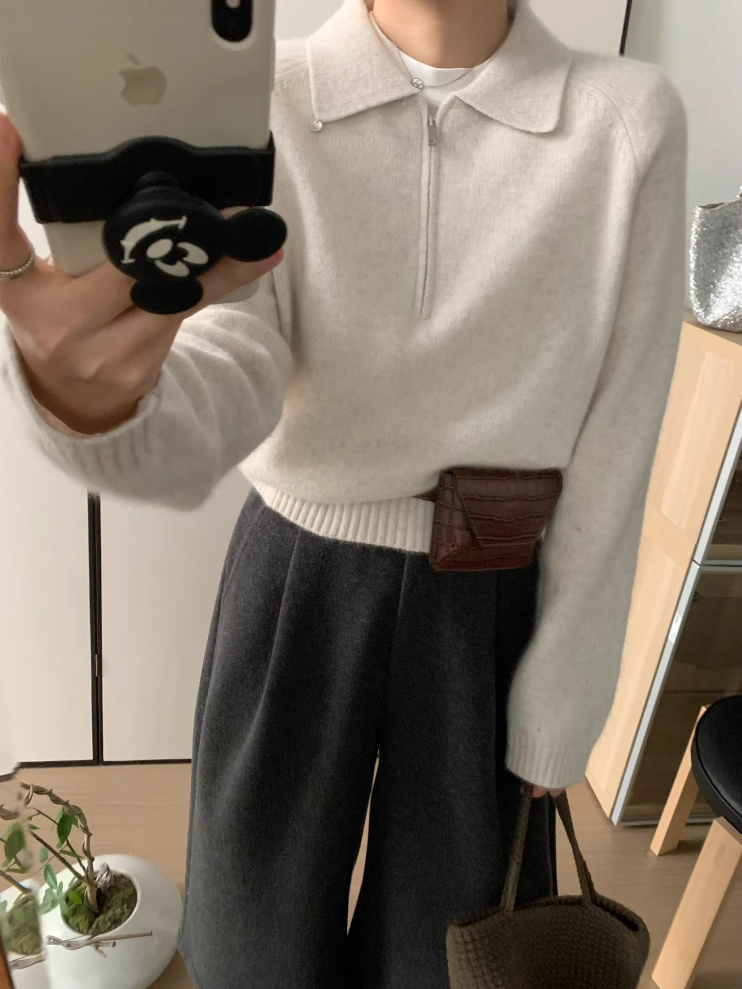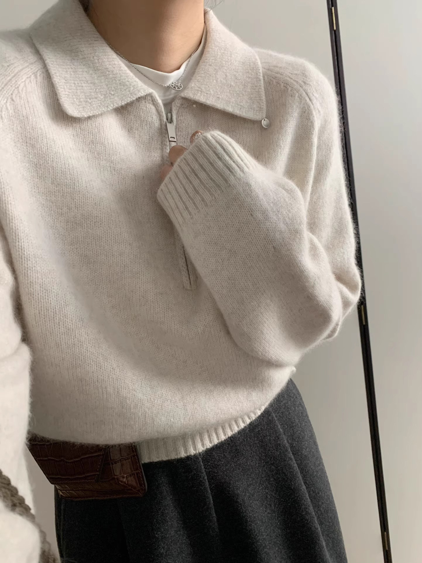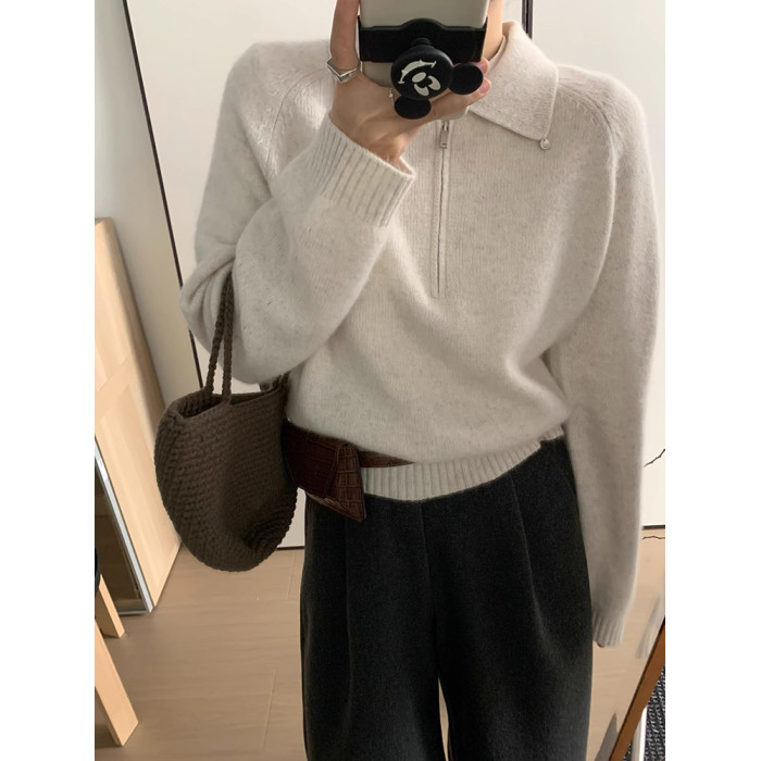 秋冬簡約半拉鍊polo翻領灰色浣熊絨毛衣女內搭針織衫加厚羊毛外穿