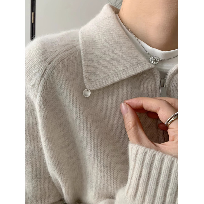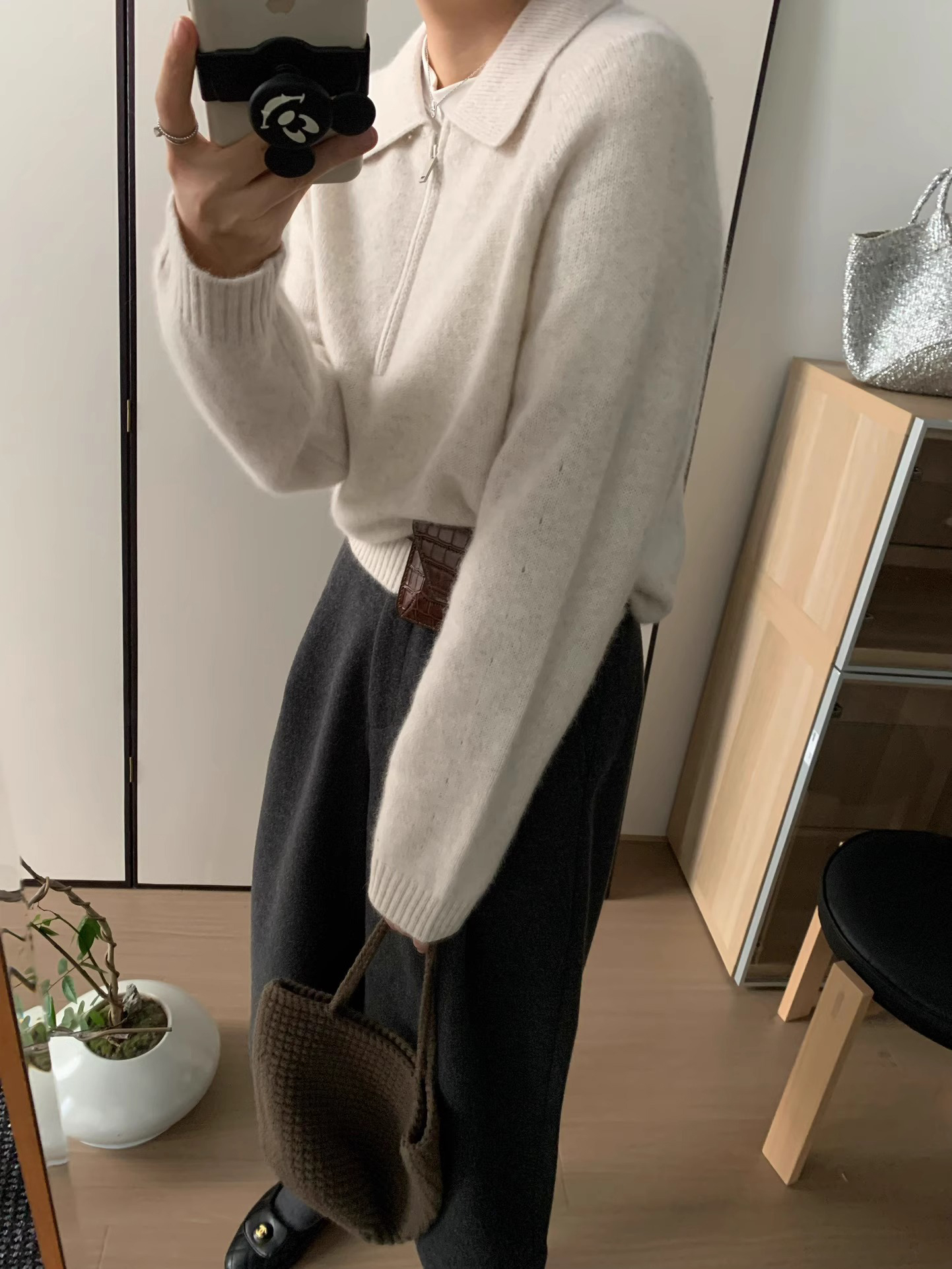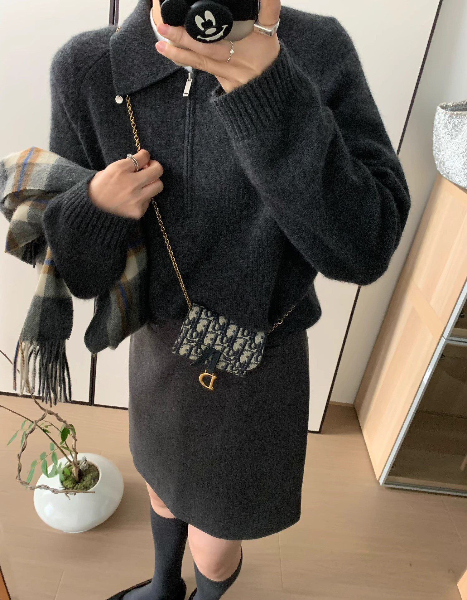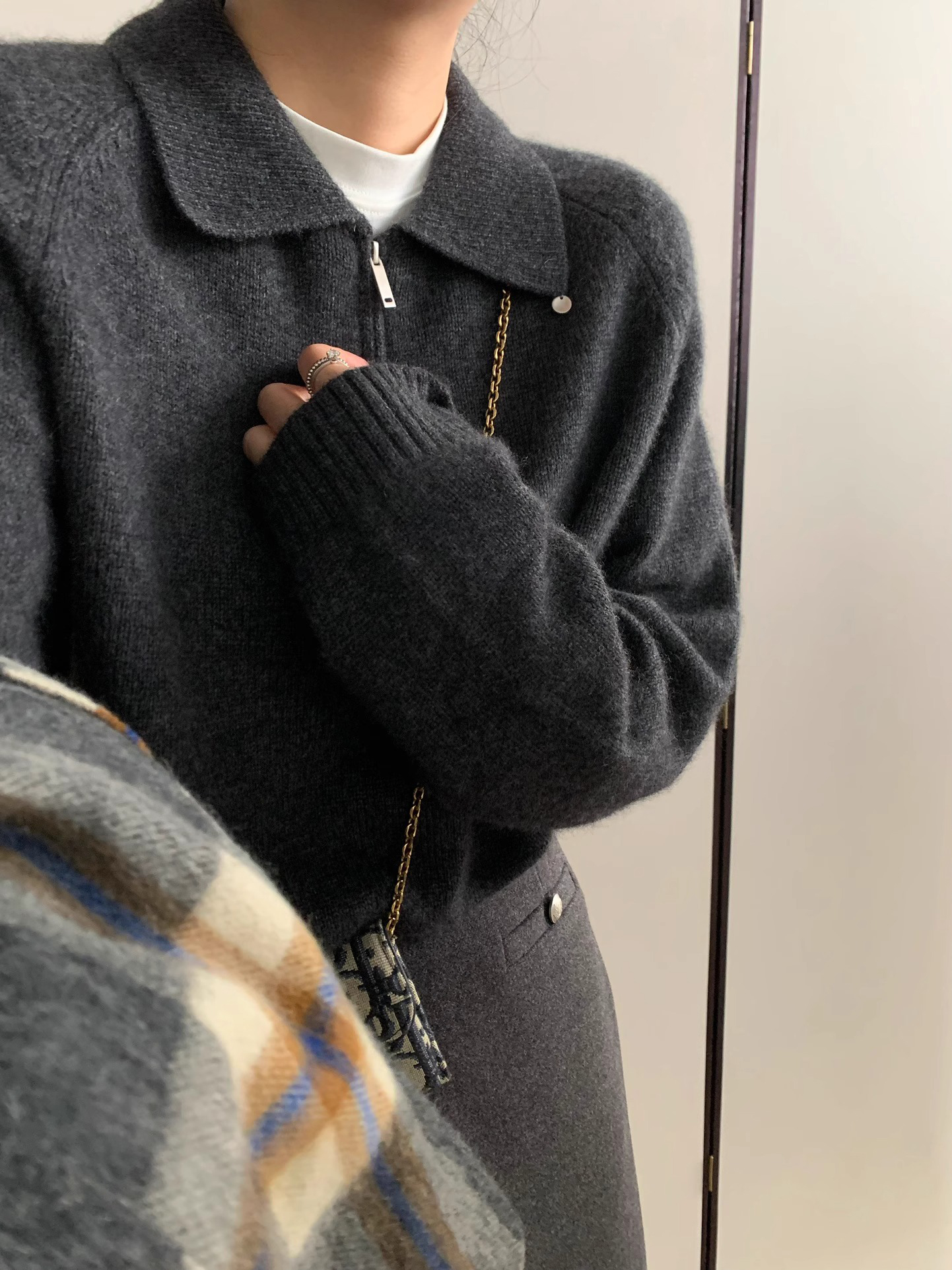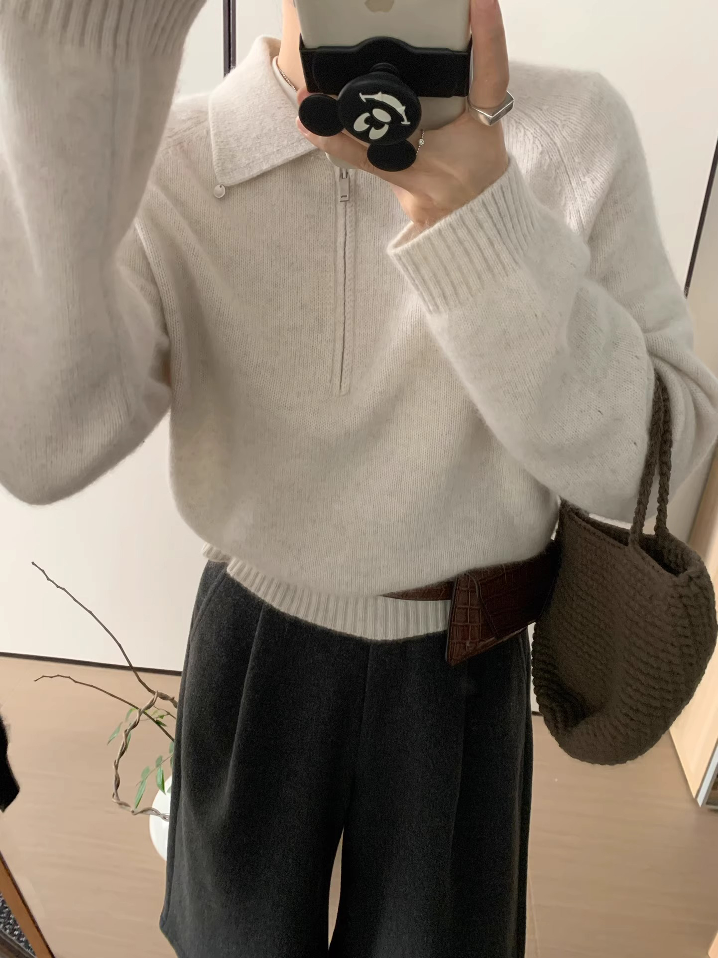 秋冬簡約半拉鍊polo翻領灰色浣熊絨毛衣女內搭針織衫加厚羊毛外穿