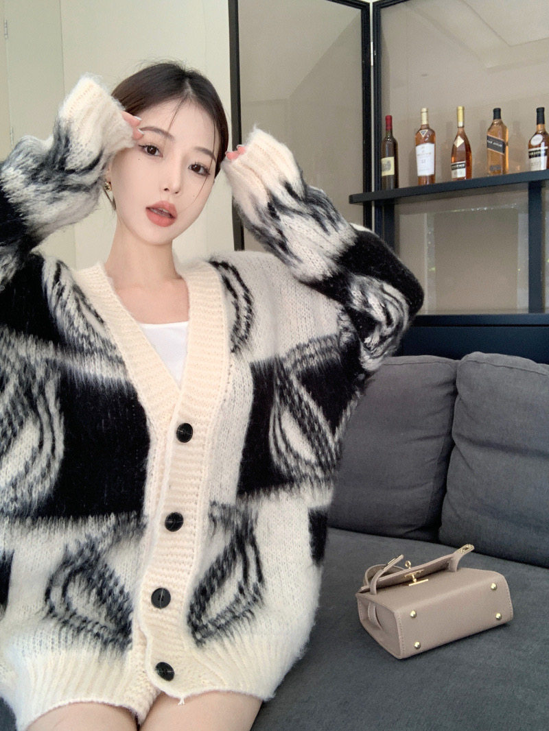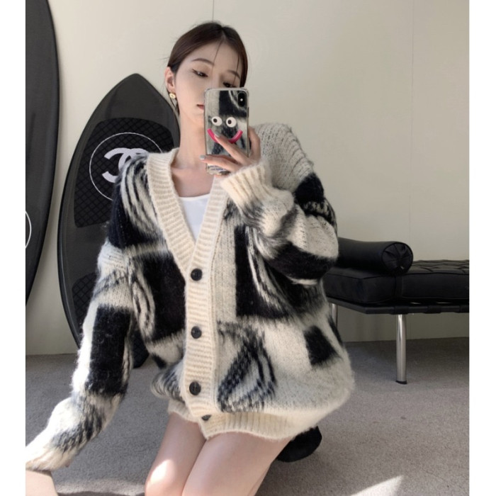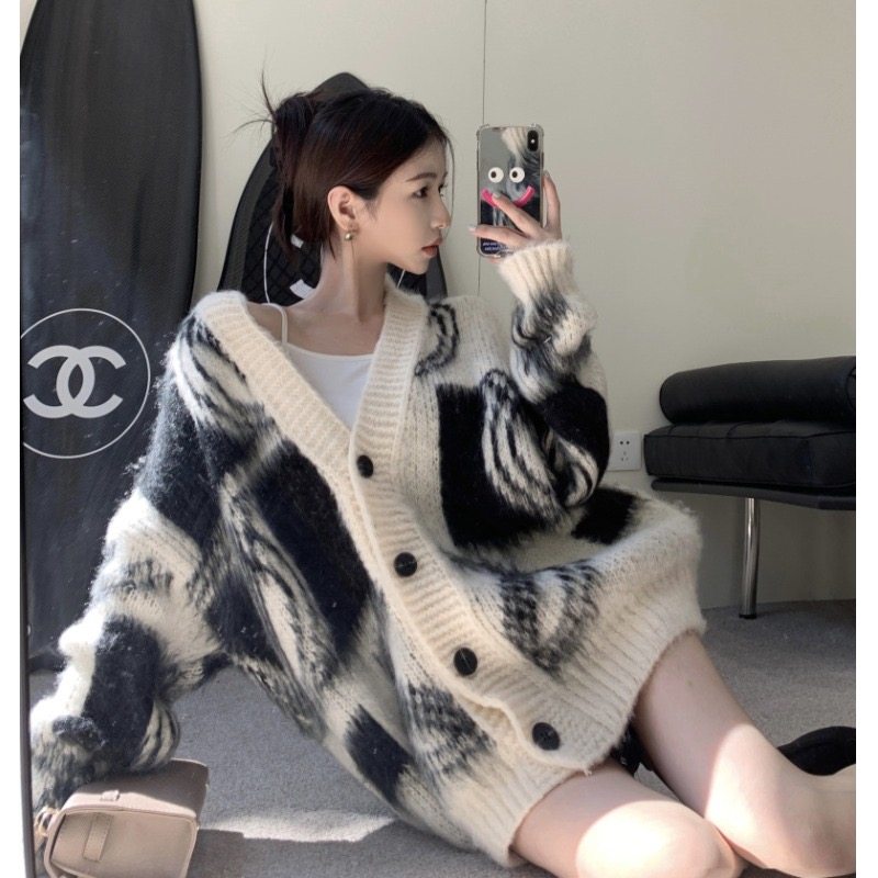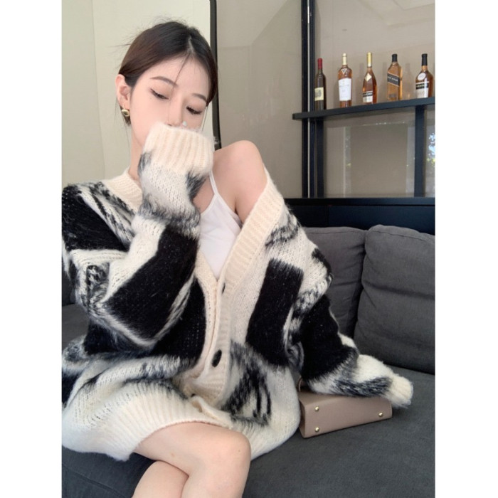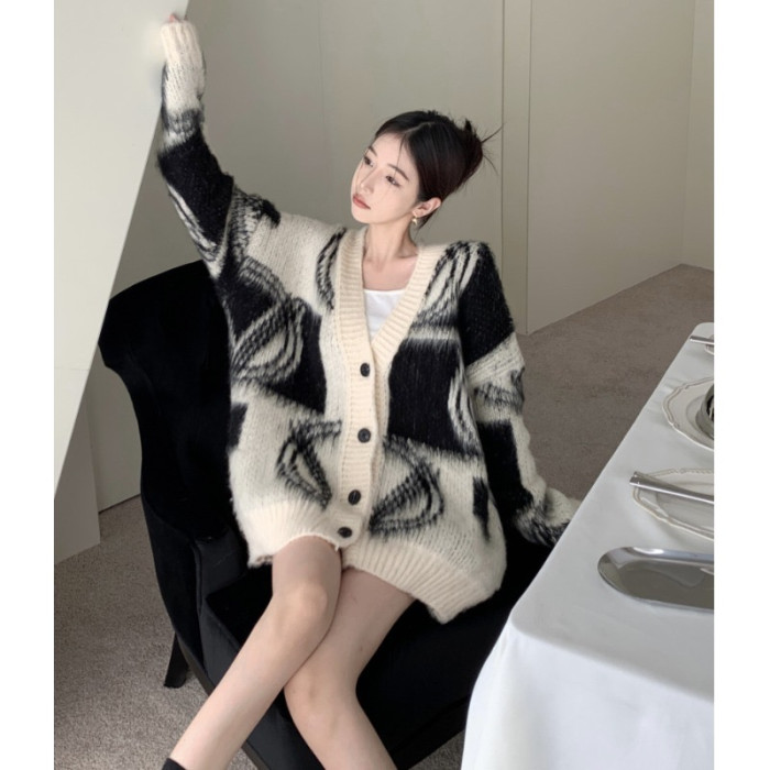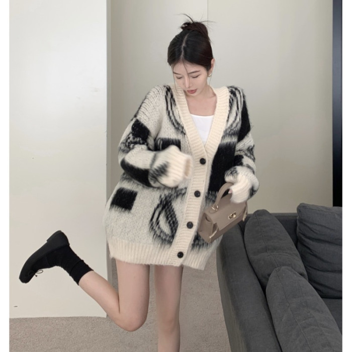2025秋冬新款慵懶風拼色v領毛衣開衫外套女加厚中長款針織衫上衣