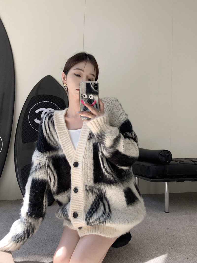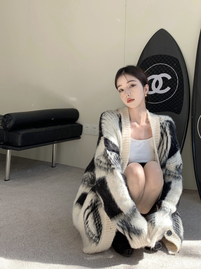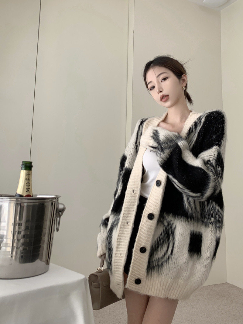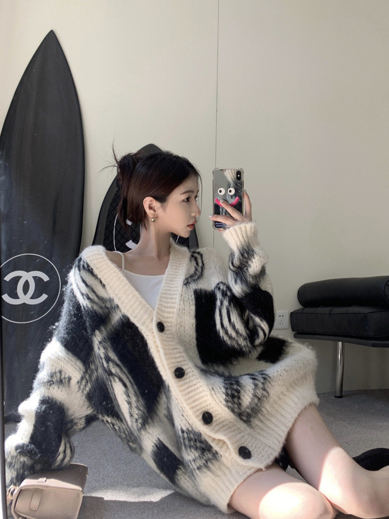 2025秋冬新款慵懶風拼色v領毛衣開衫外套女加厚中長款針織衫上衣