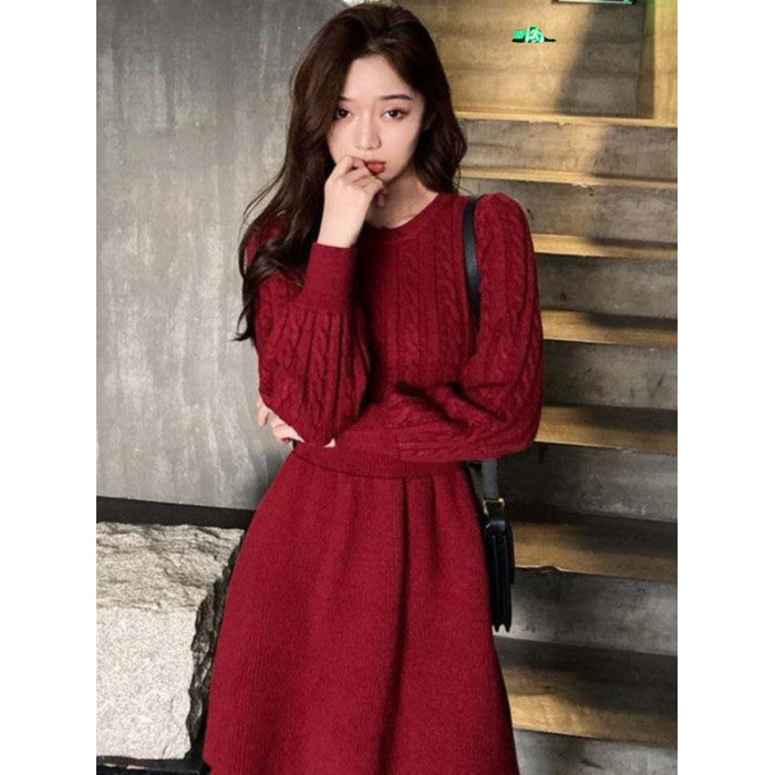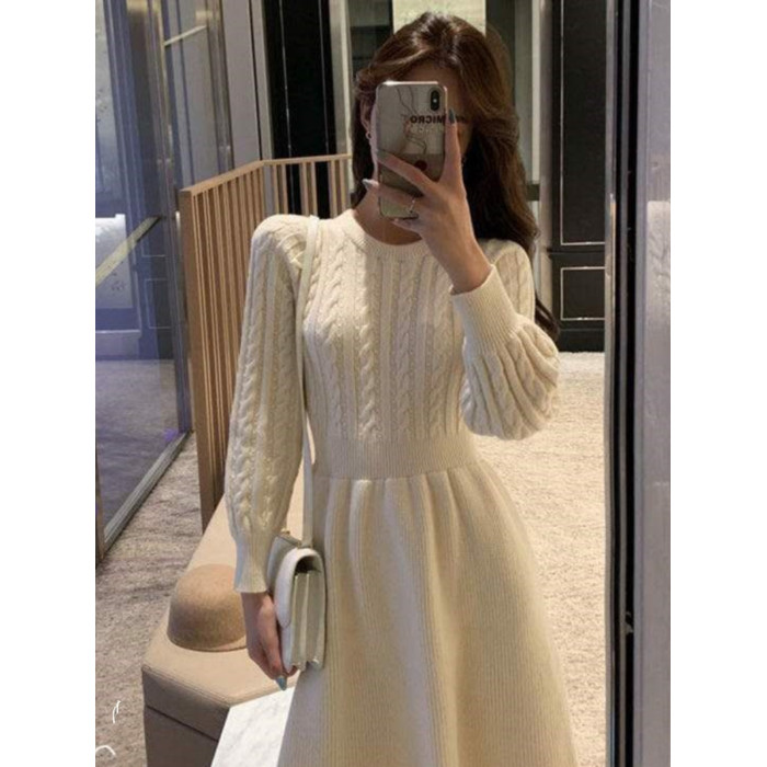 針織連衣裙女2023秋冬新款韓版收腰顯瘦加厚中款打底麻花毛衣短裙