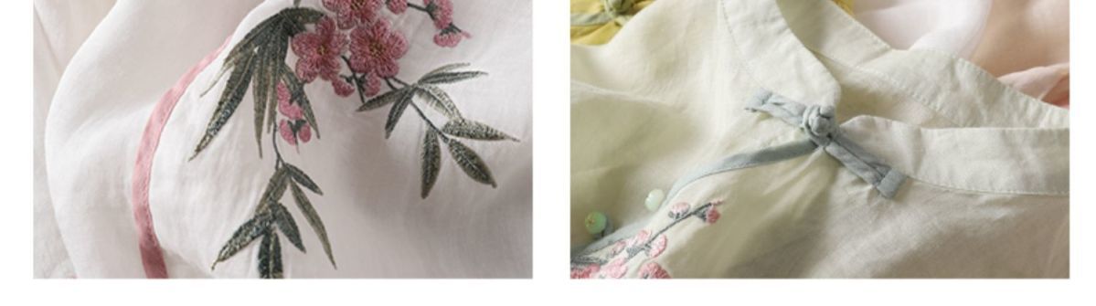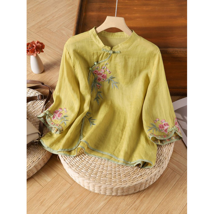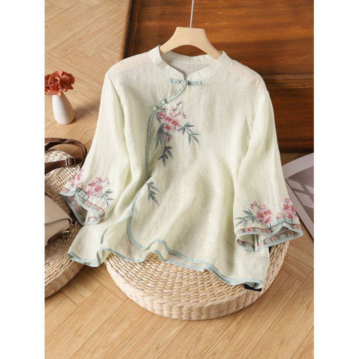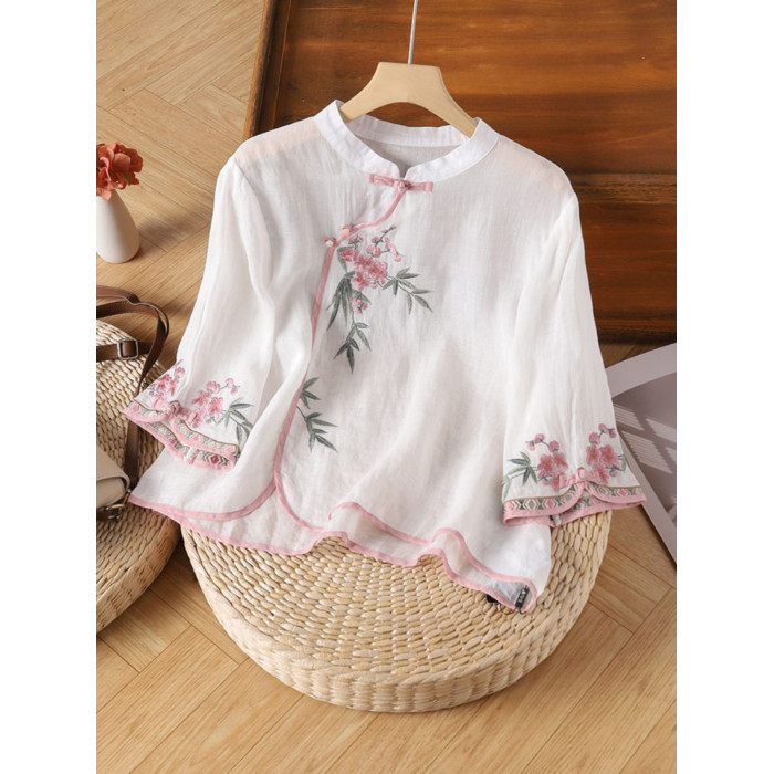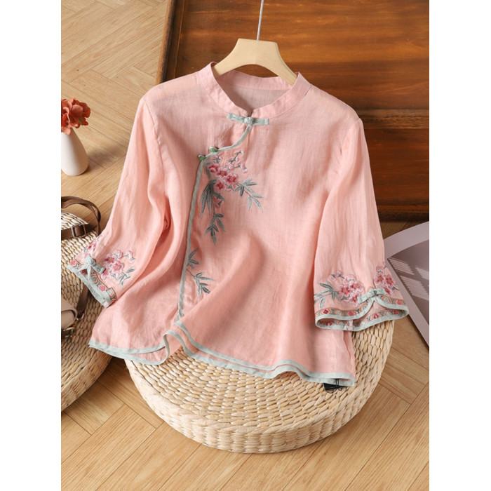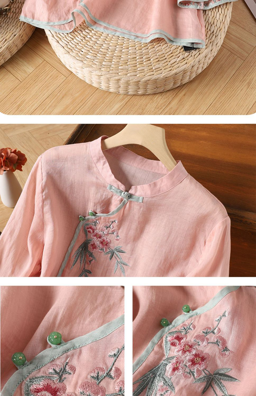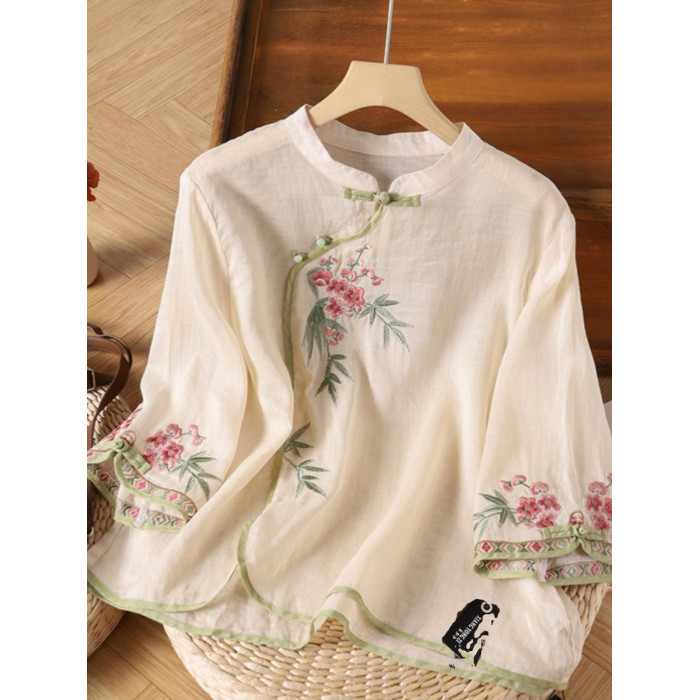 撿漏~專櫃尾貨棉麻復古斜襟盤釦襯衫女夏季寬松立領七分袖上衣女