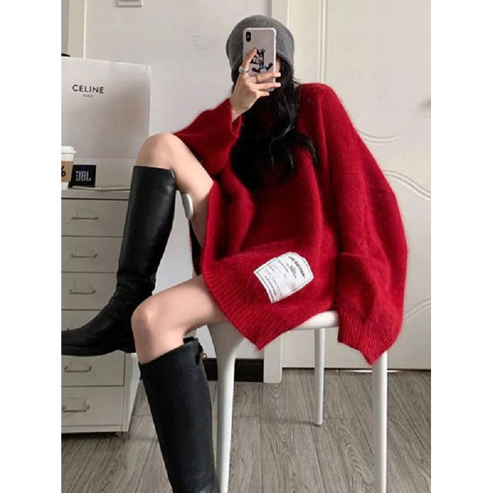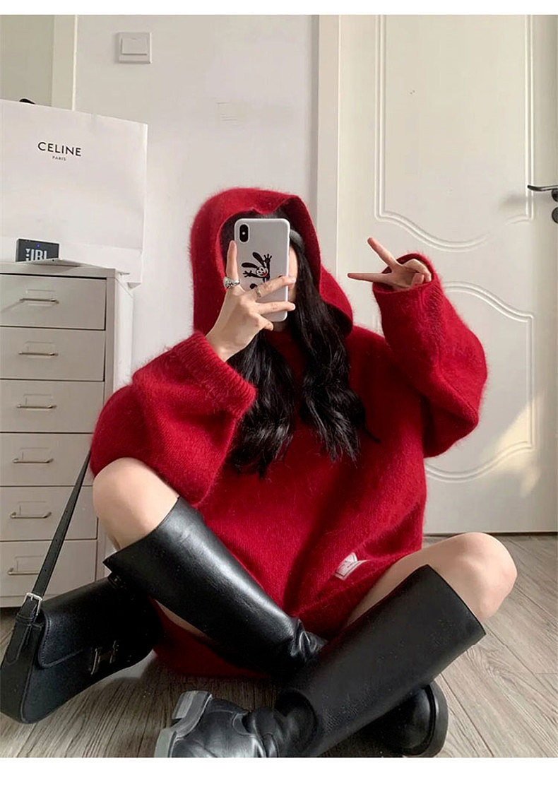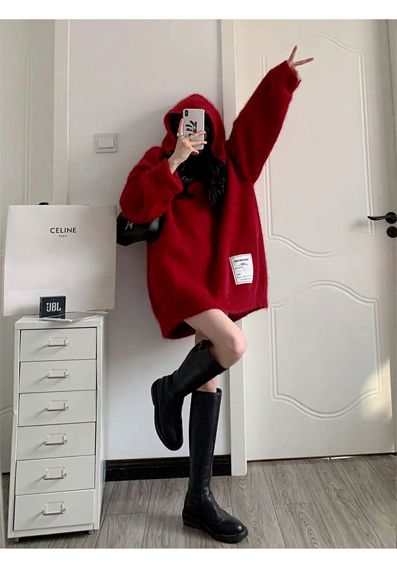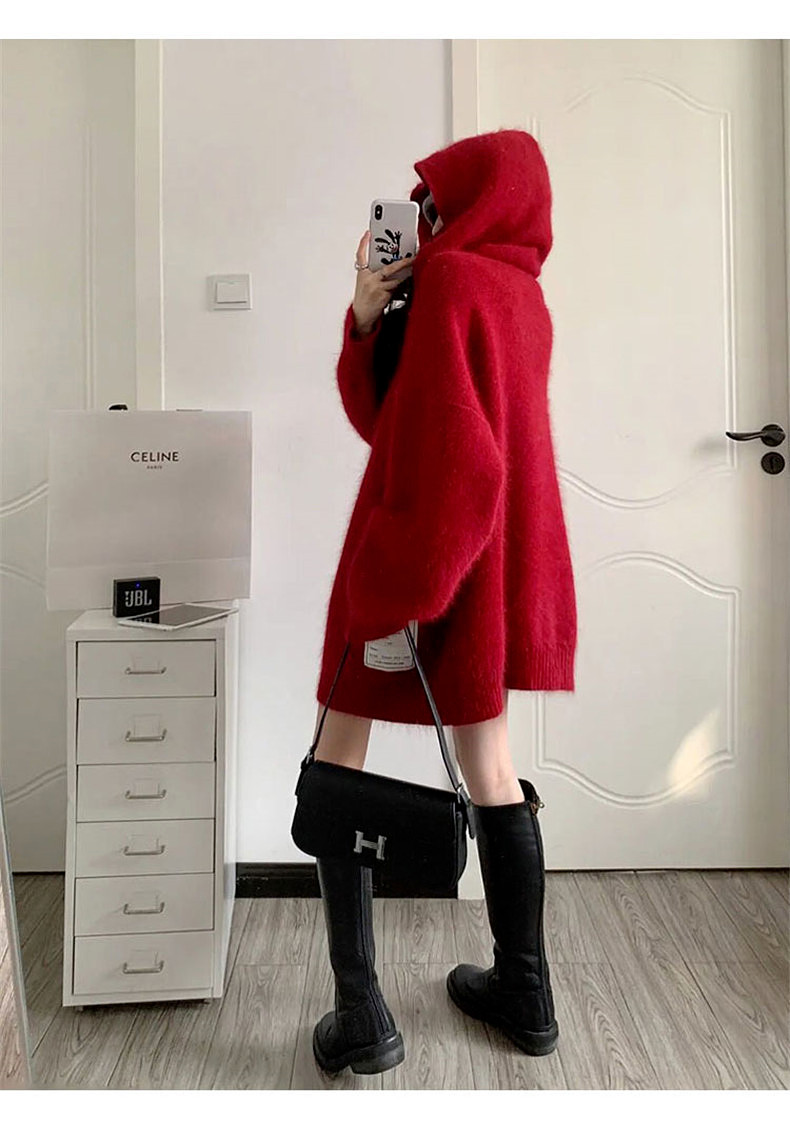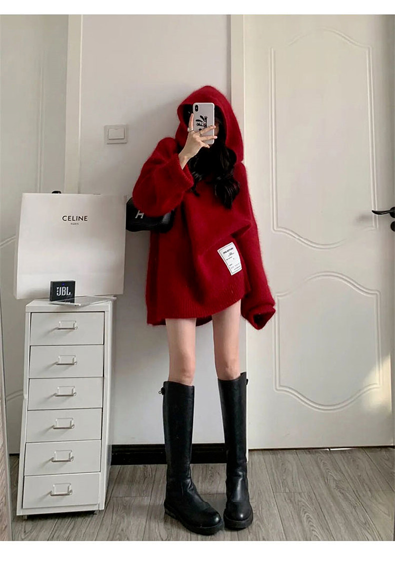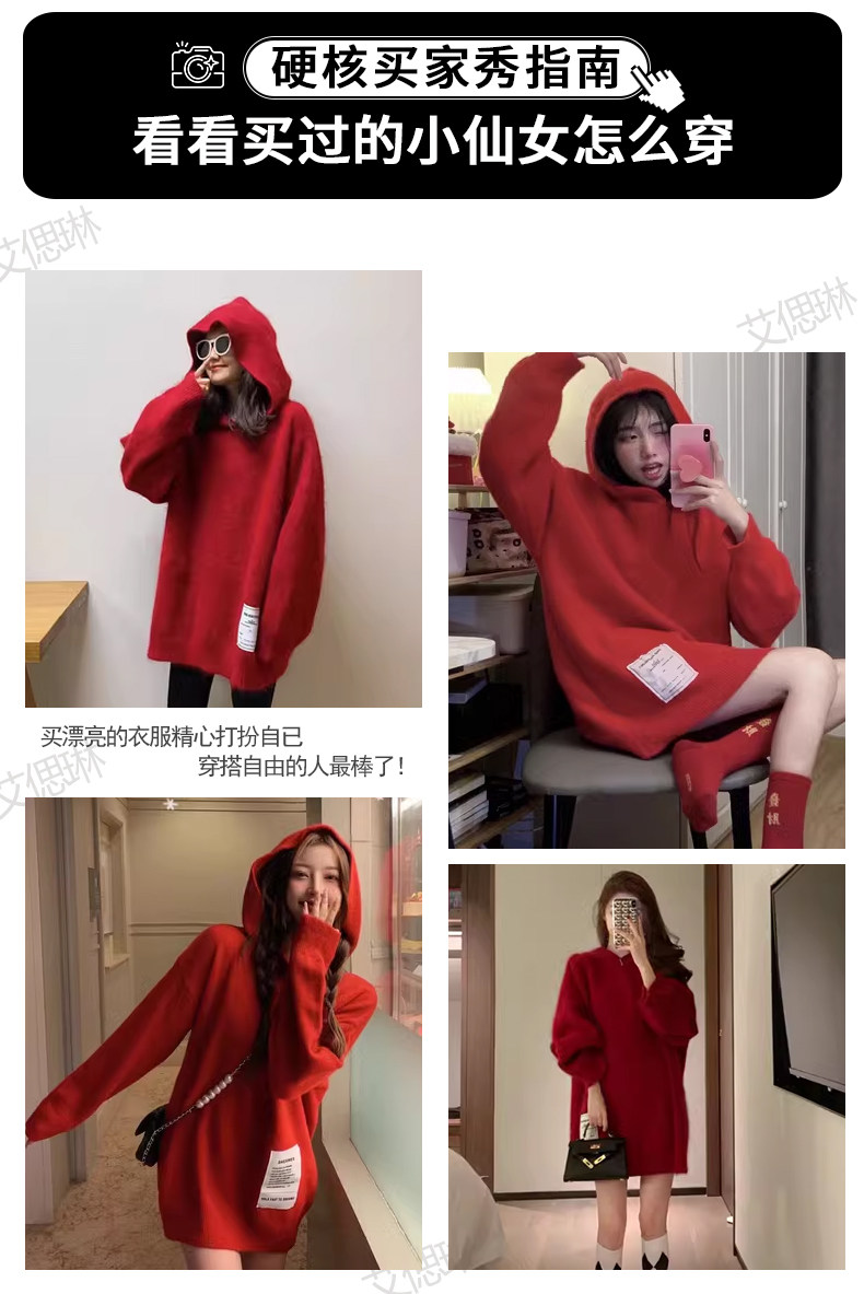 中長款寬松慵懶風聖誕紅色連帽毛衣女秋冬季2025新款打底針織上衣