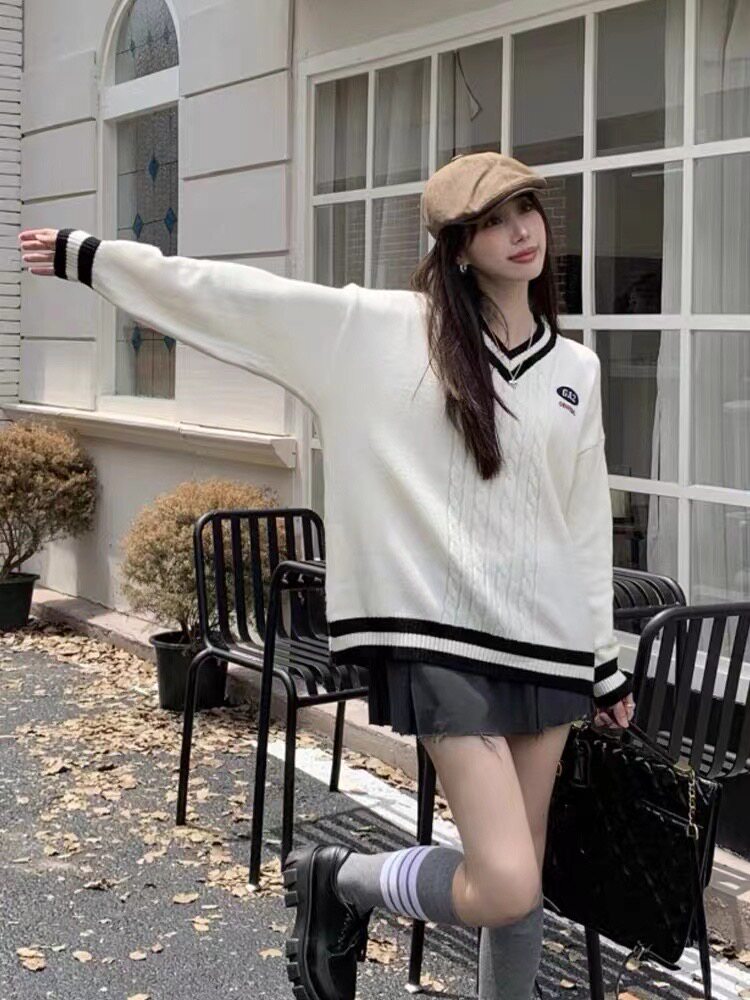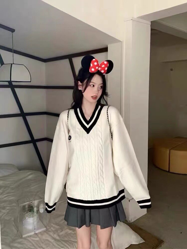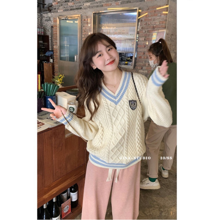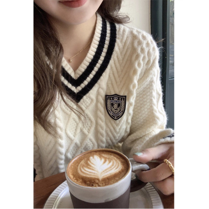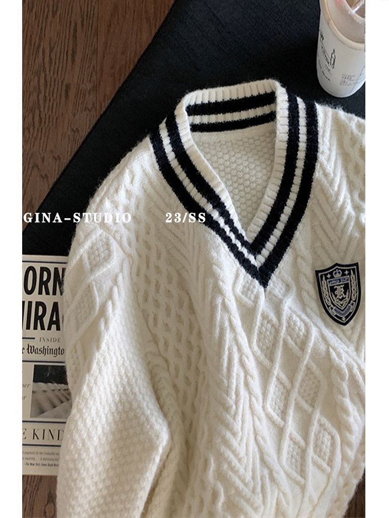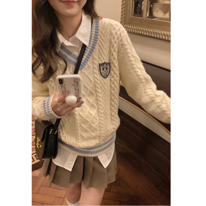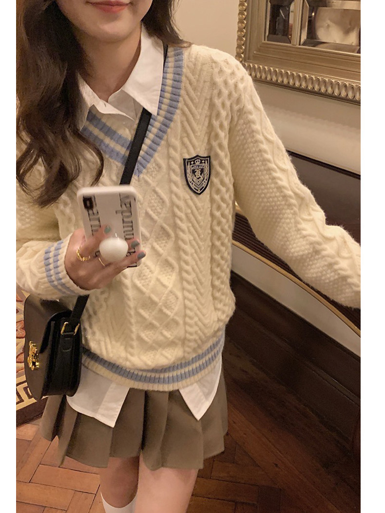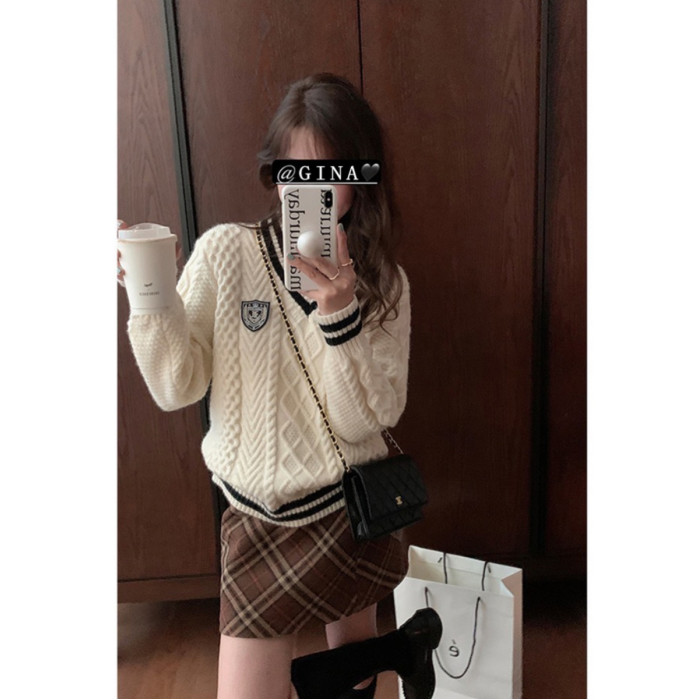 英倫學院風毛衣韓系溫柔小個子女V領2024秋冬新款針織上衣慵懶風