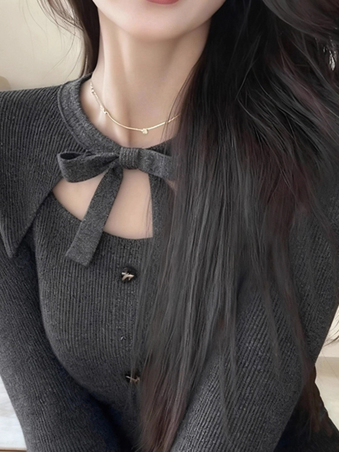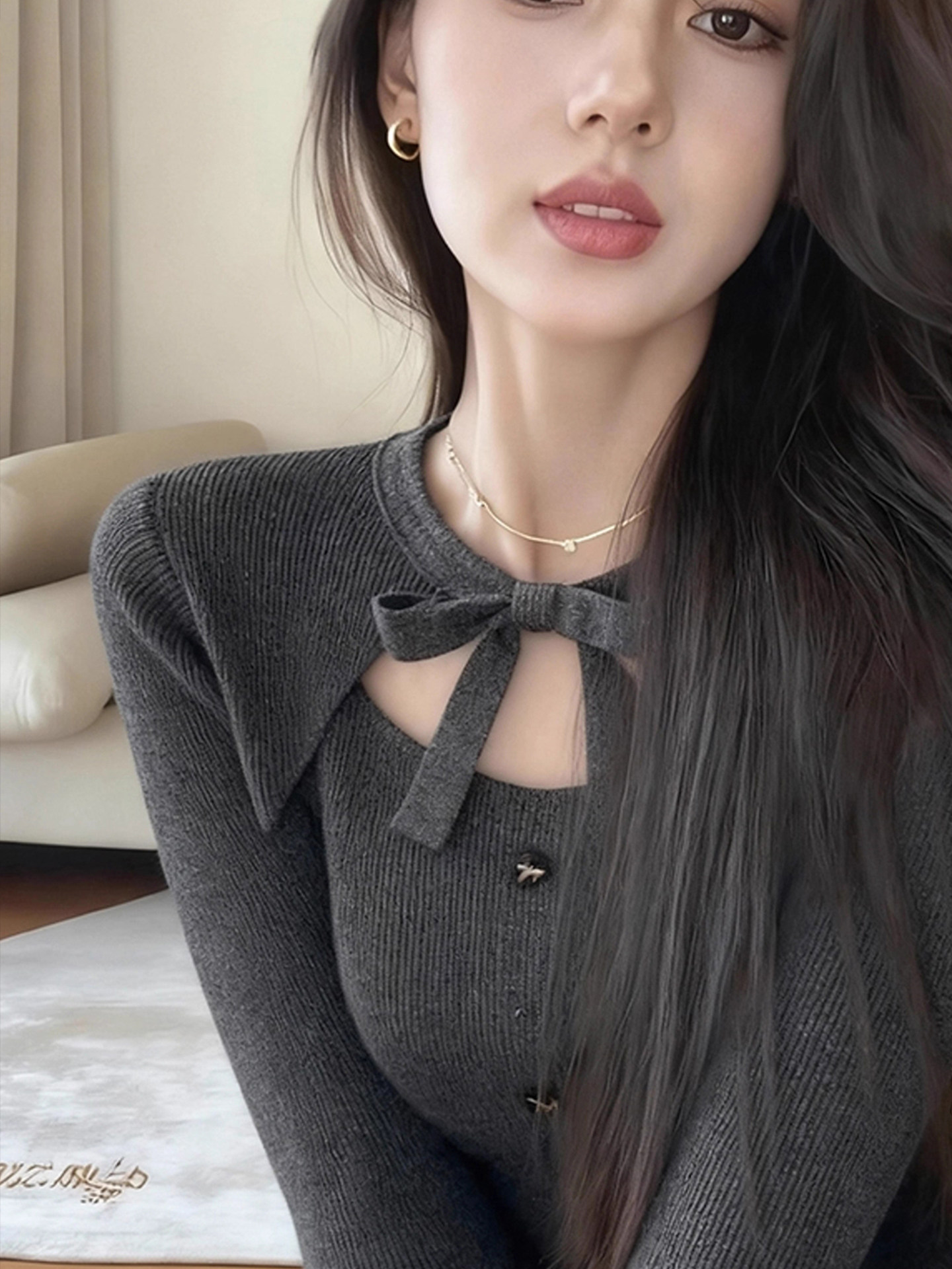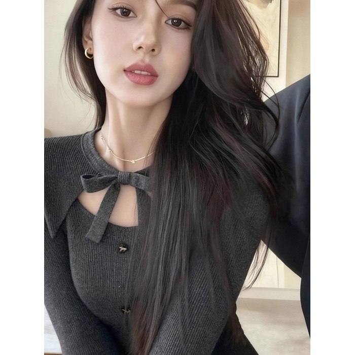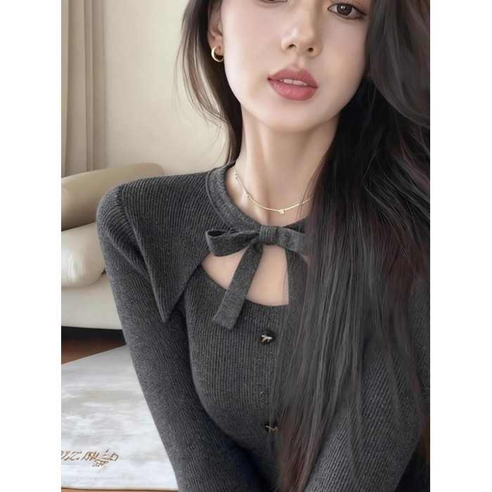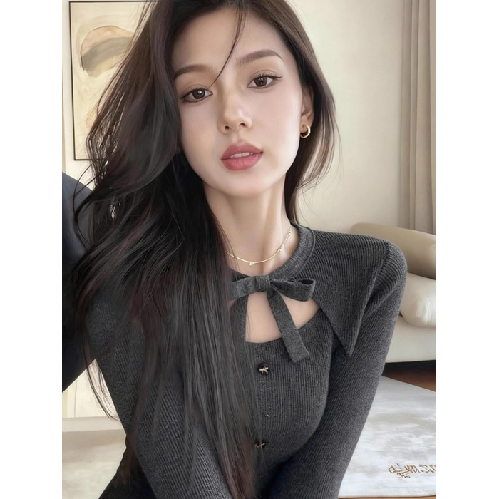 南油大牌女裝2025秋冬高級感上衣獨特漂亮灰色蝴蝶結領針織衫