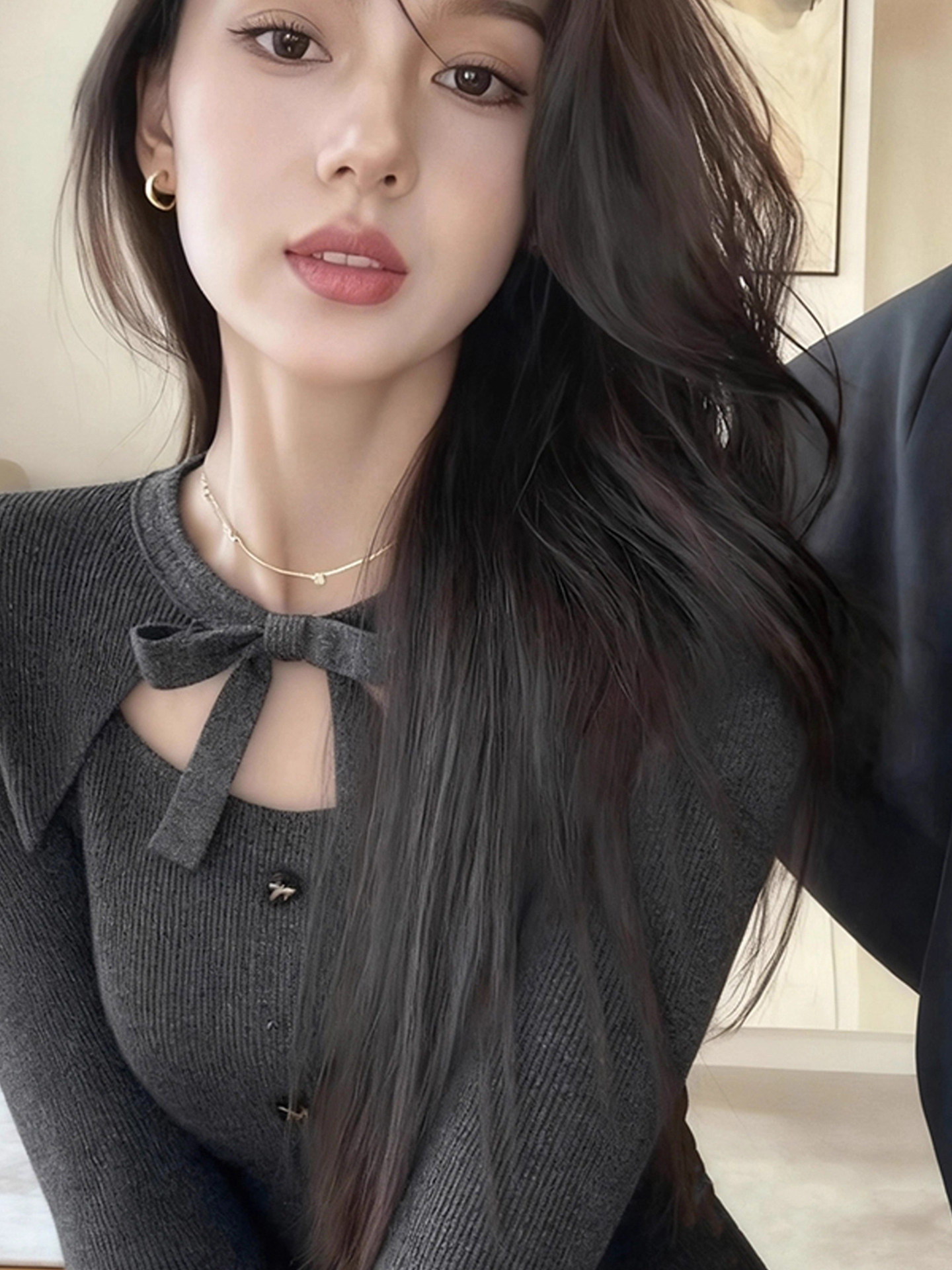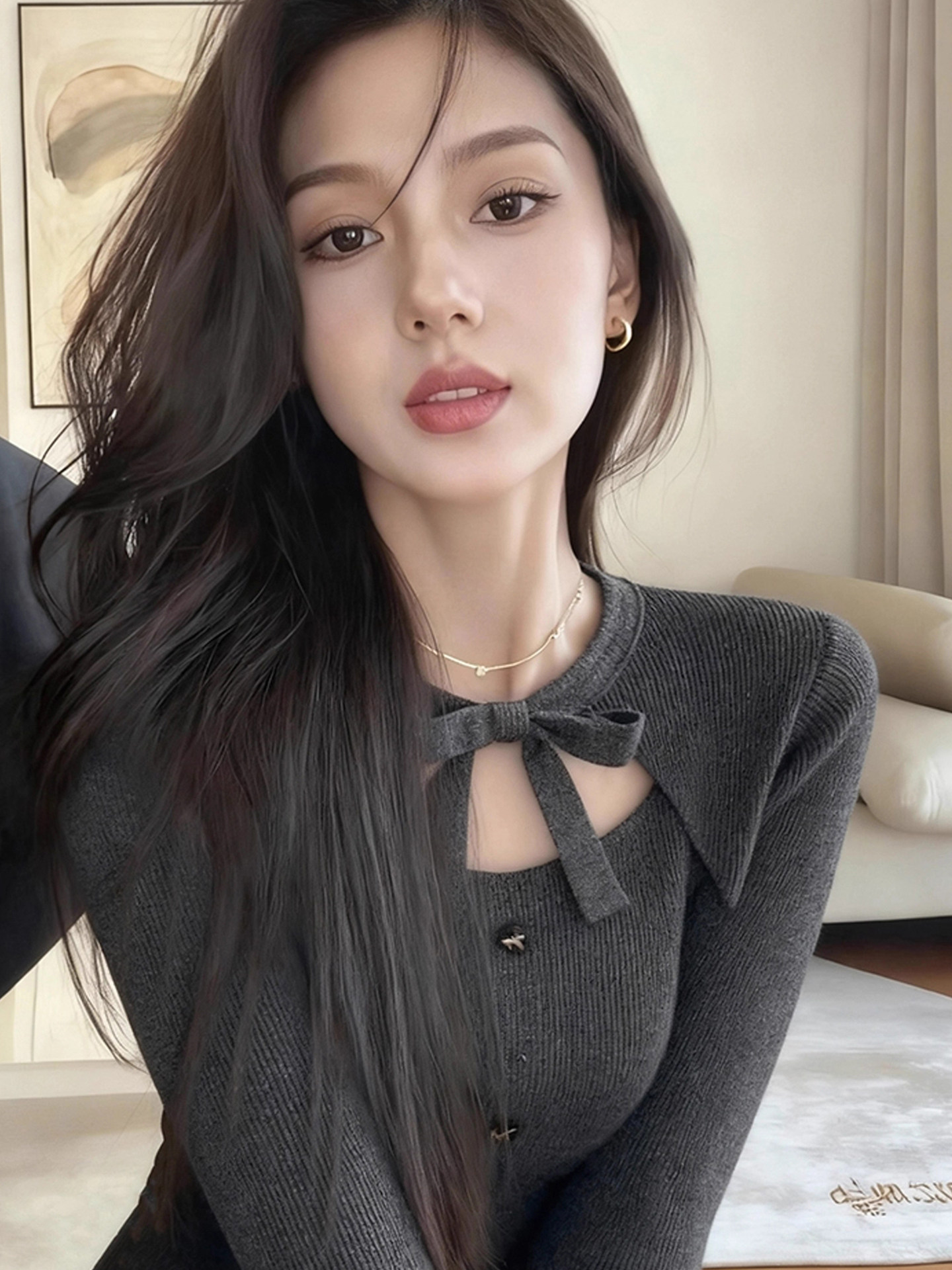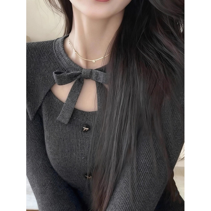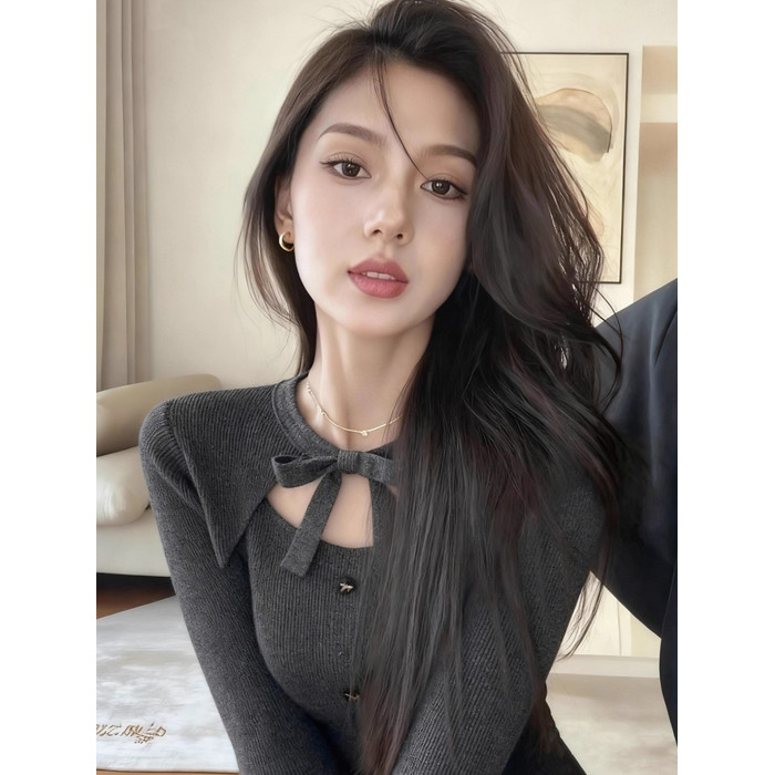 南油大牌女裝2025秋冬高級感上衣獨特漂亮灰色蝴蝶結領針織衫