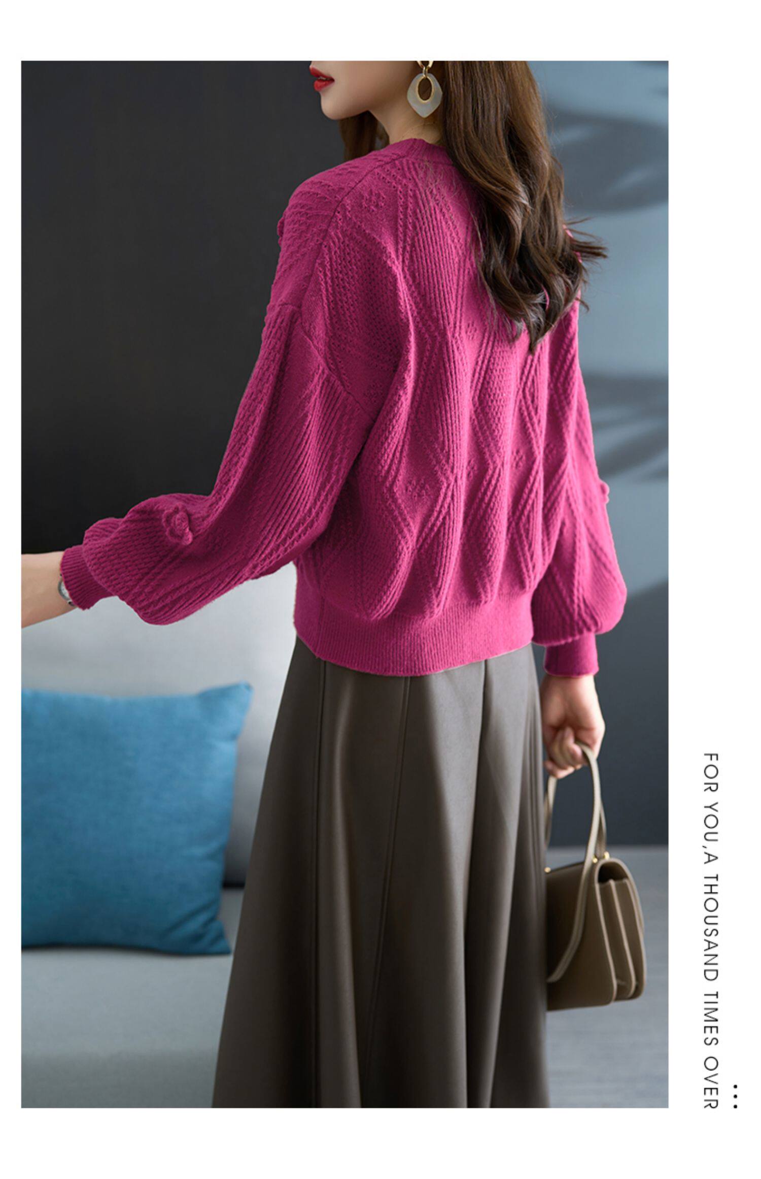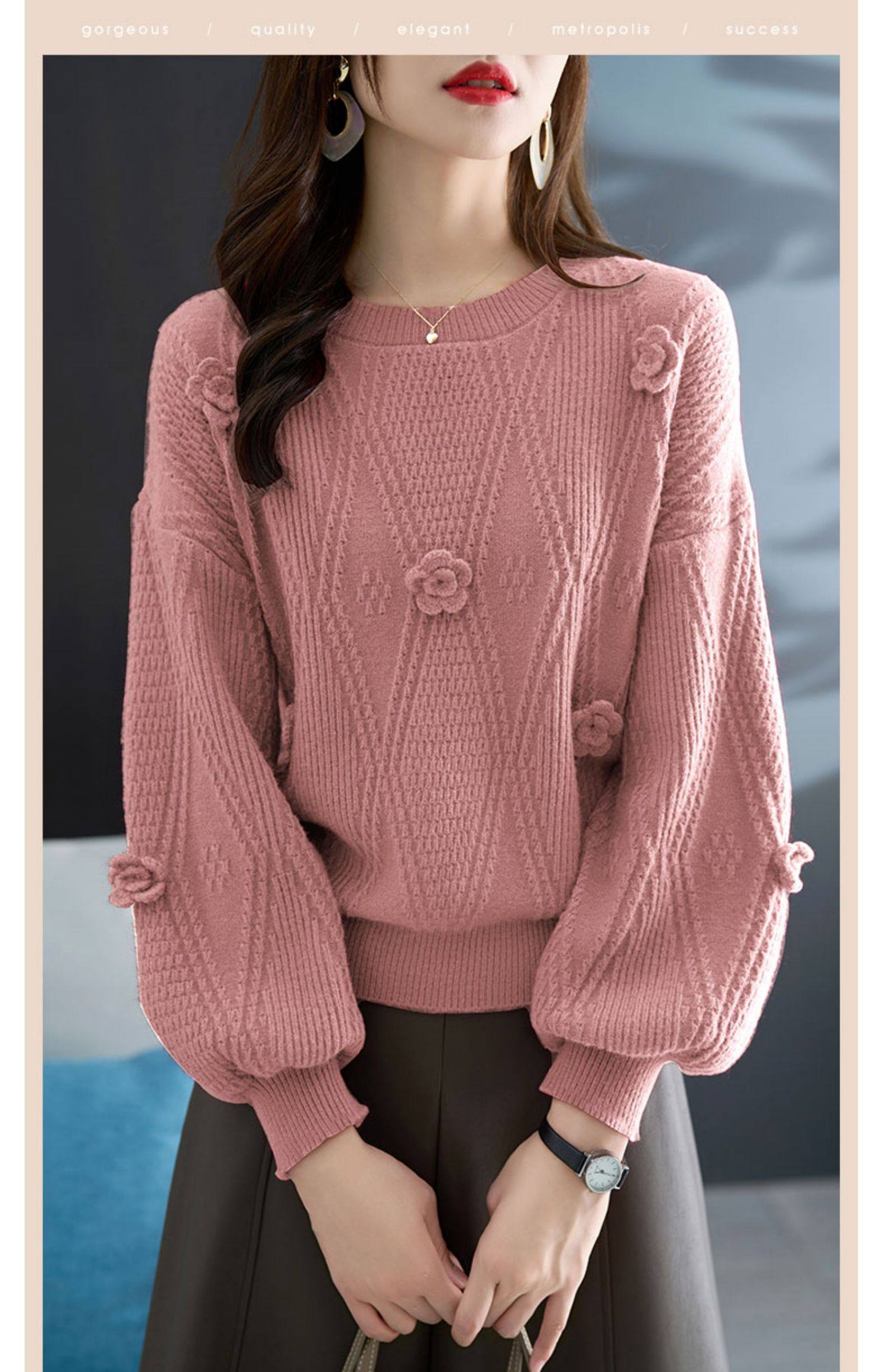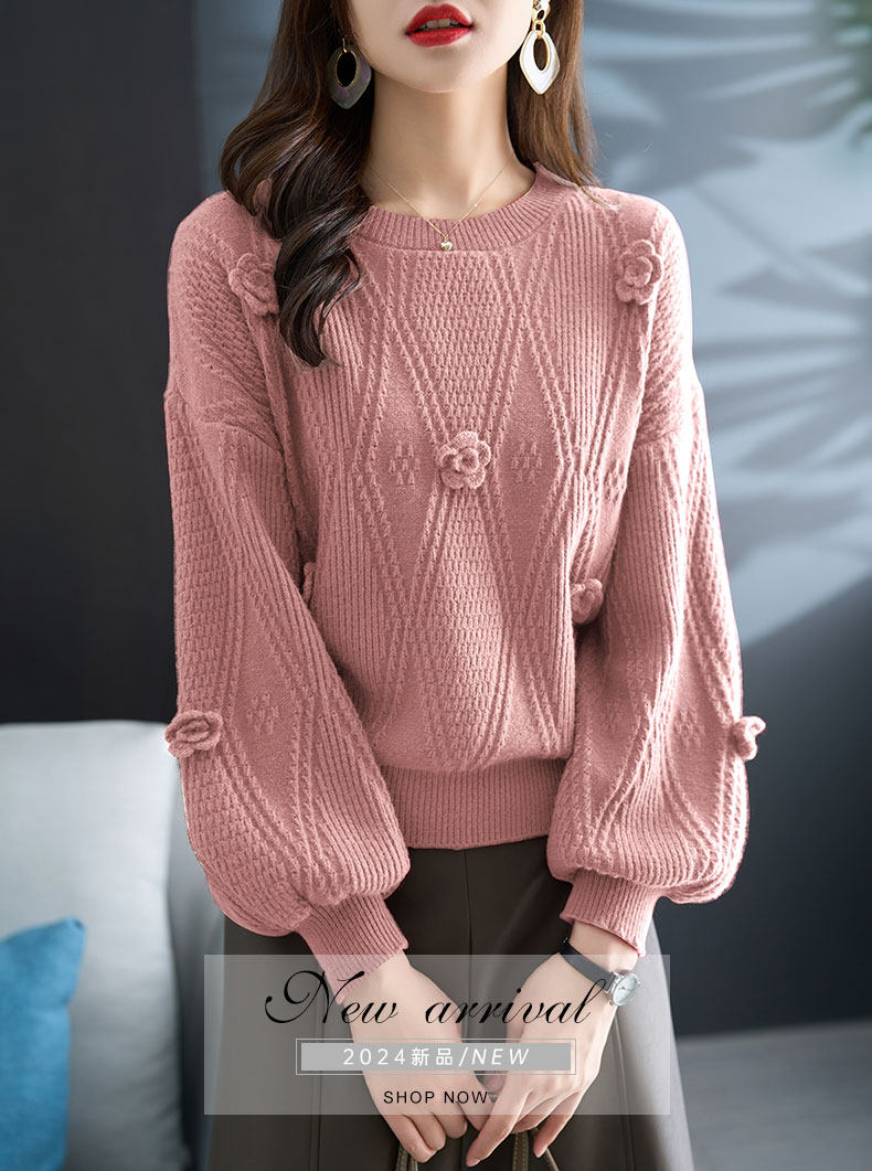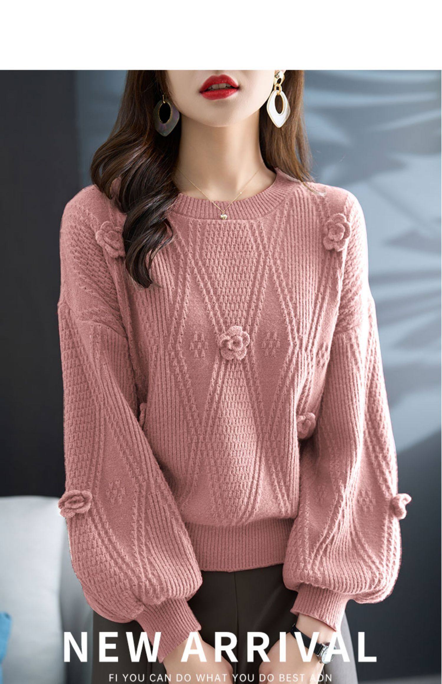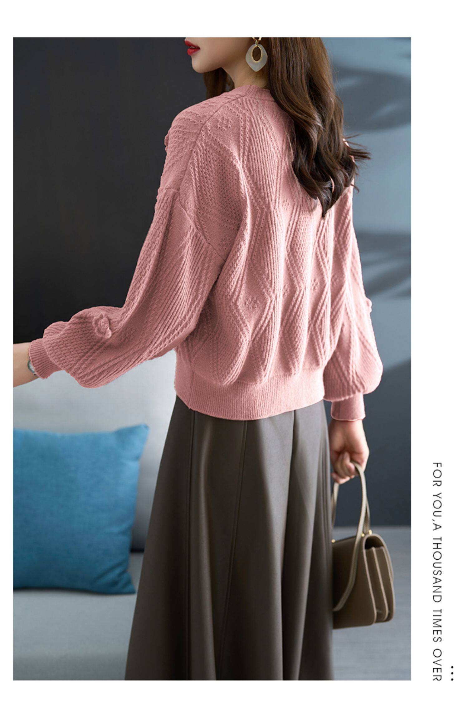 圓領針織衫上衣女秋冬胖mm寬松遮肚子燈籠袖超好看粉色毛衣打底衫