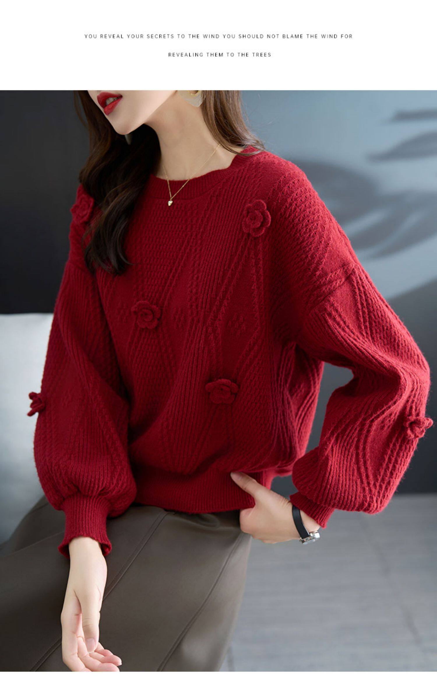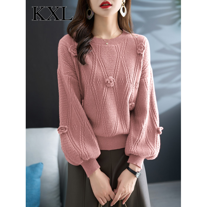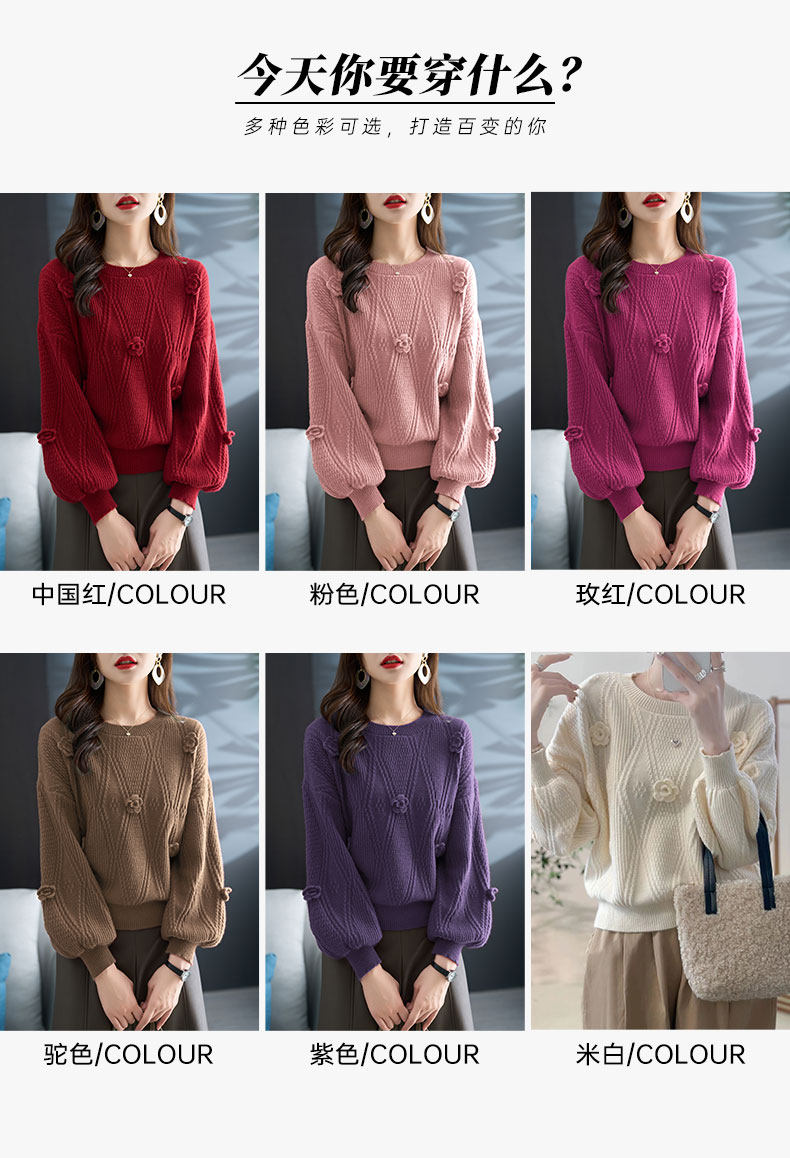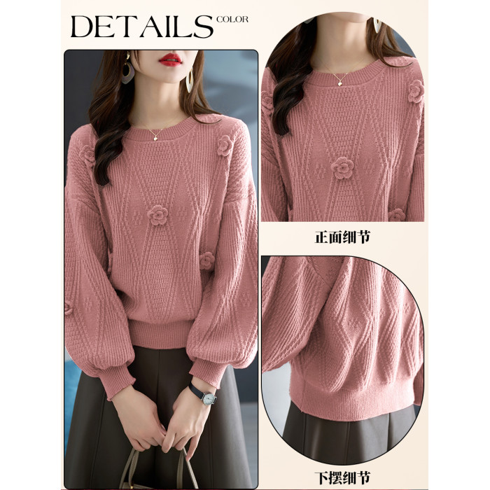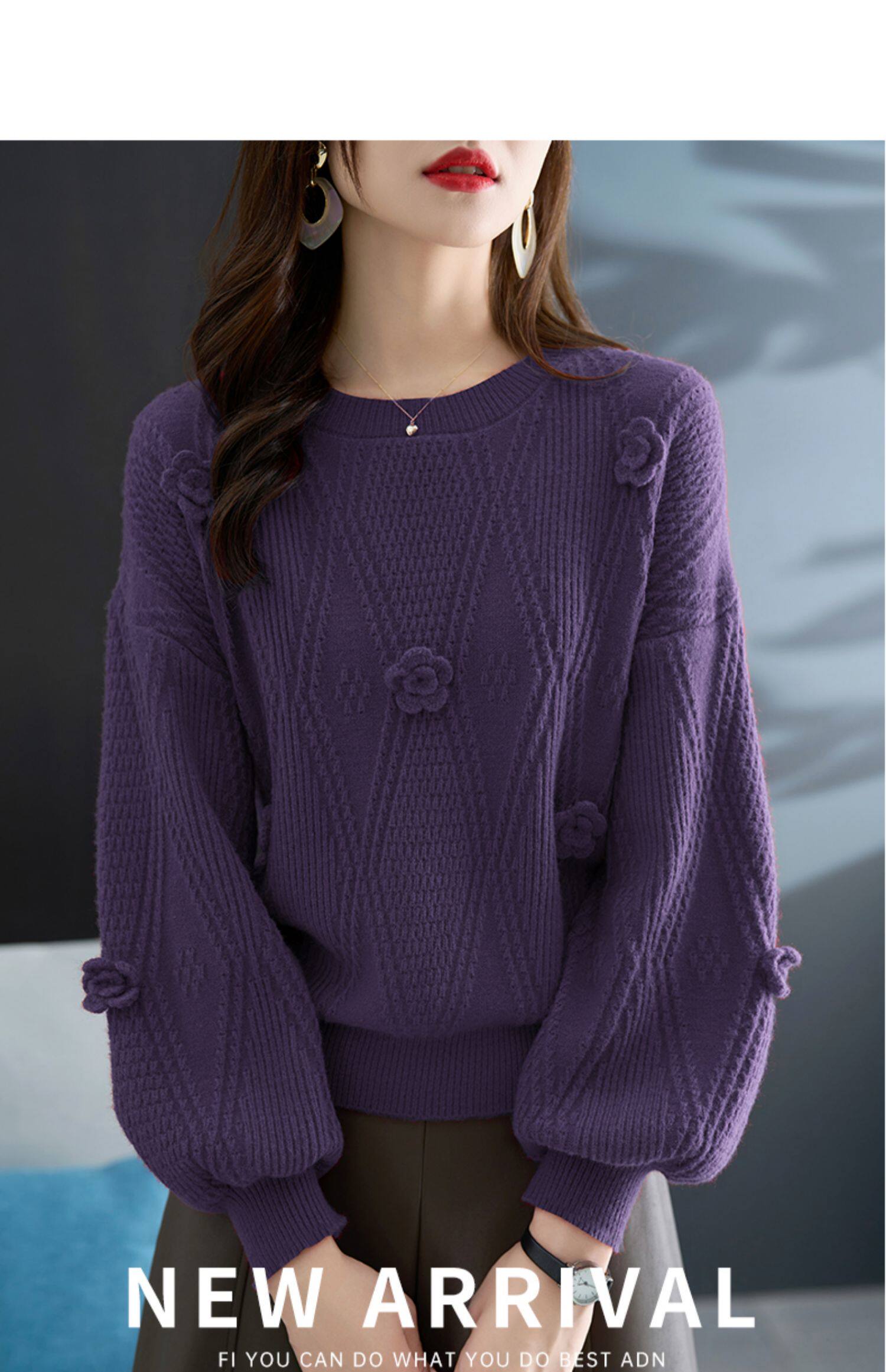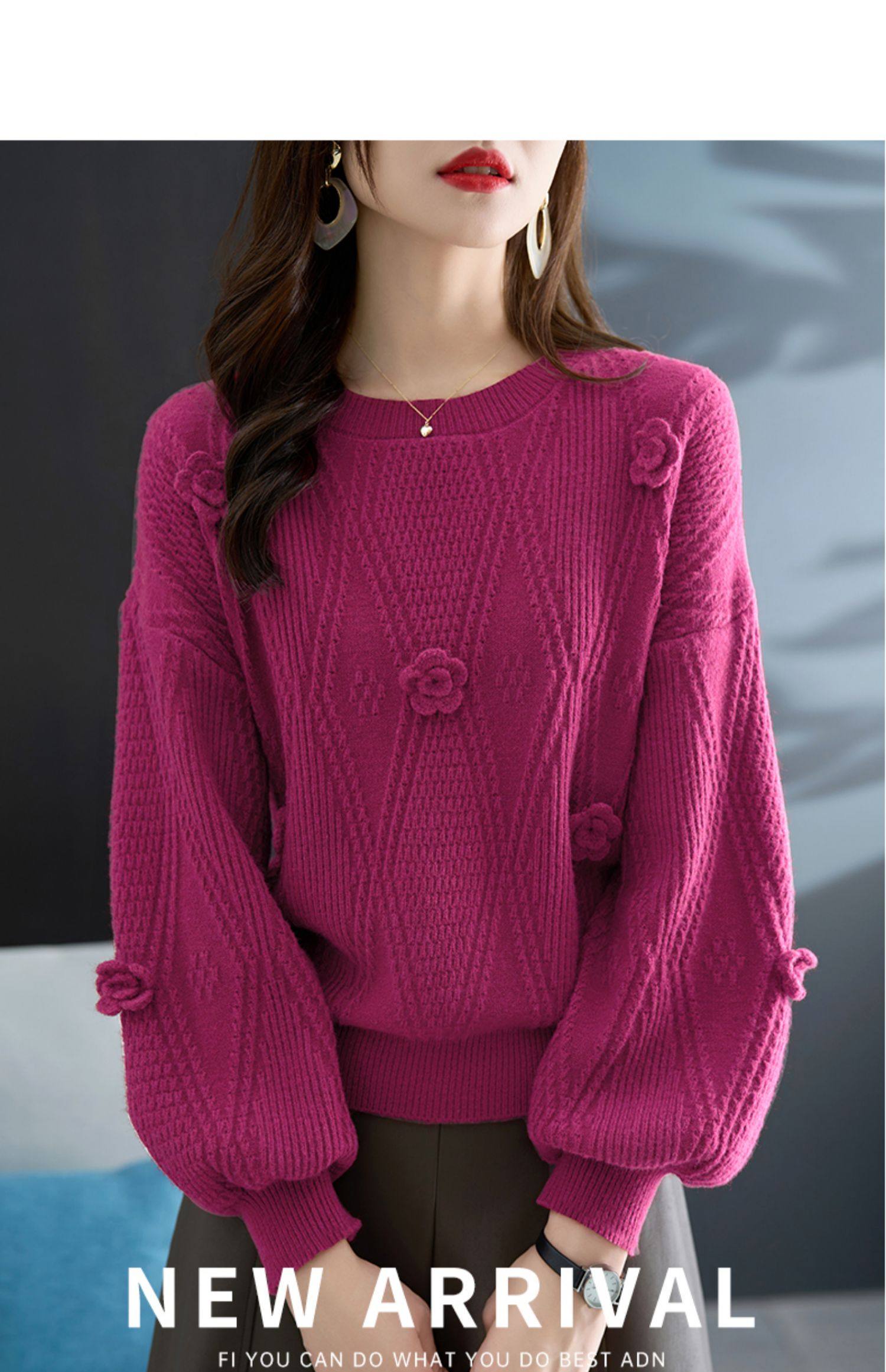 圓領針織衫上衣女秋冬胖mm寬松遮肚子燈籠袖超好看粉色毛衣打底衫